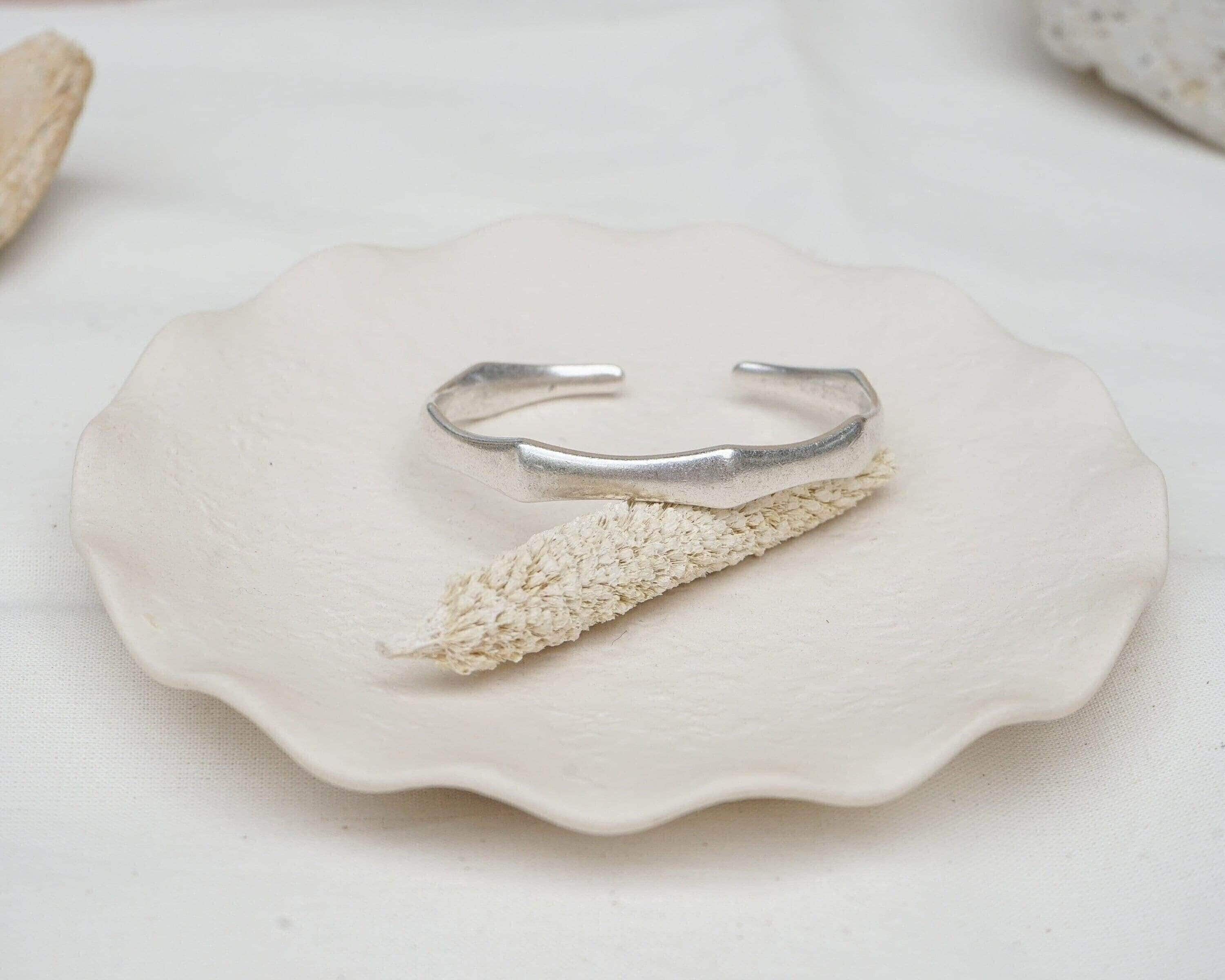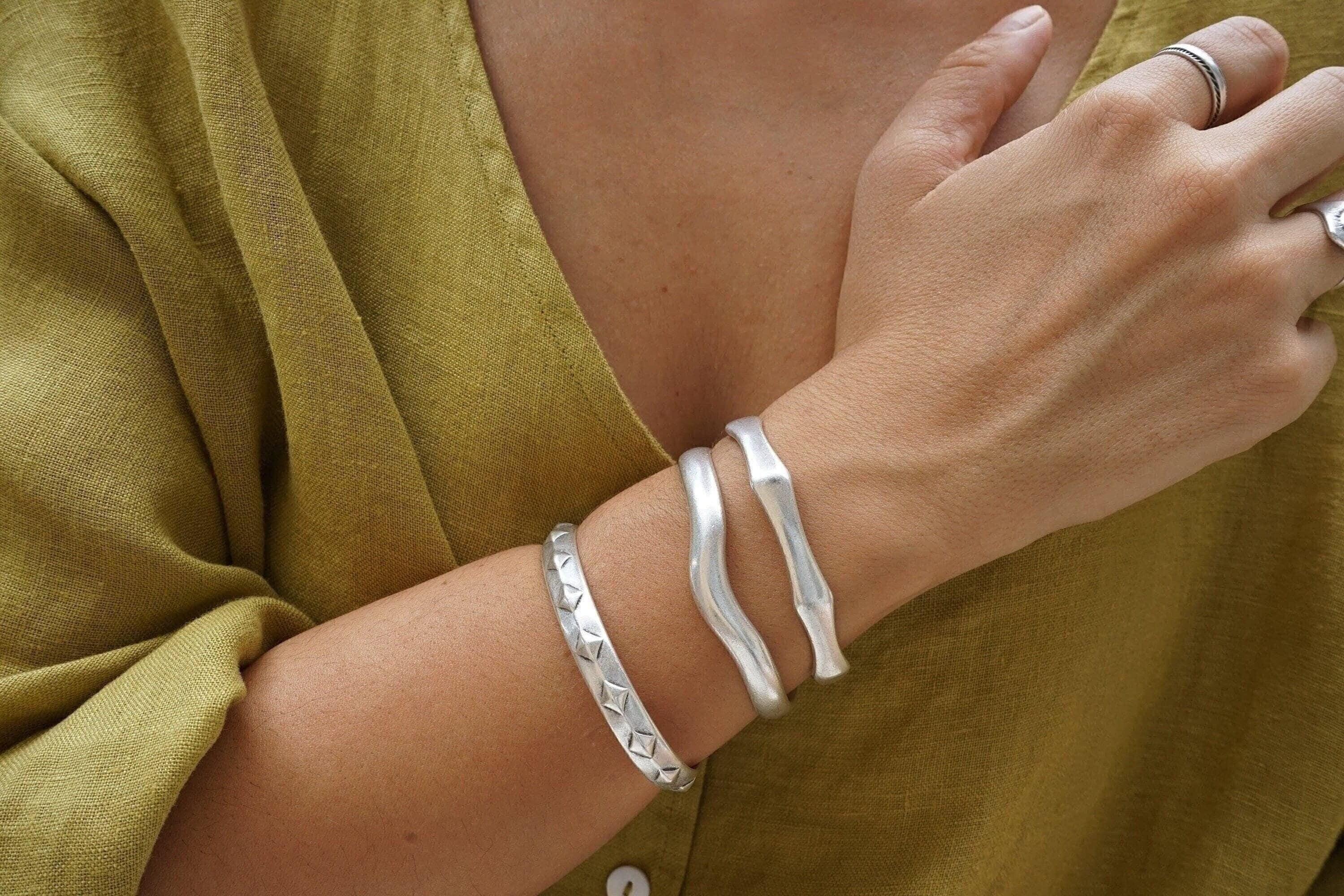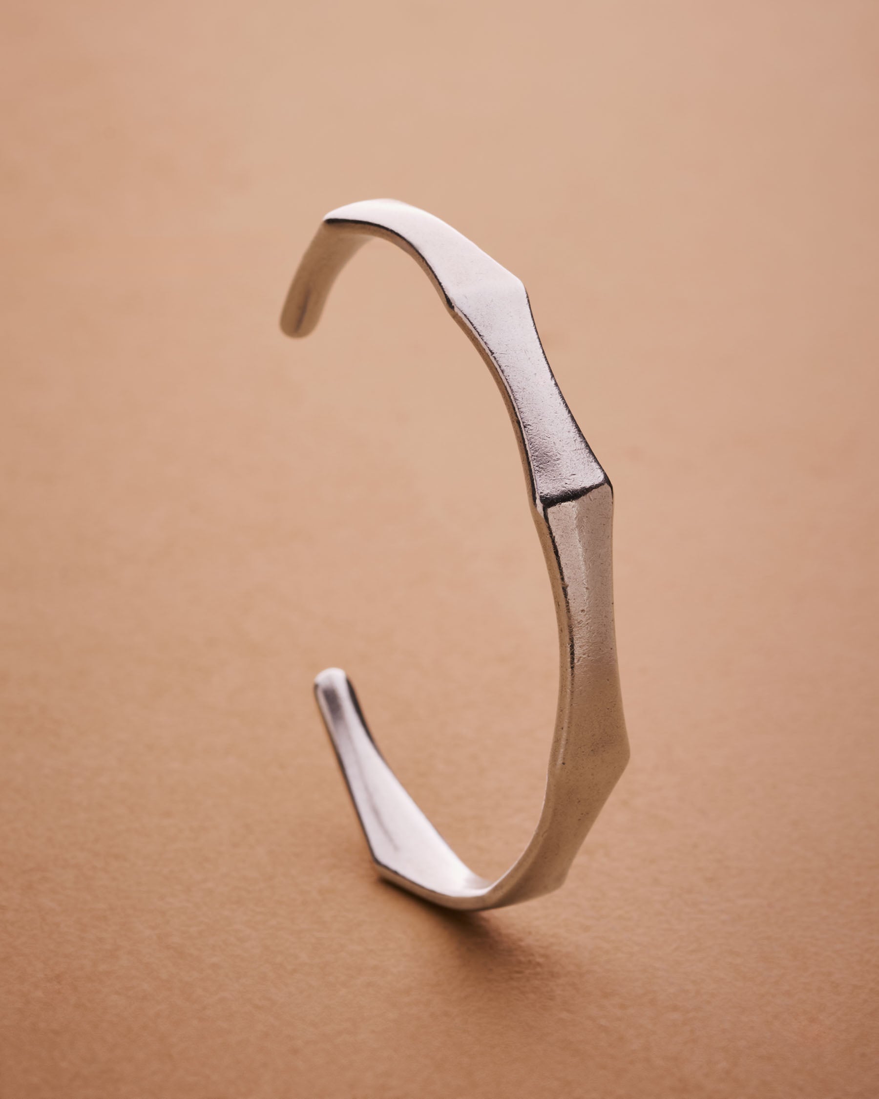 This silver-plated cuff bracelet, crafted with an antique vintage look, features a striking bold angular shape. Its timeless design makes it a versatile piece, perfect for mixing and matching with other cuffs and bangles. It pairs beautifully with our best-selling hammered bracelet, creating a stunning and cohesive accessory set.