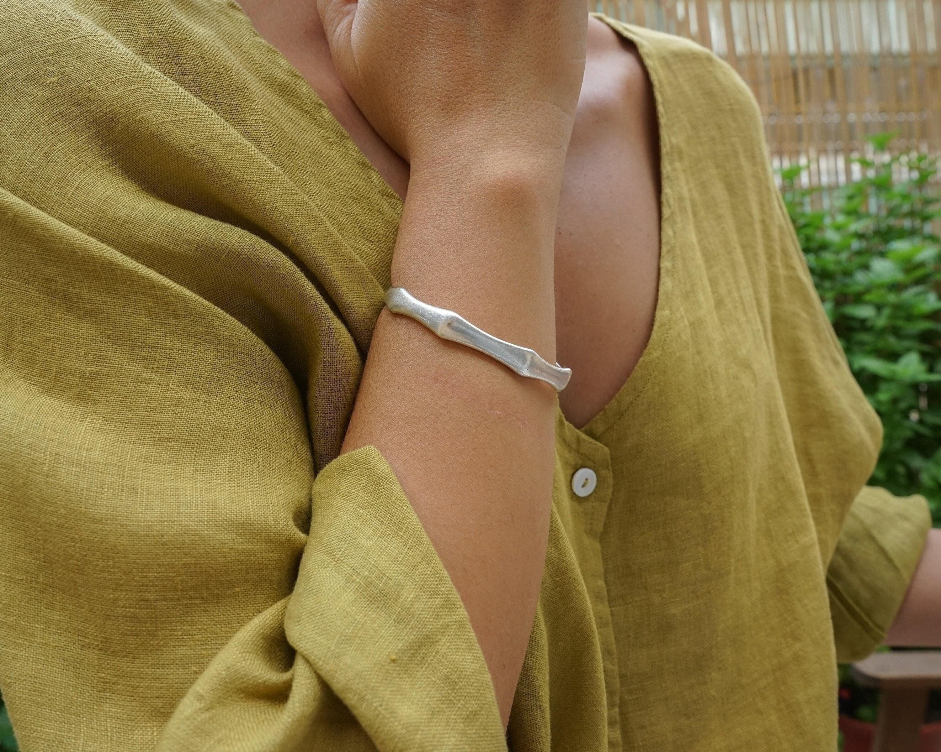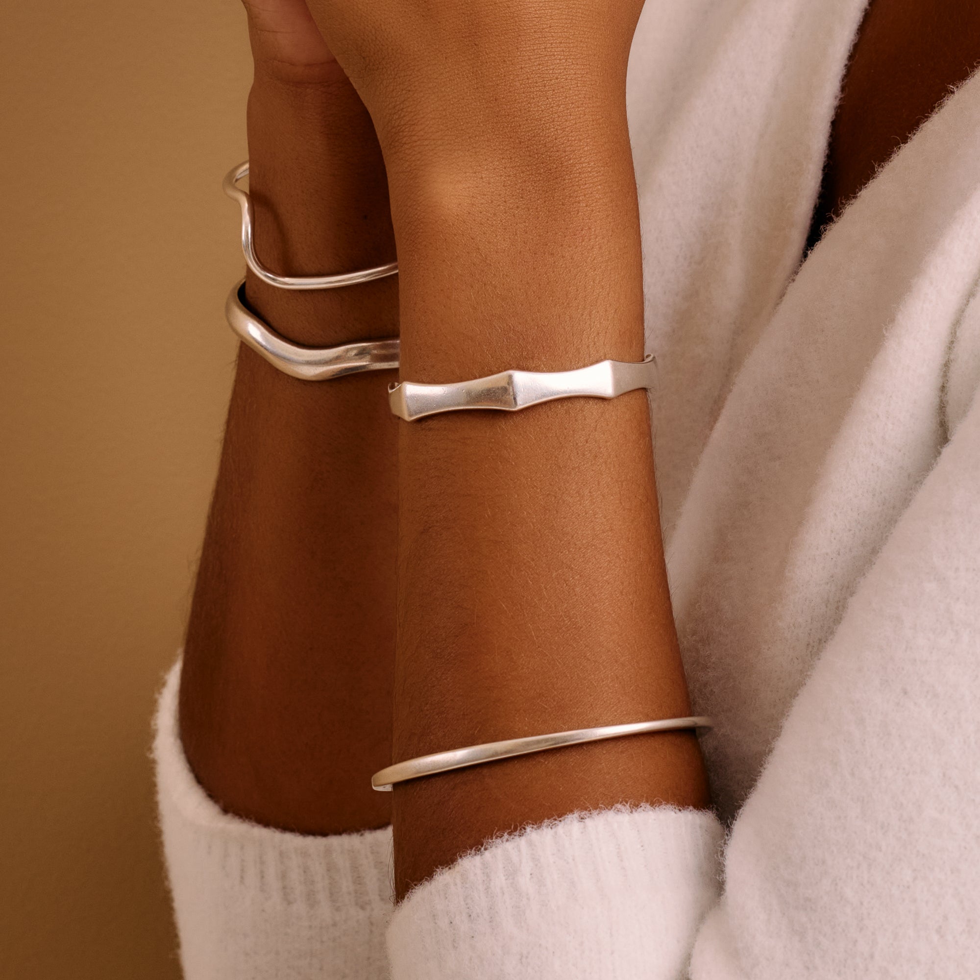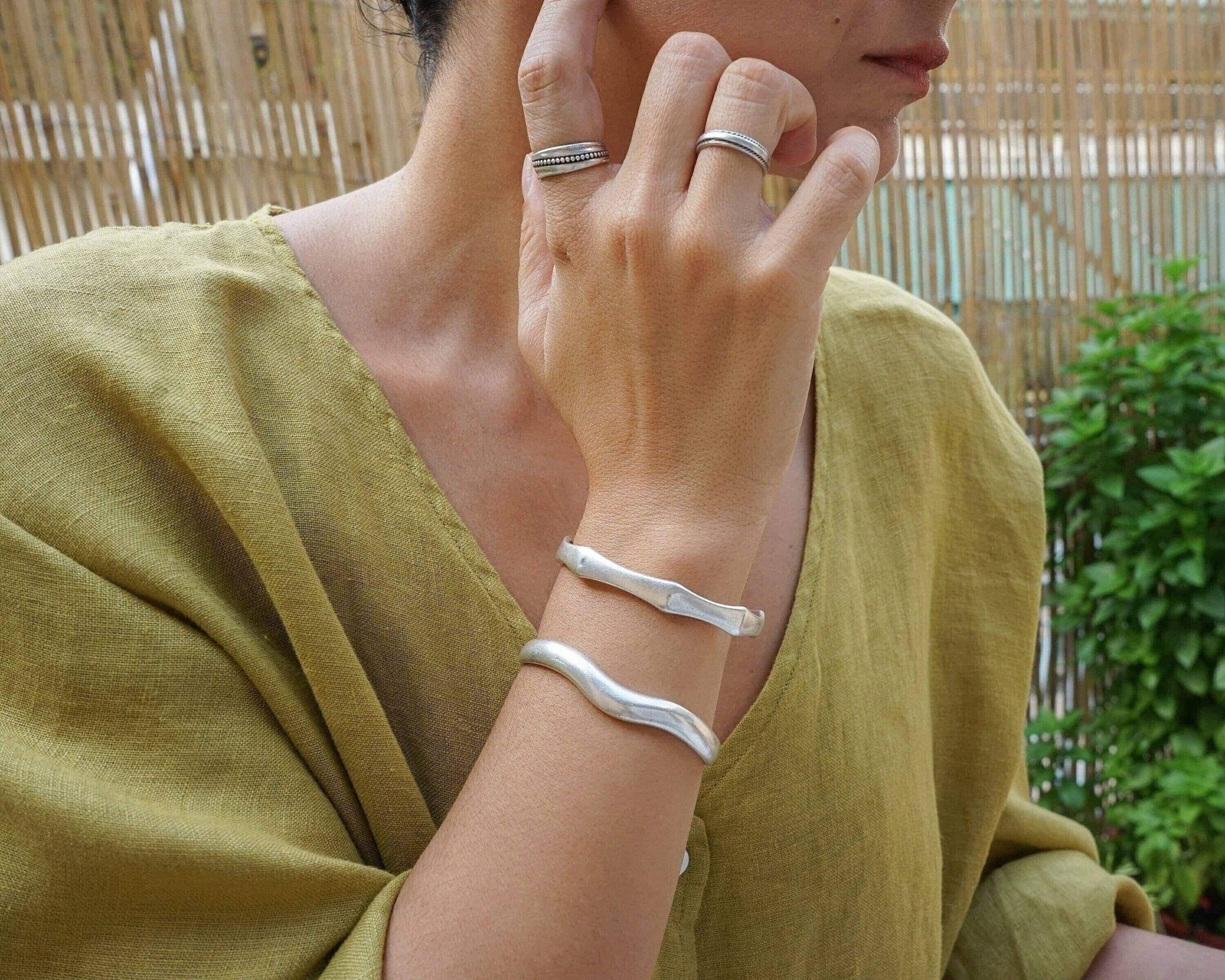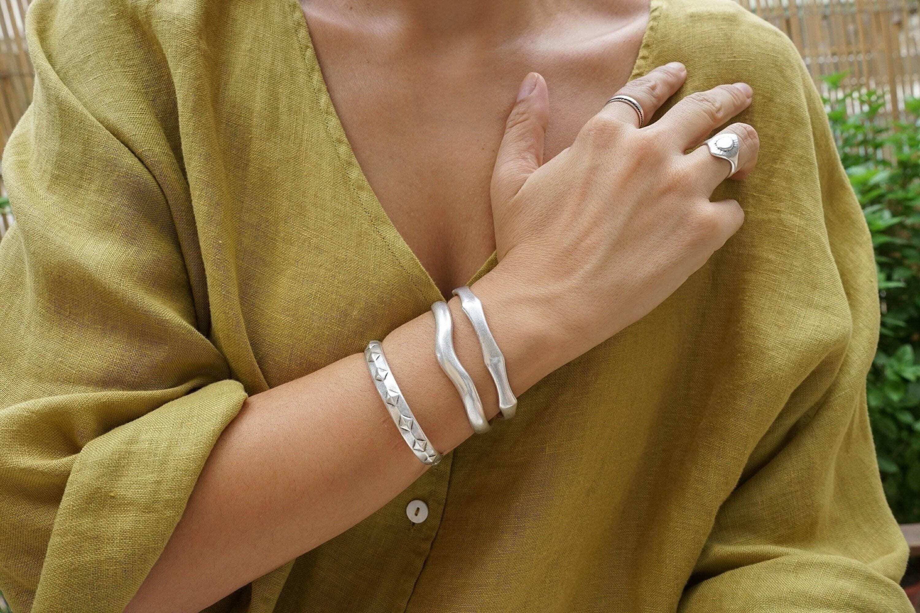 This silver-plated cuff bracelet, crafted with an antique vintage look, features a striking bold angular shape. Its timeless design makes it a versatile piece, perfect for mixing and matching with other cuffs and bangles. It pairs beautifully with our best-selling hammered bracelet, creating a stunning and cohesive accessory set.