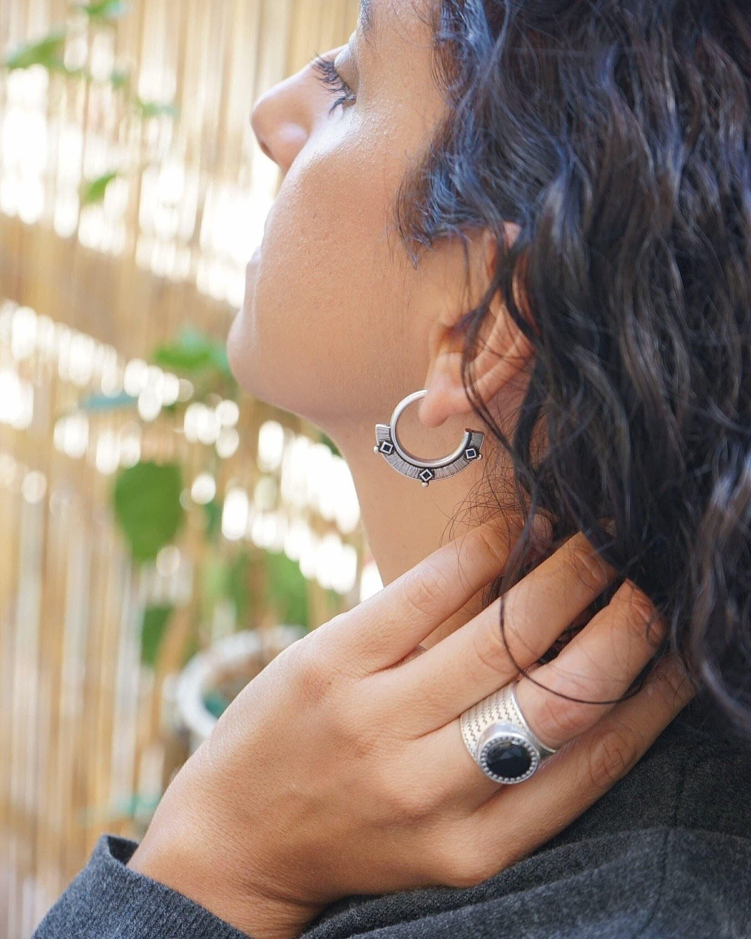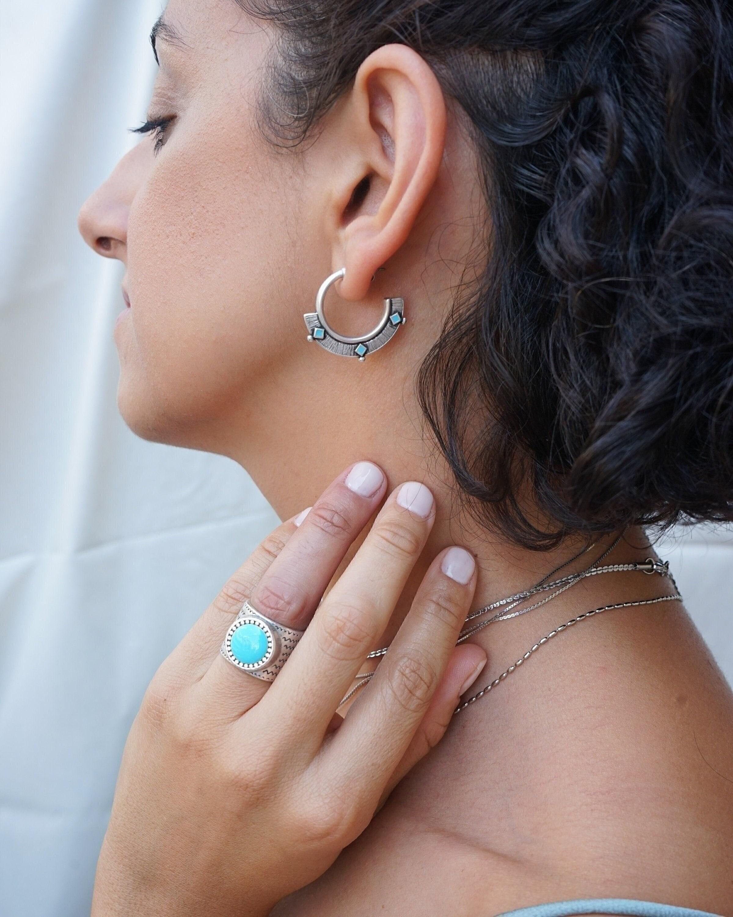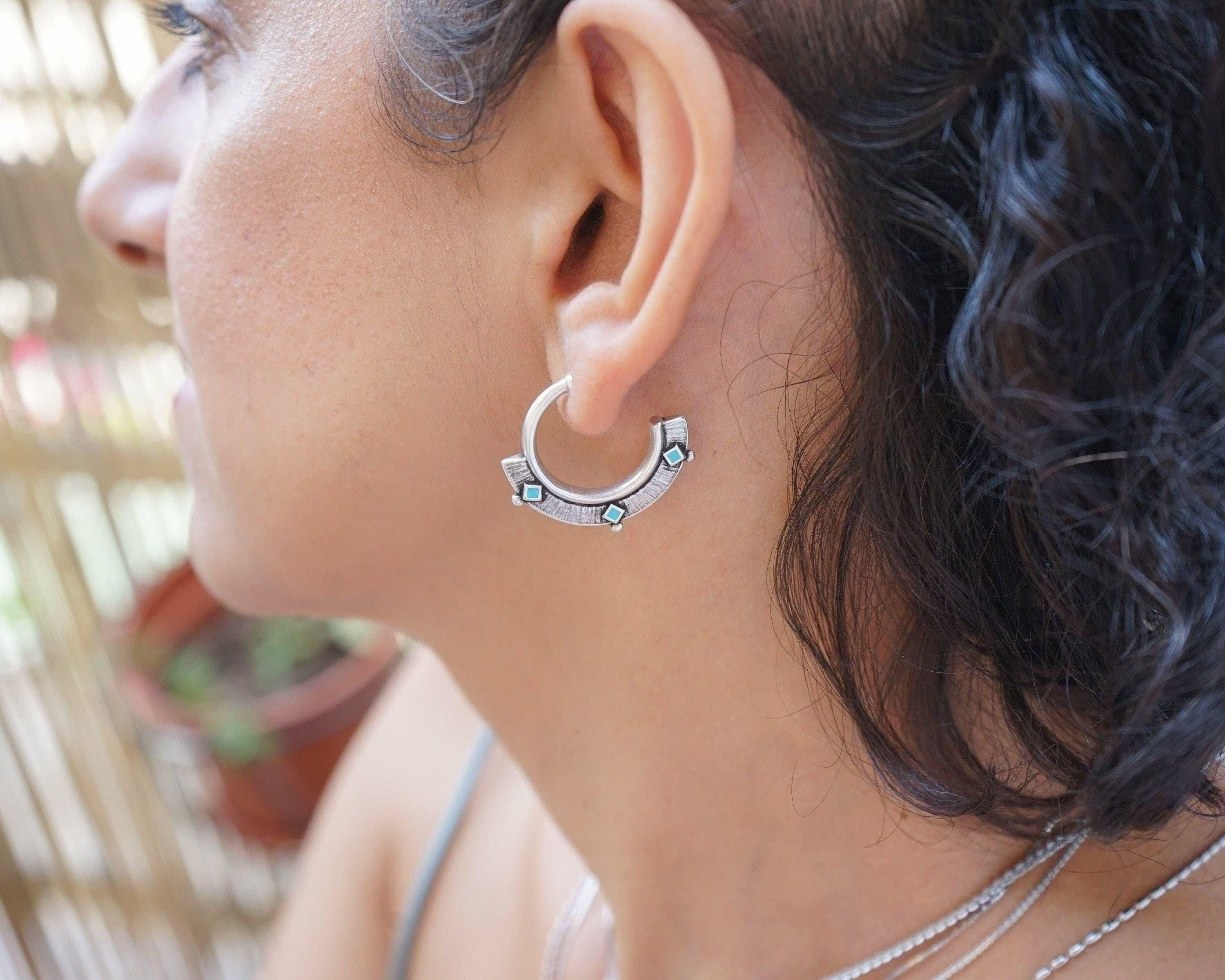 Add an ethnic touch to any ensemble with these exquisite dangling hoop earrings. Available in two sizes and colors - black and turquoise - these tribal-inspired jewelry pieces are effortlessly lightweight and comfortable to wear. Featuring unique and versatile silver hoops, they are perfect for transitioning from day to night and adding a boho flair to your style. Express your free spirit with an alternative yet elegant pair of earrings.