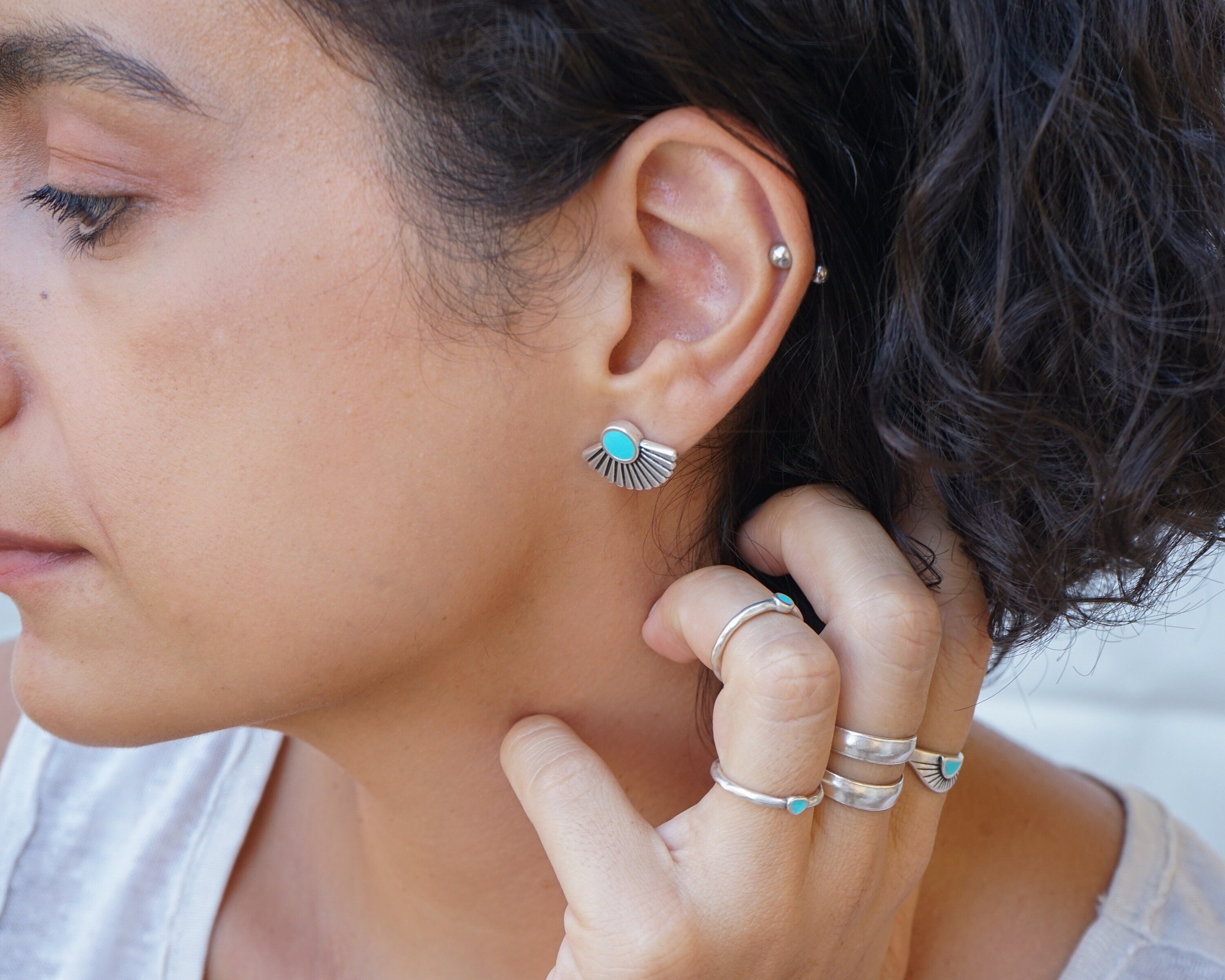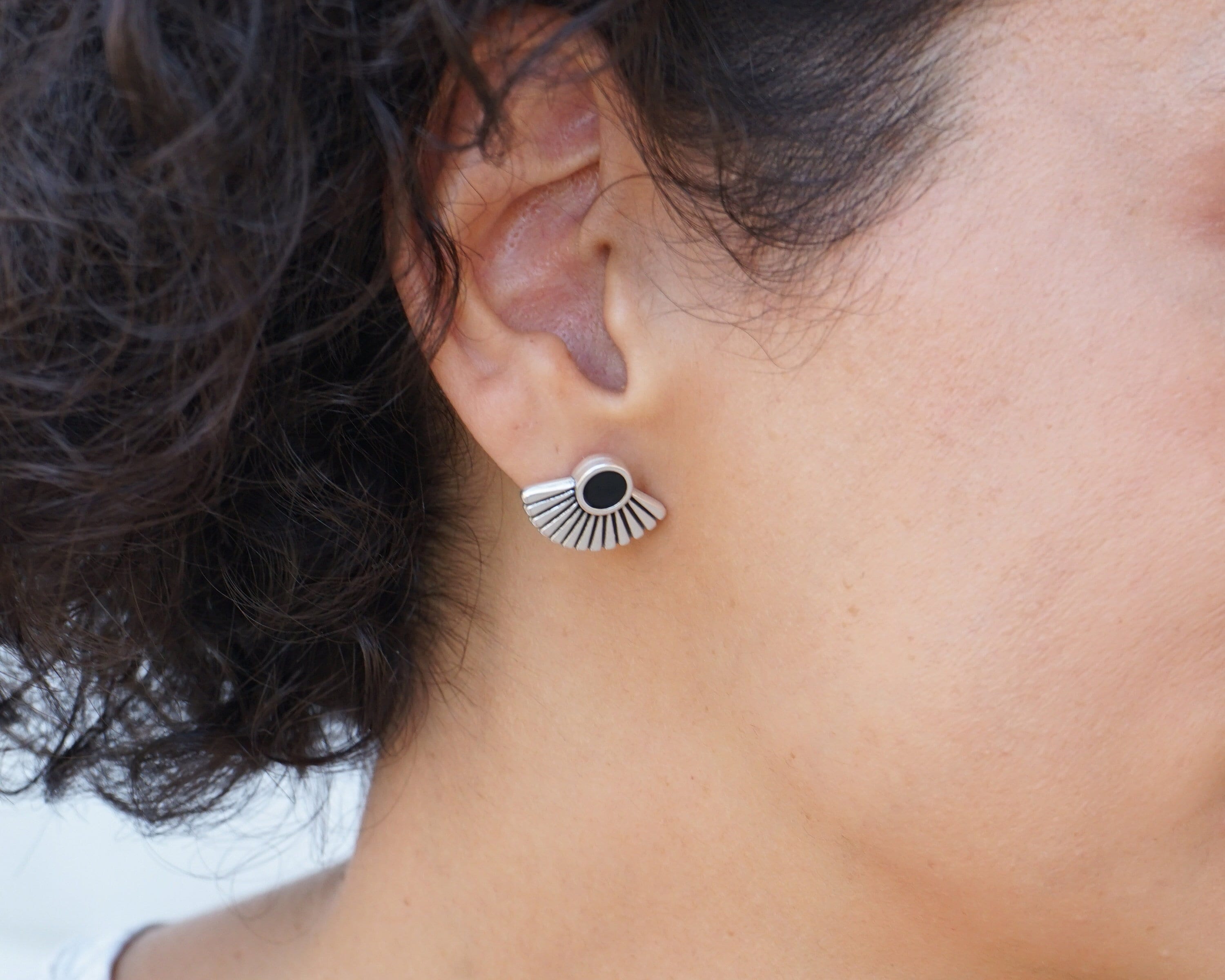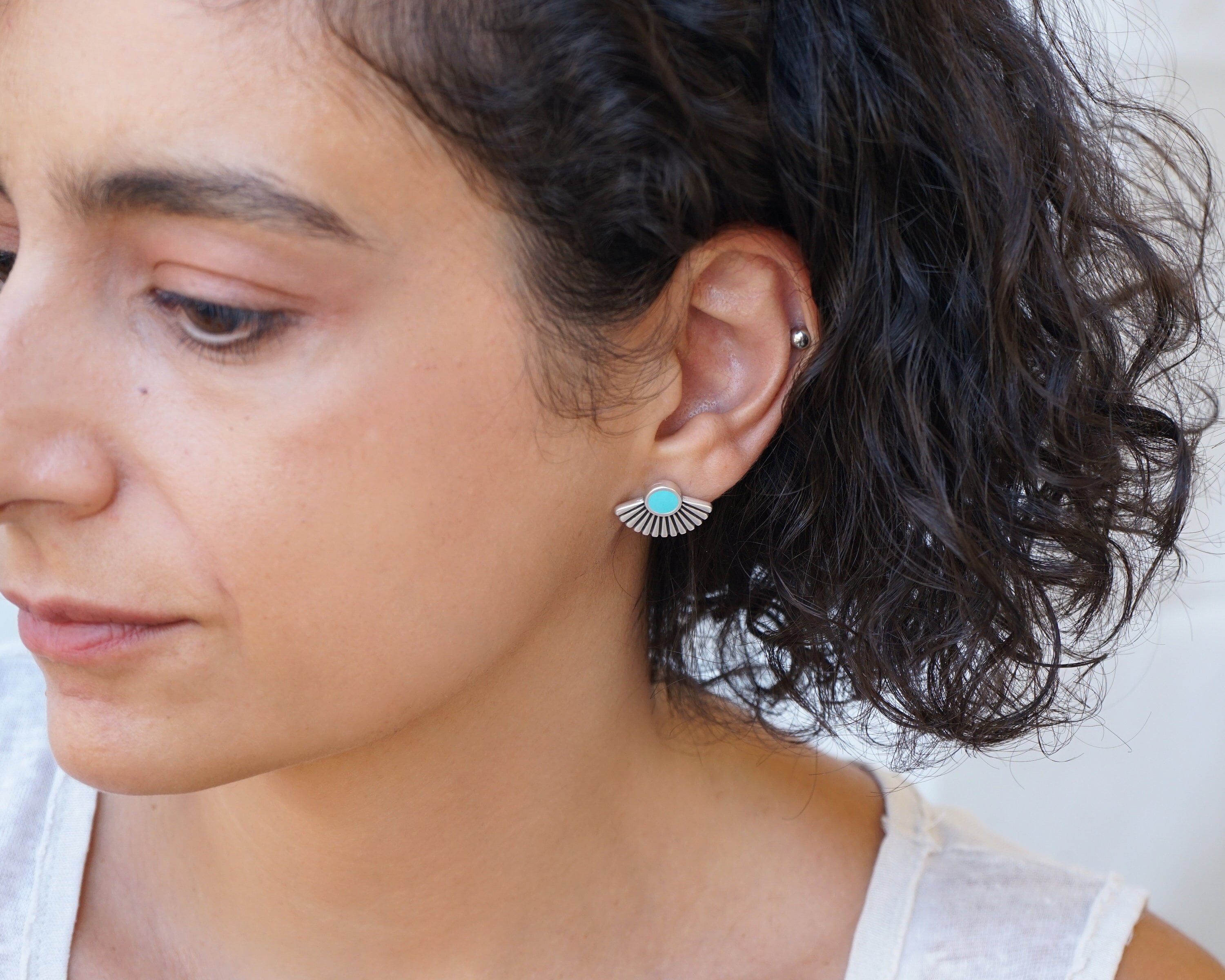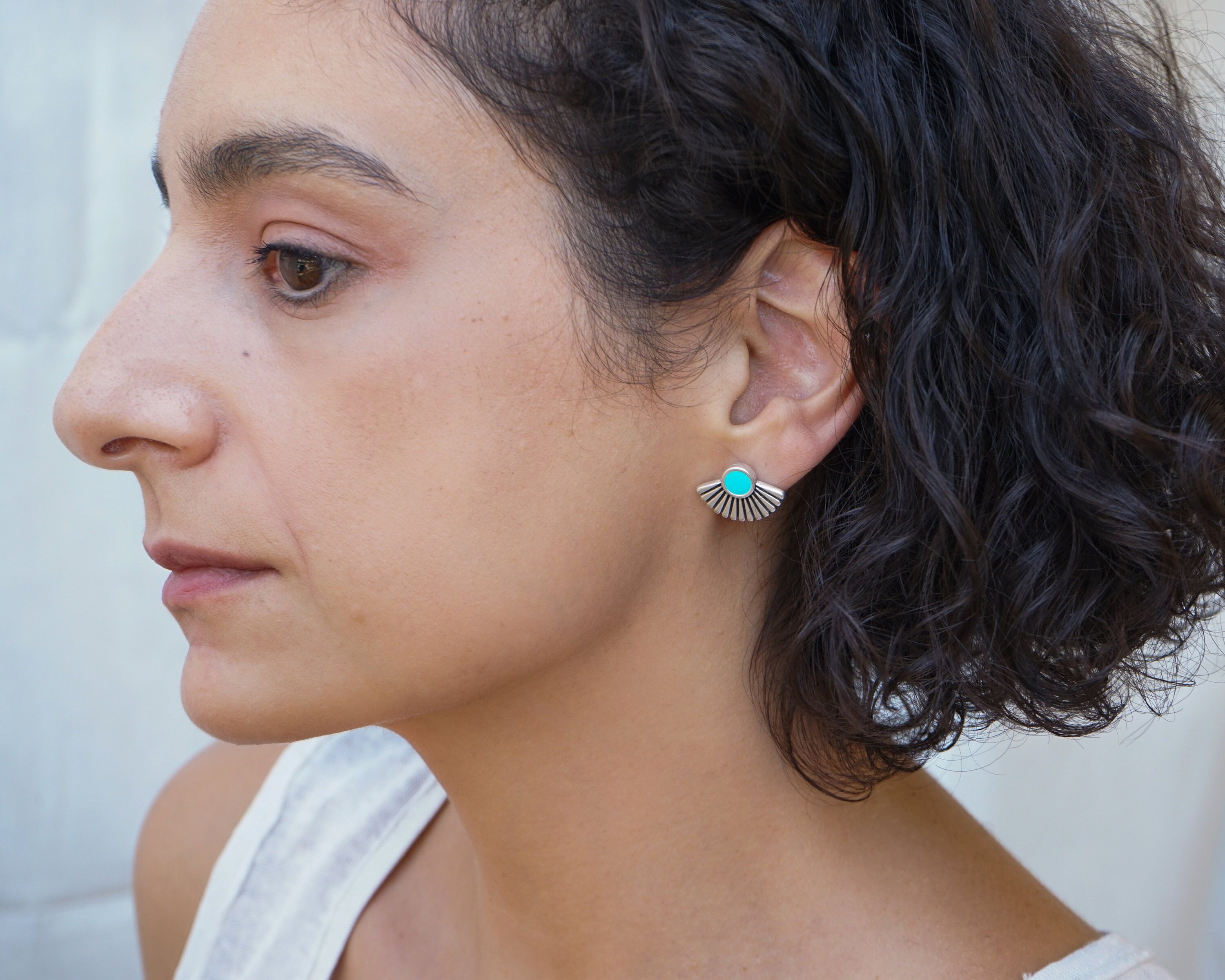Discover these elegant silver-plated stud earrings featuring a striking black and turquoise enamel sun rays design. This unique and stylish pair makes a fashion statement while remaining versatile enough for everyday wear. Lightweight and comfortable, they are designed to sit effortlessly on the earlobe without causing any discomfort.