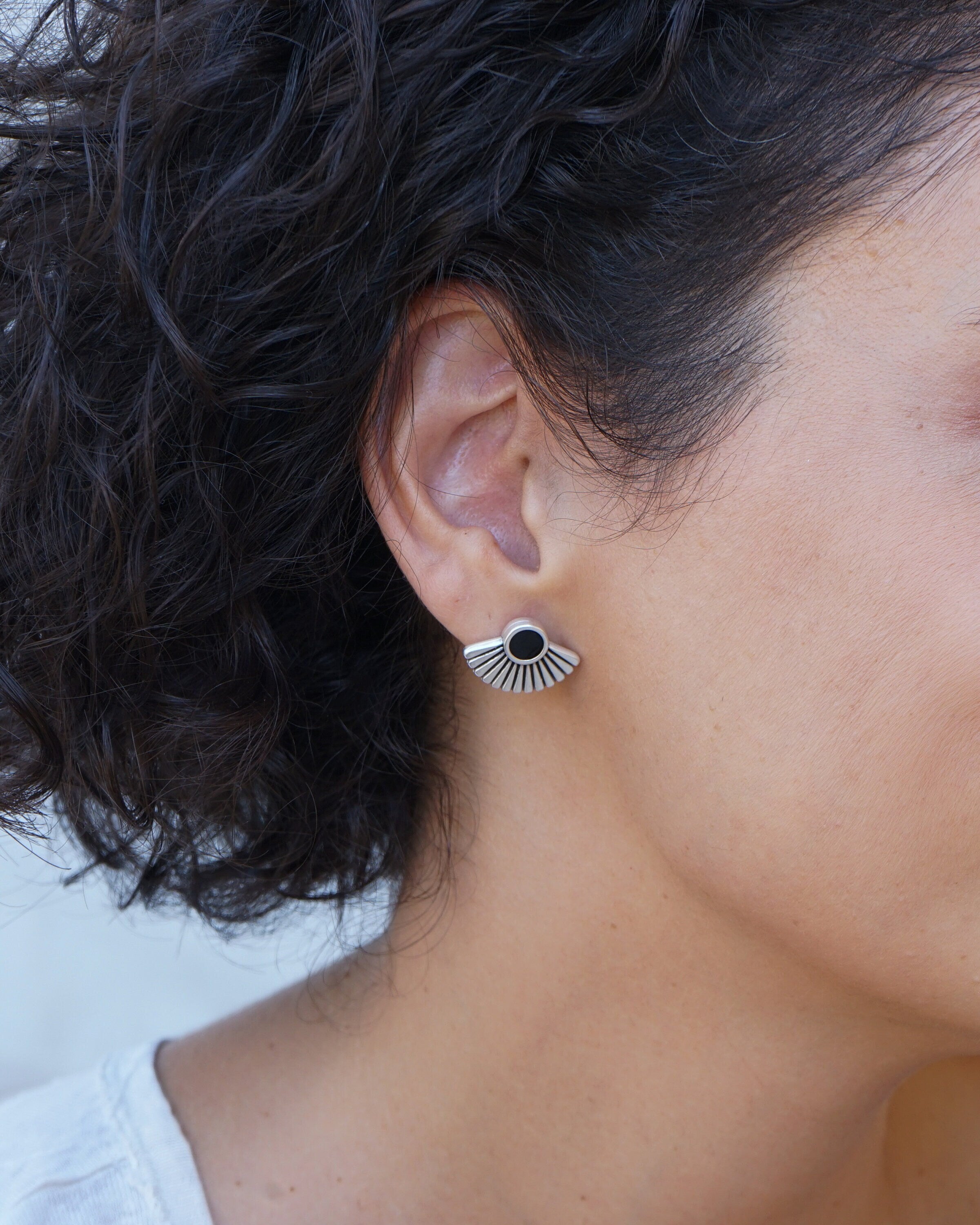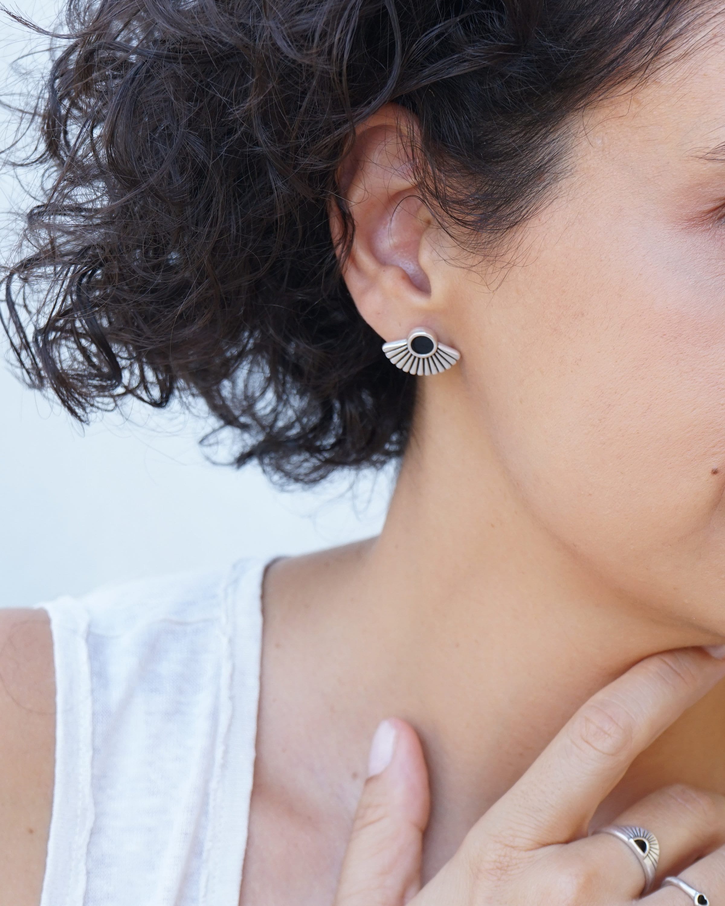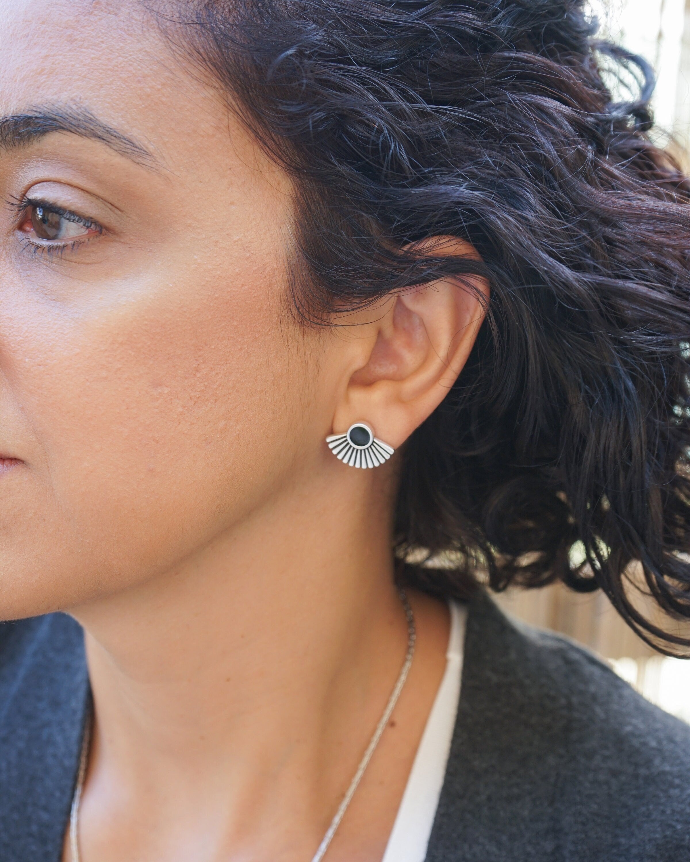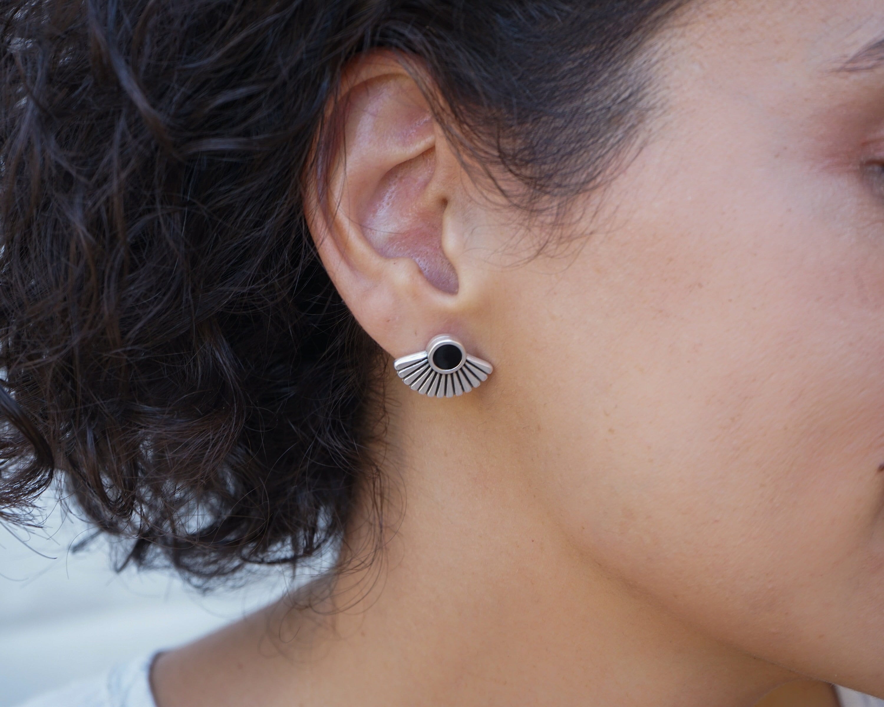 Discover these elegant silver-plated stud earrings featuring a striking black and turquoise enamel sun rays design. This unique and stylish pair makes a fashion statement while remaining versatile enough for everyday wear. Lightweight and comfortable, they are designed to sit effortlessly on the earlobe without causing any discomfort.