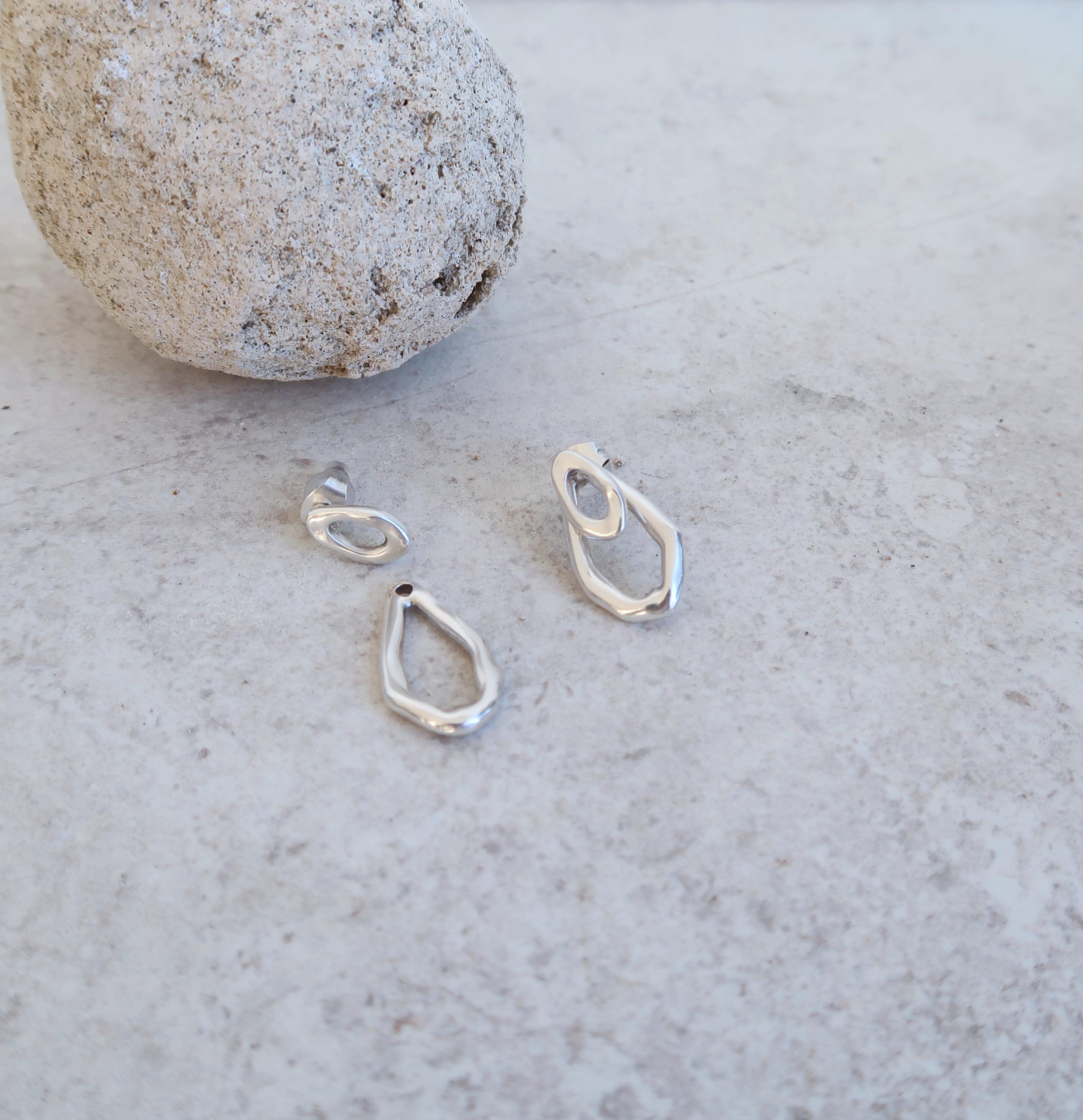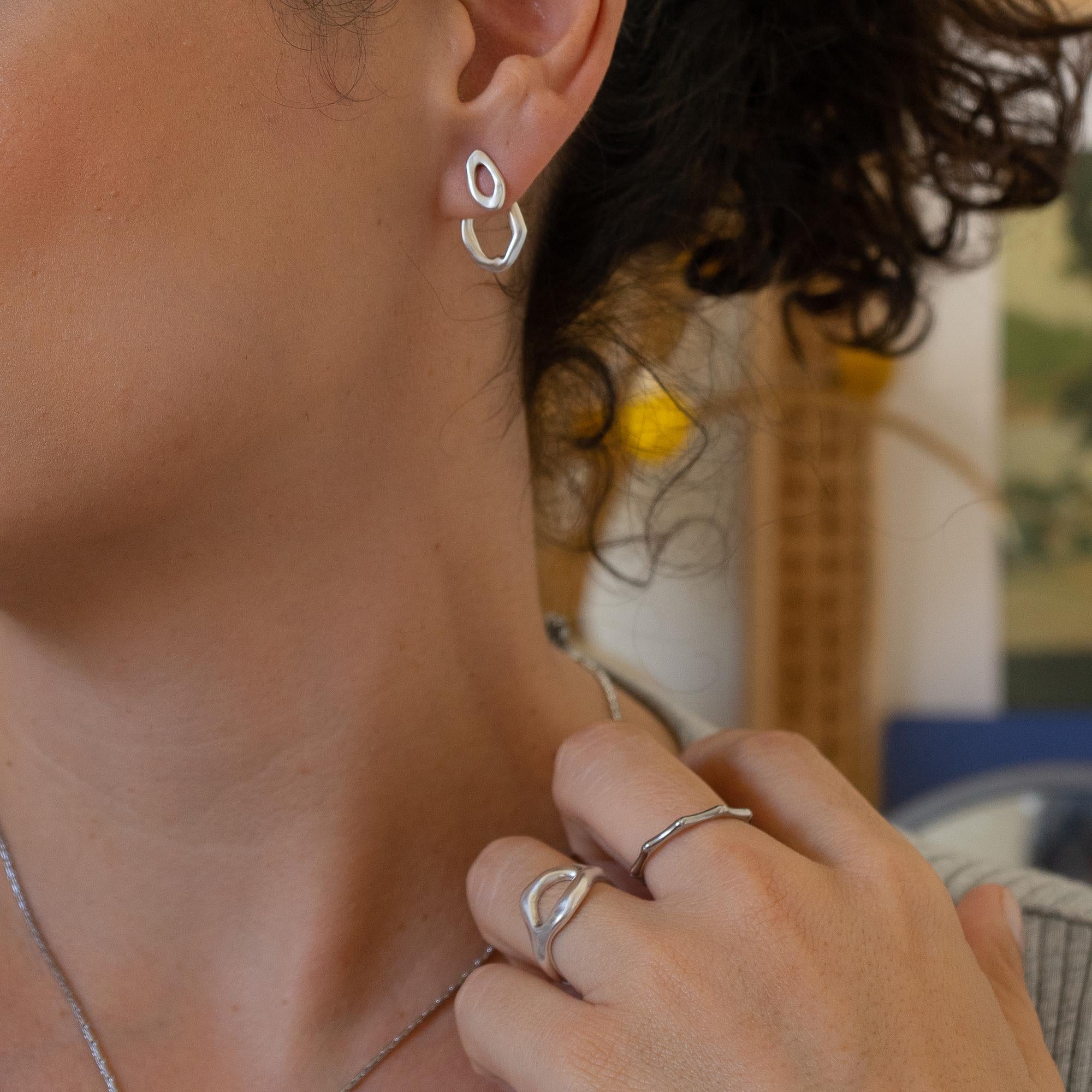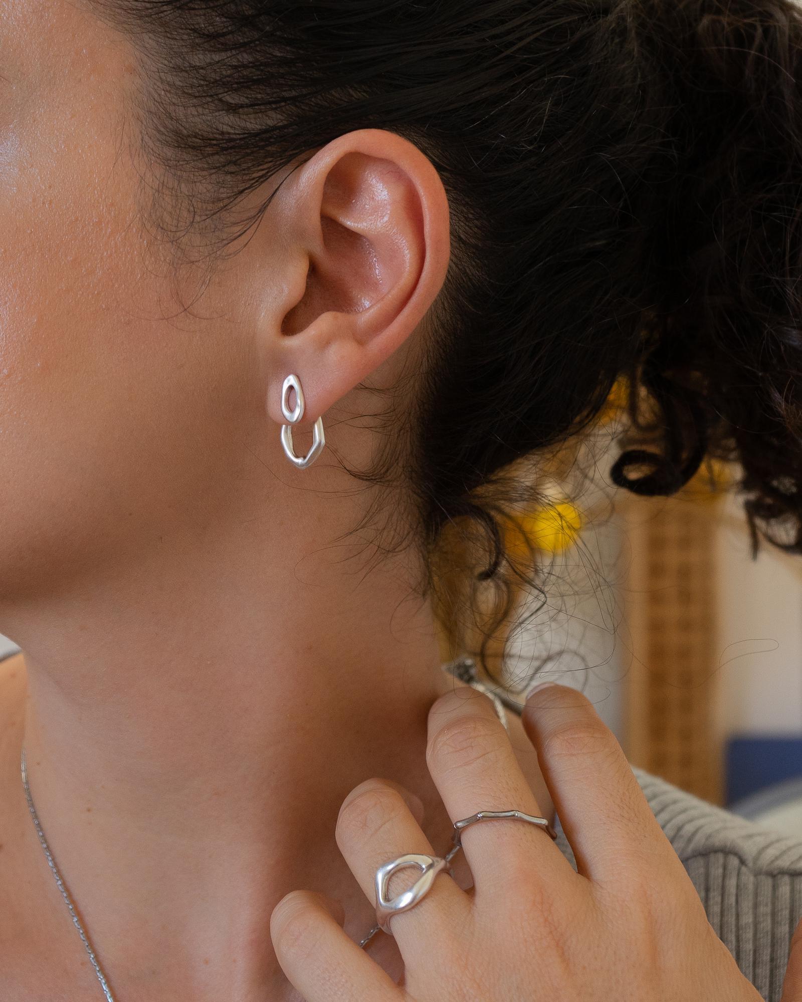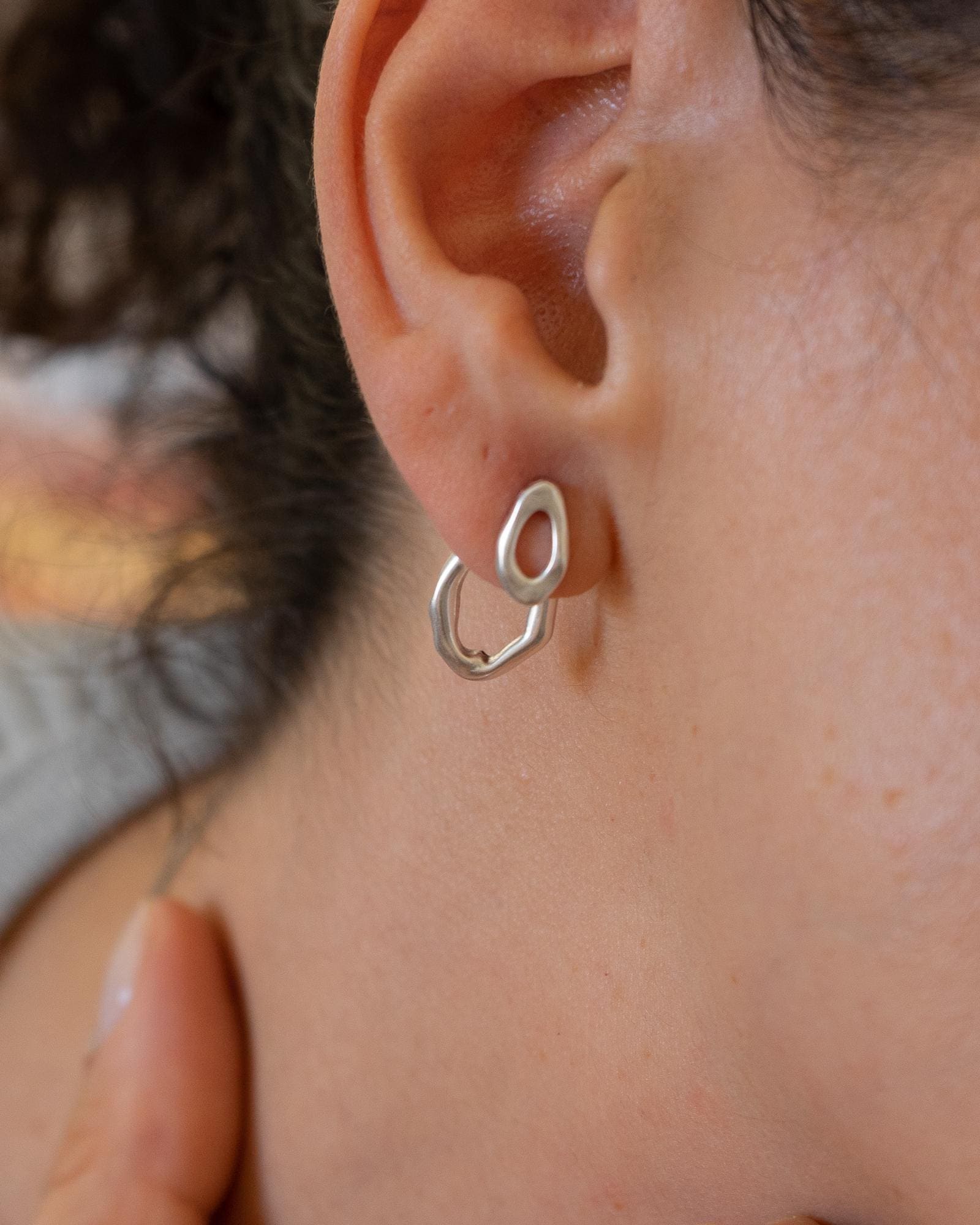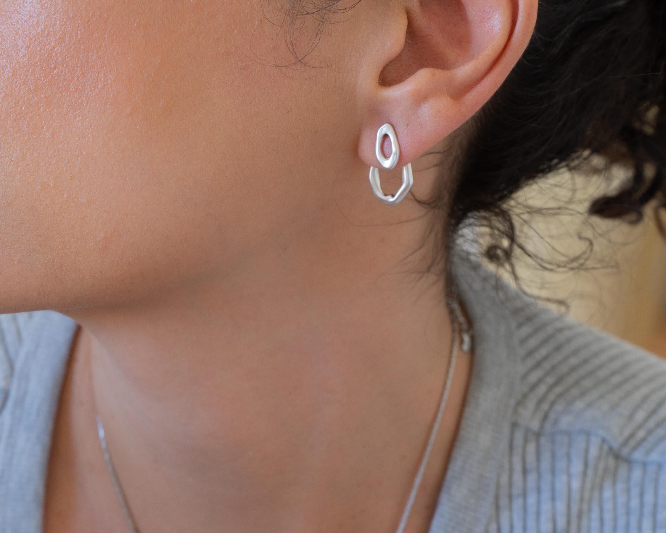 Discover the versatile beauty of these organic-shaped ear jackets that effortlessly combine elegance and trendiness. This unique set includes two pairs of earrings in one, allowing you to express your style in various ways. The ear jacket design is currently a sought-after accessory, perfect for those who appreciate special and meaningful jewelry.