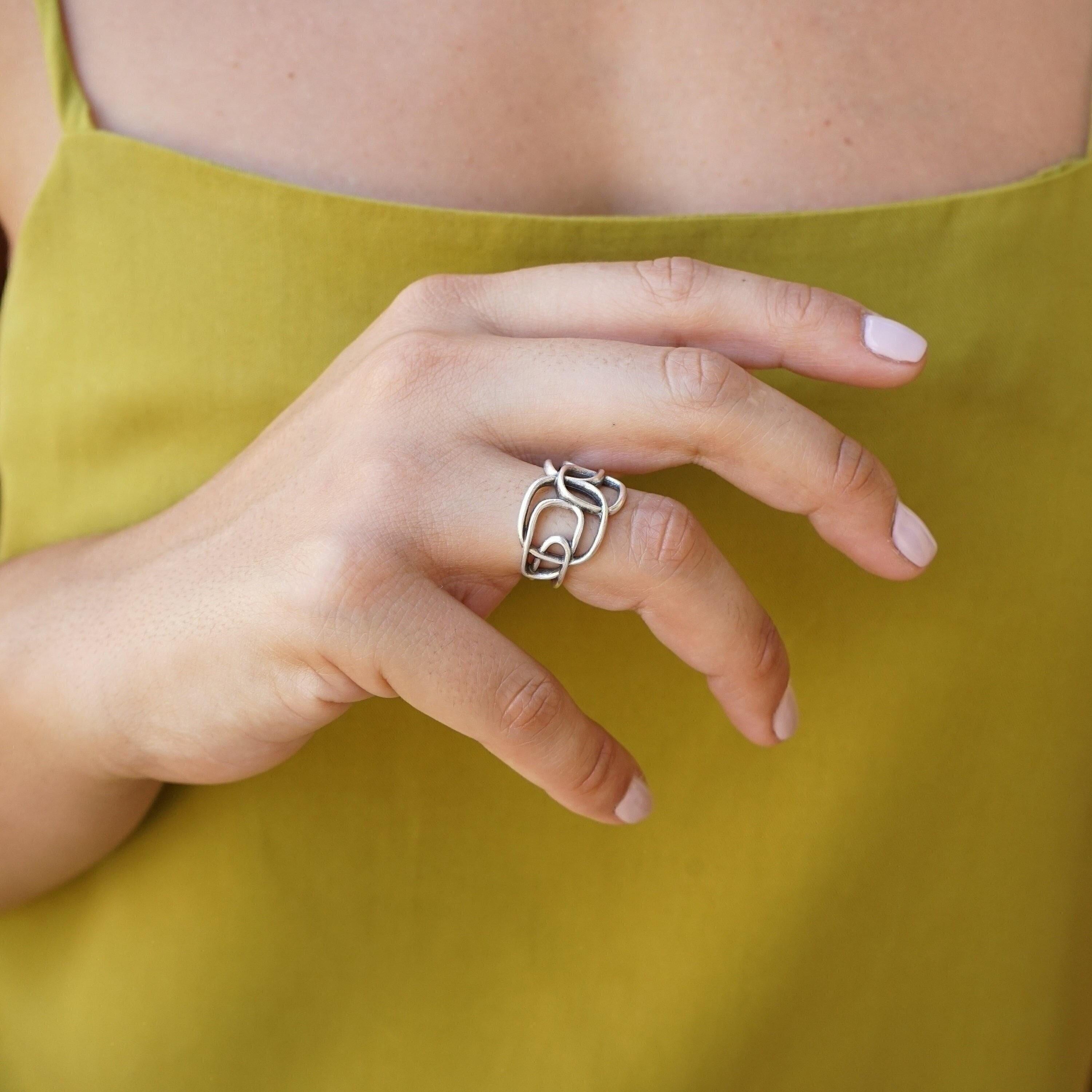 Discover the elegance of the Abstract Silver Wireframe Ring, a distinctive piece that effortlessly blends style and versatility for both daily wear and special occasions. Its unique, asymmetrical design ensures that it stands out, making it a timeless addition to your jewelry collection. This ring's adaptable nature allows it to be worn on any finger, offering an intriguing aesthetic that complements a variety of looks.