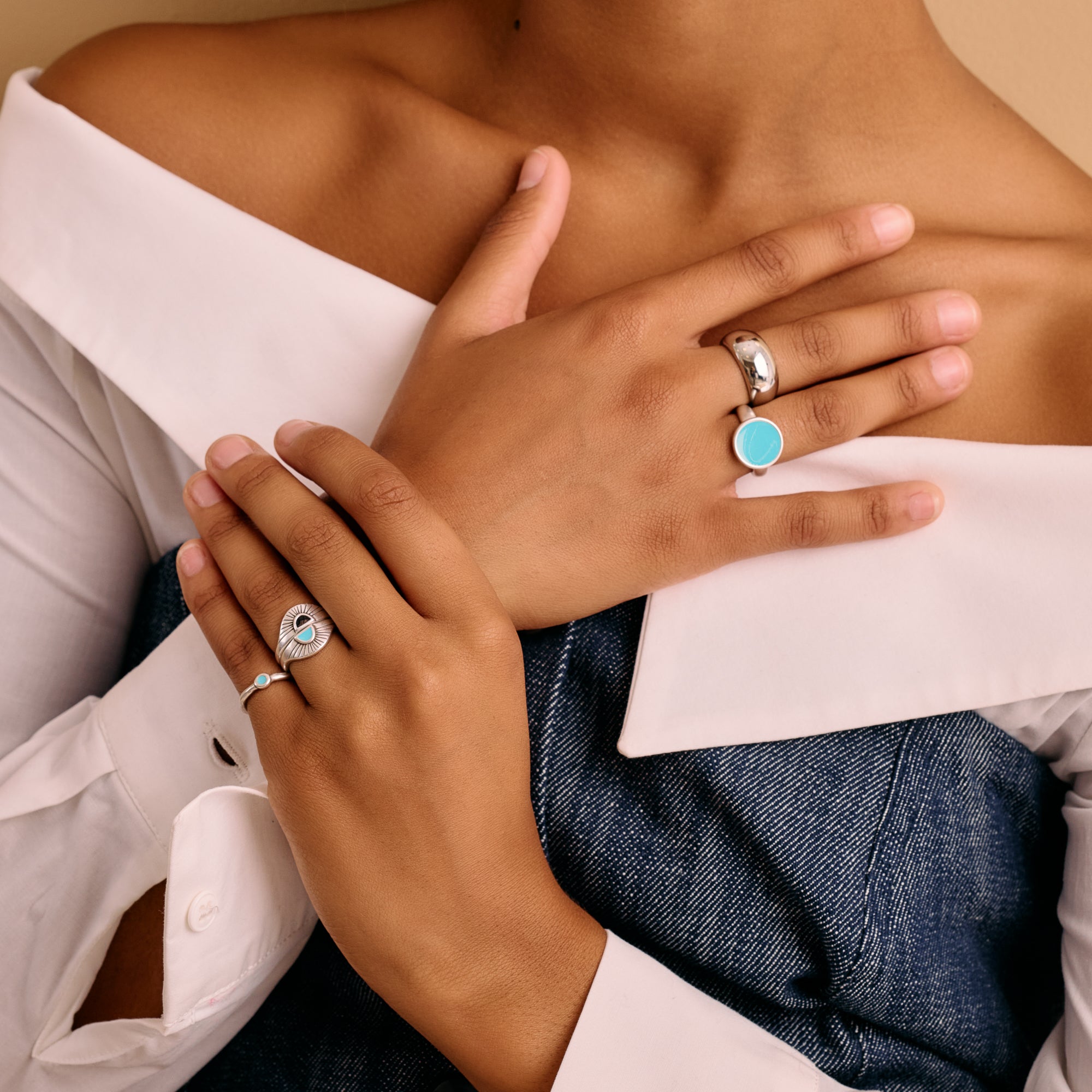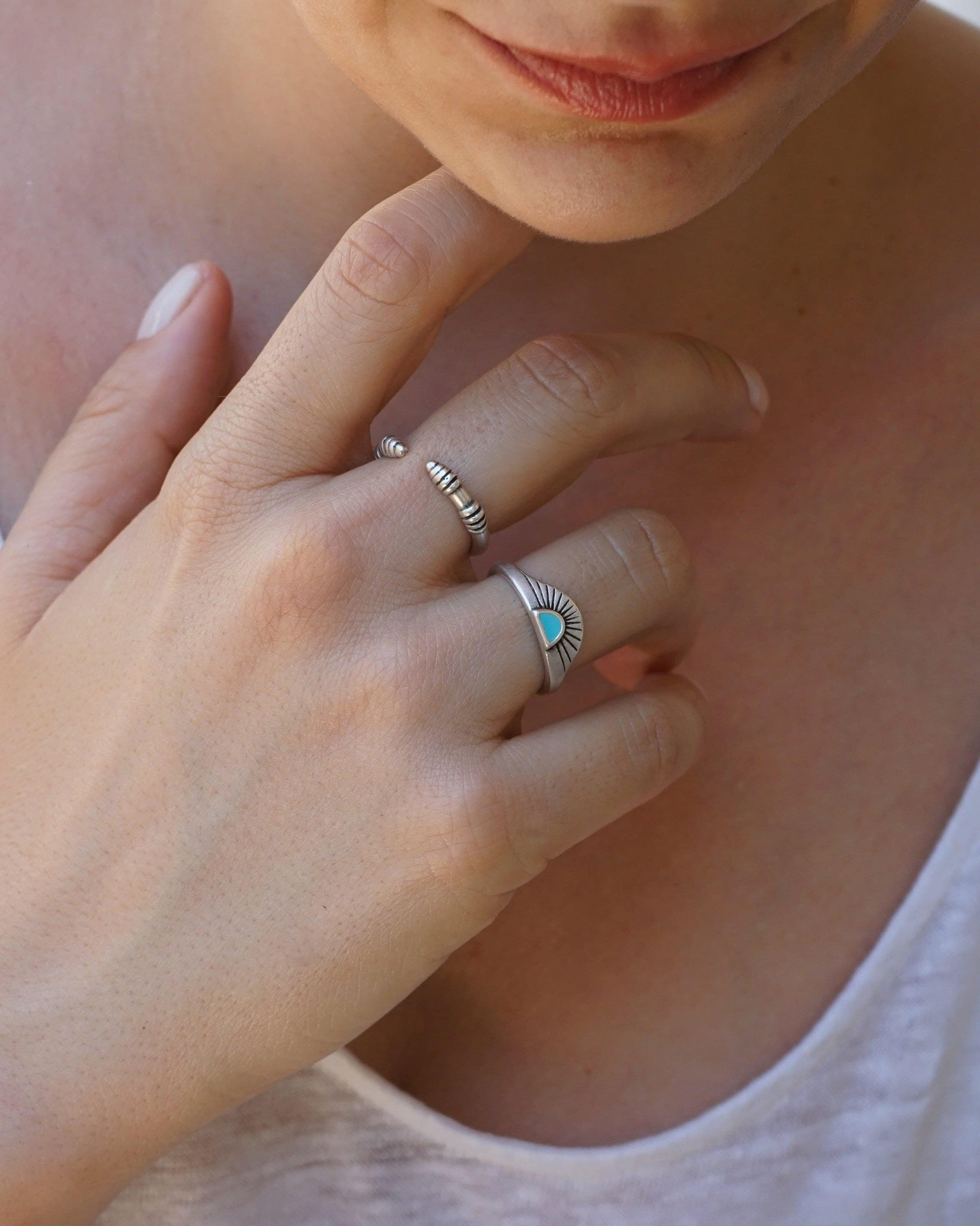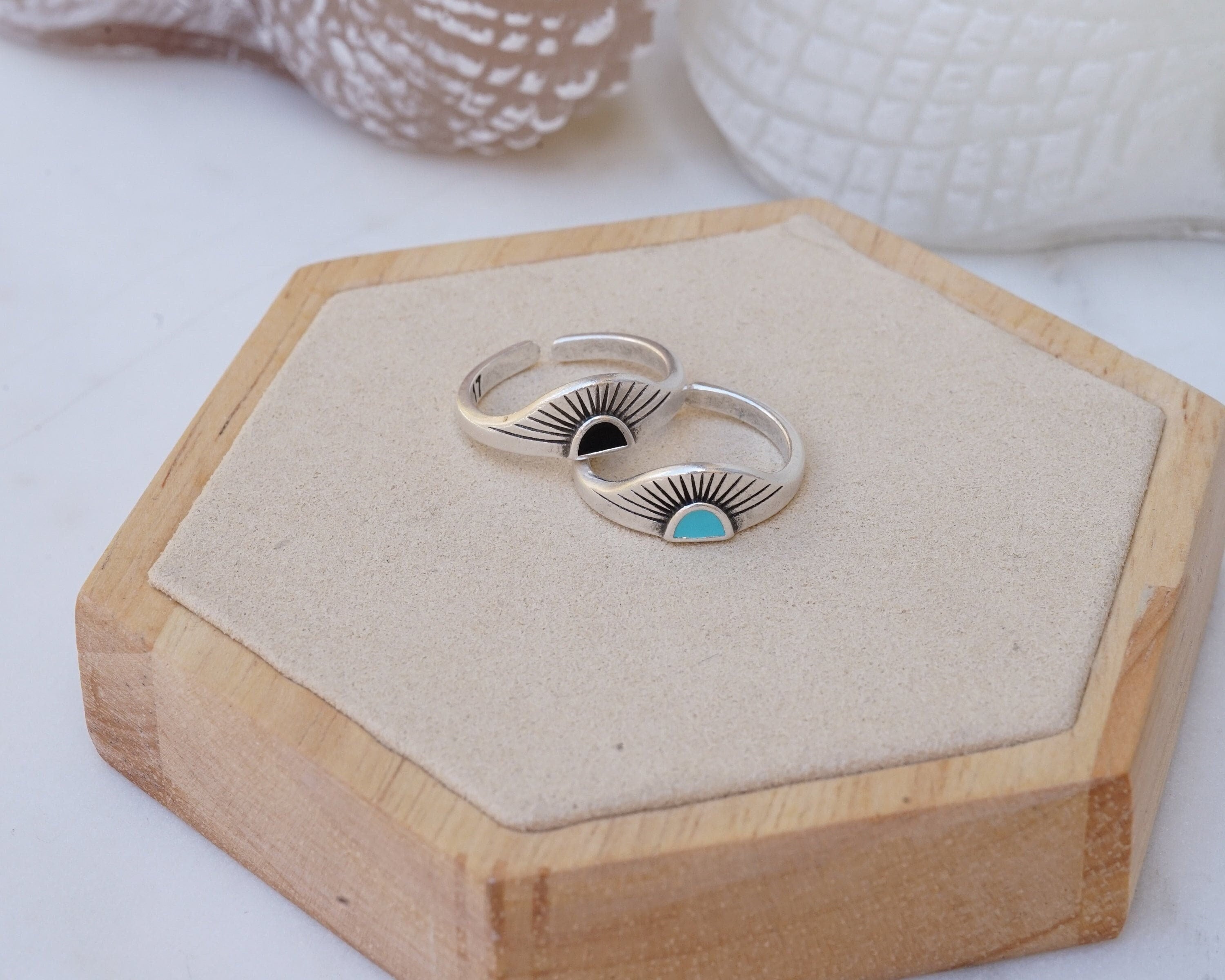 Discover the elegance of our rising sun ring, featuring a sleek design with a choice of black or turquoise enamel setting. This versatile piece effortlessly enhances your outfits and adds a distinctive touch to your jewelry collection.