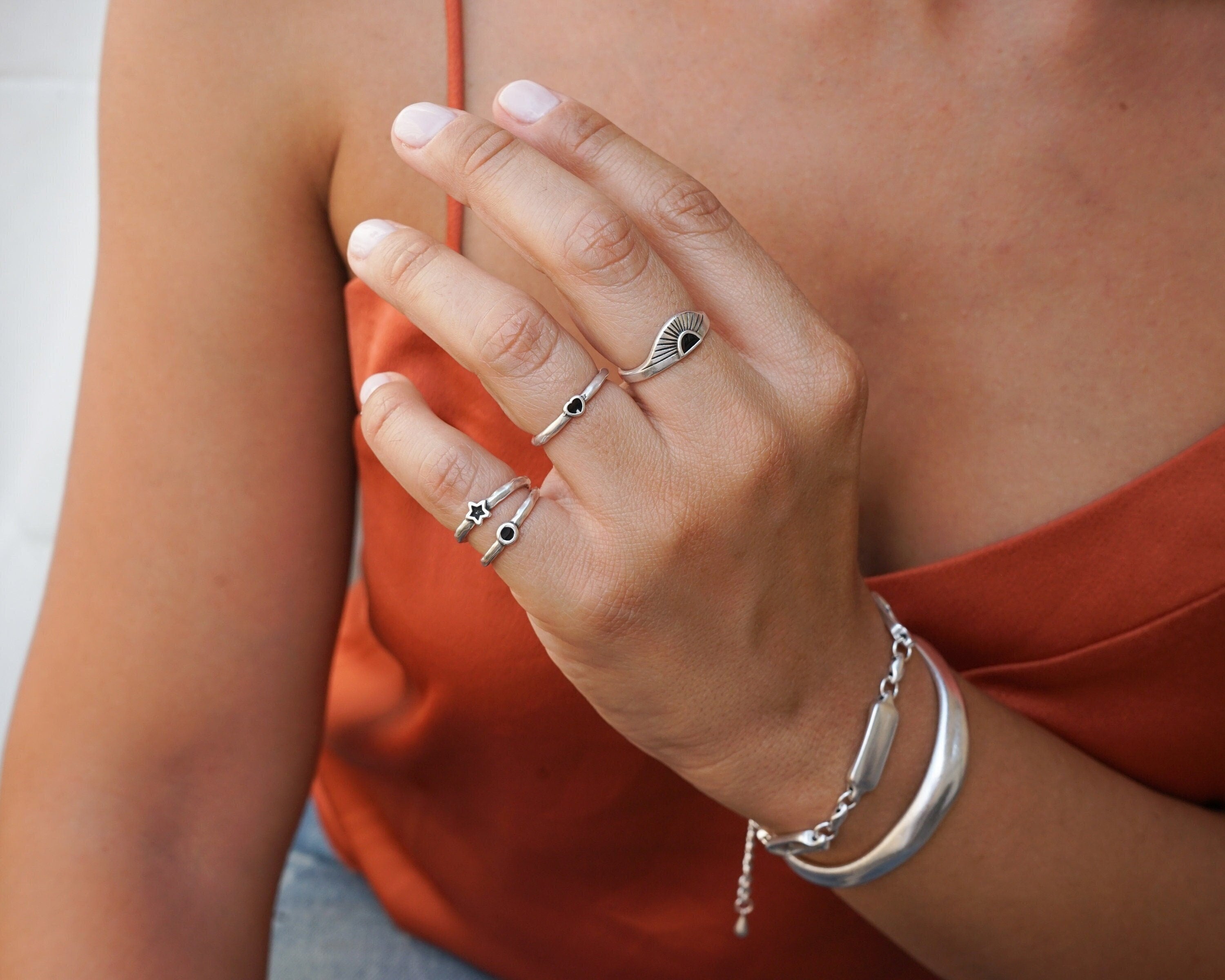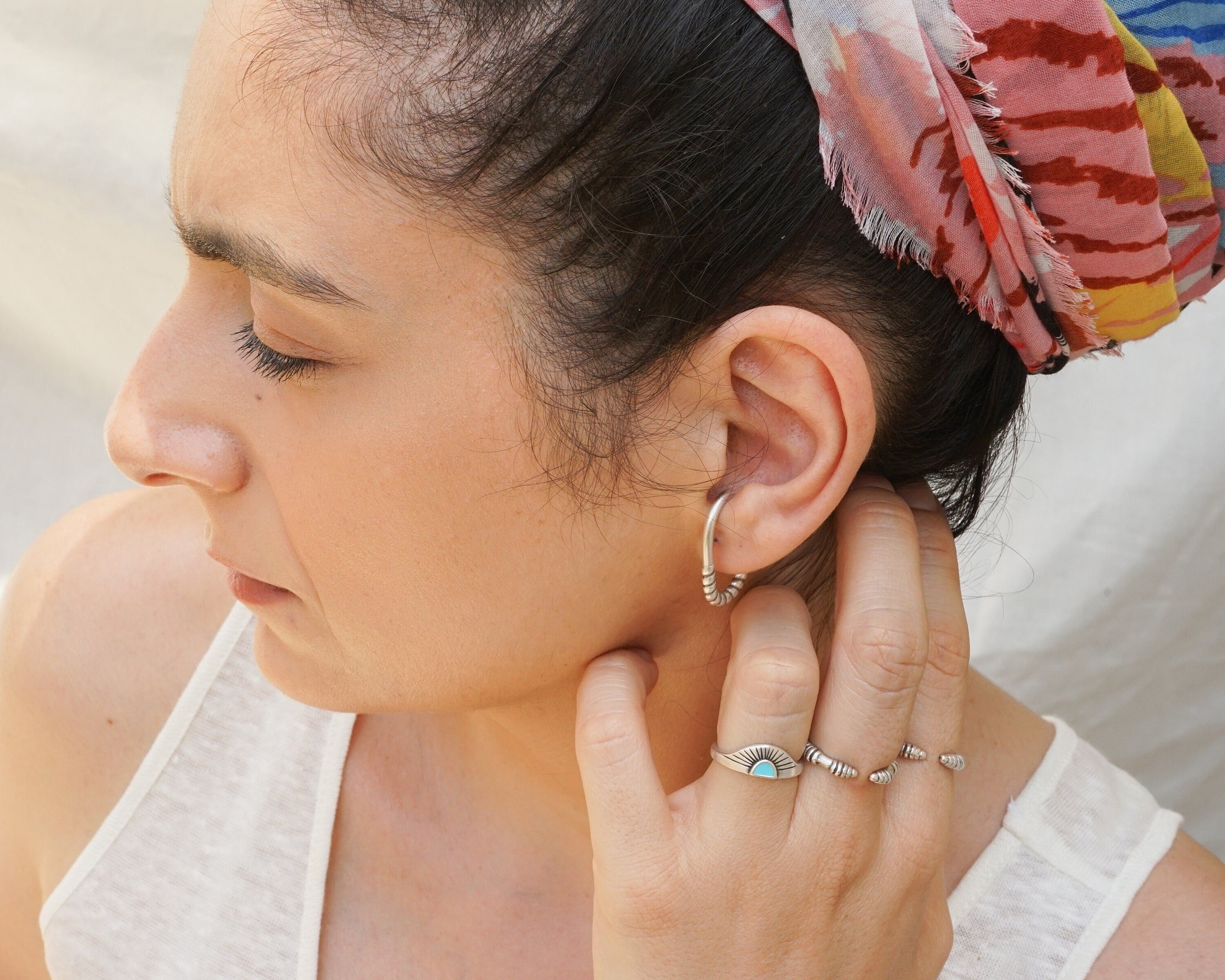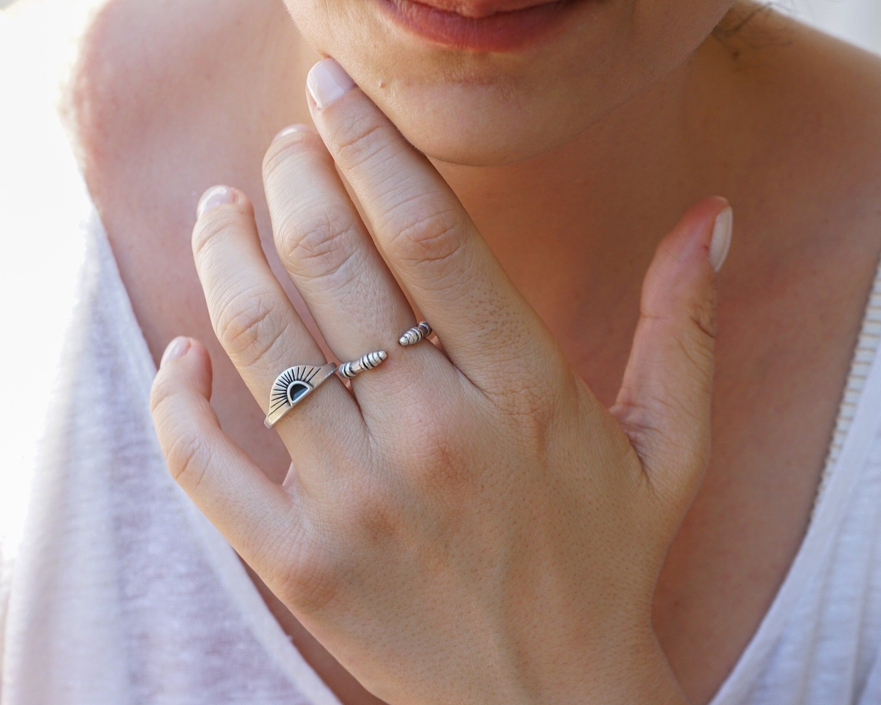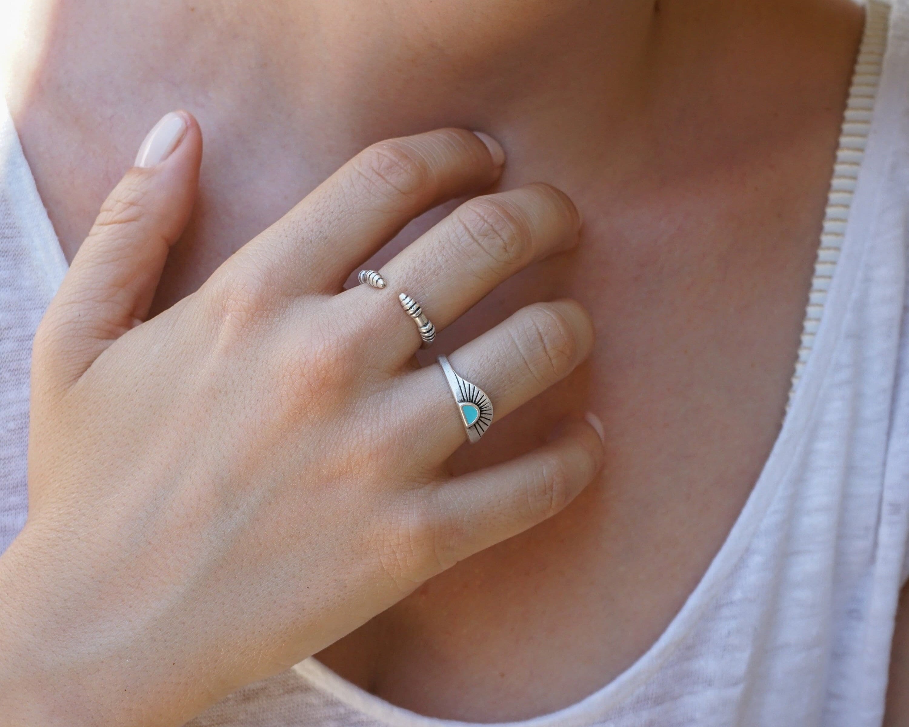 Discover the elegance of our rising sun ring, featuring a sleek design with a choice of black or turquoise enamel setting. This versatile piece effortlessly enhances your outfits and adds a distinctive touch to your jewelry collection.