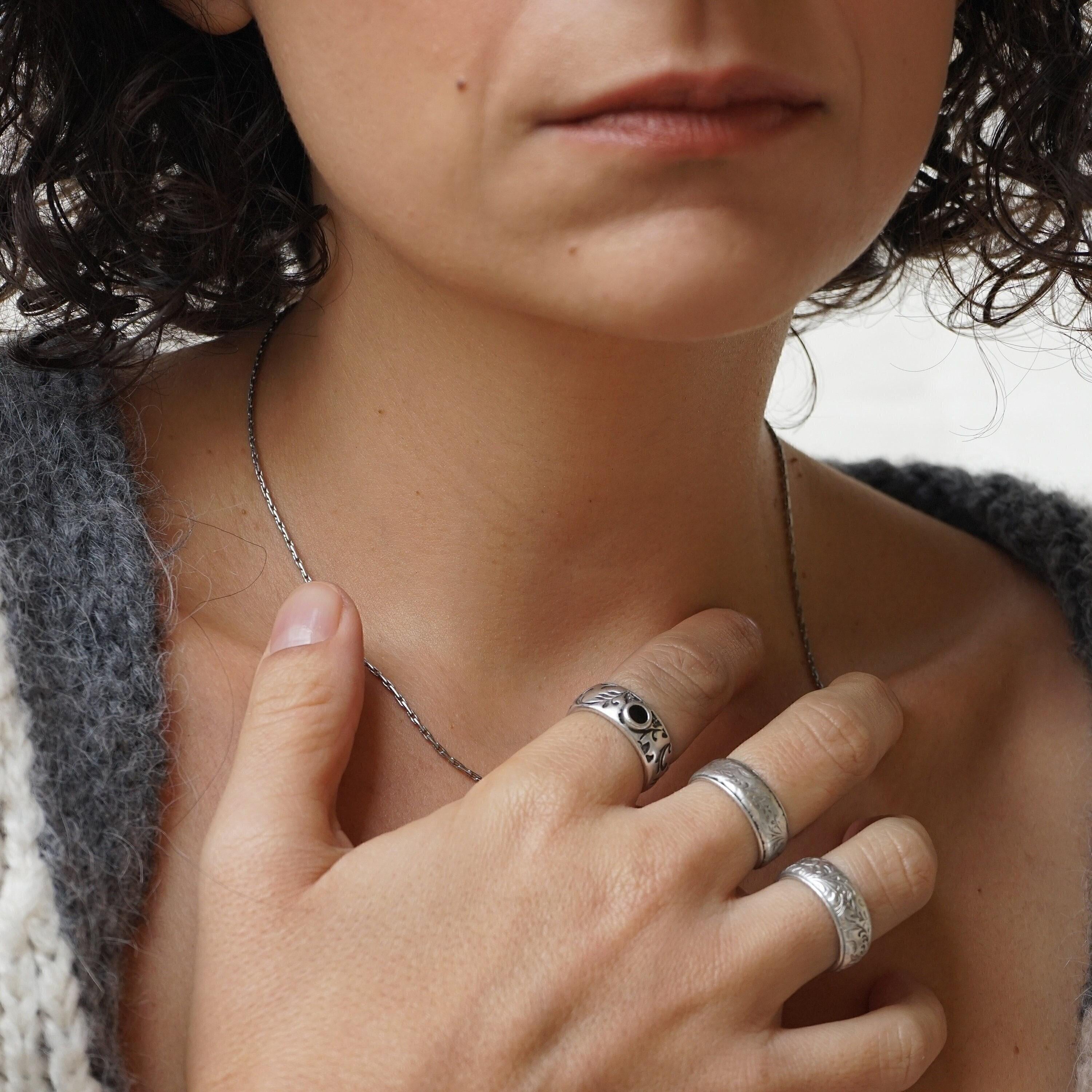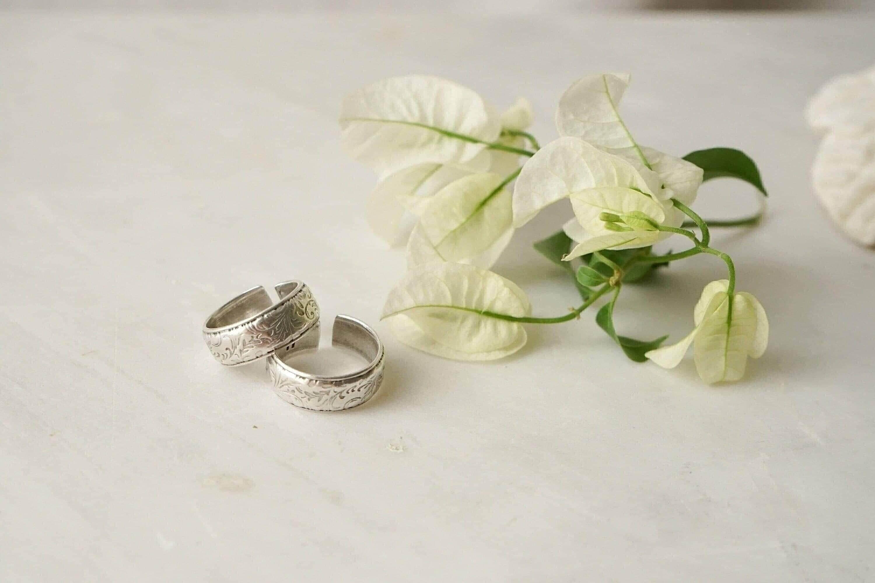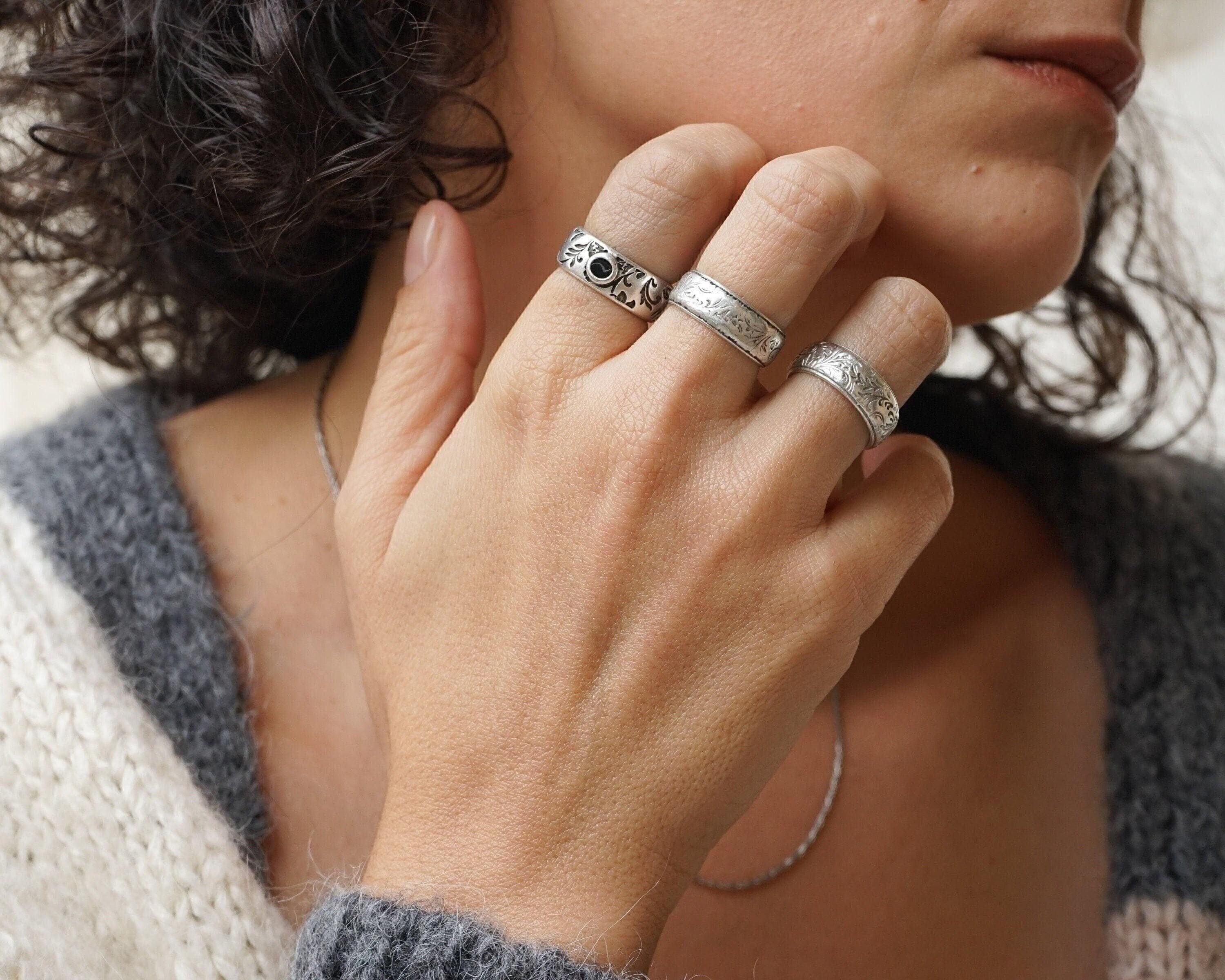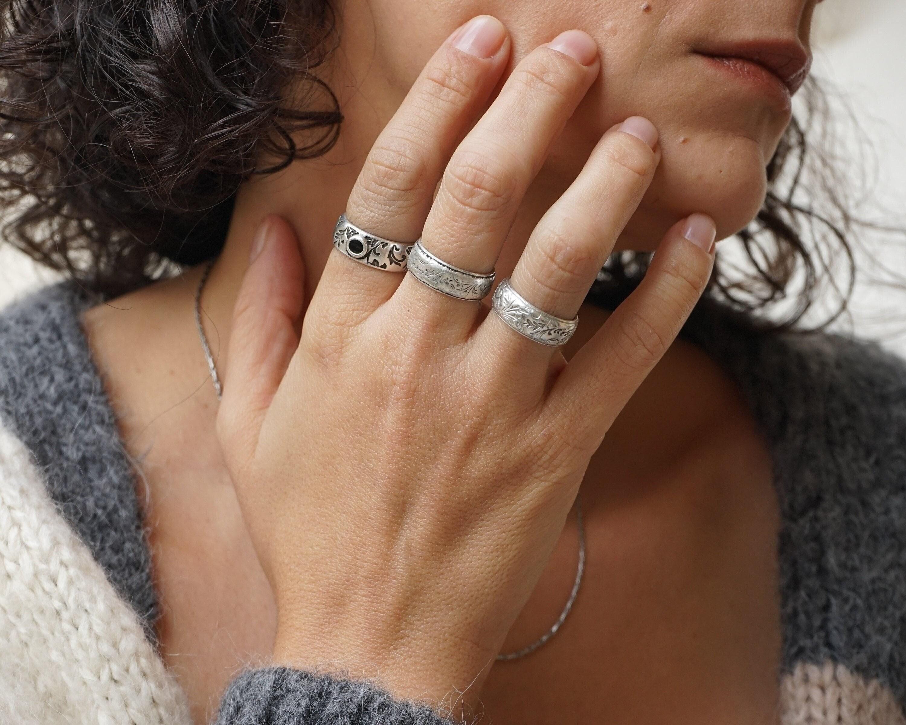 Discover this beautifully crafted silver-plated statement band ring, featuring a meticulously engraved floral design. The intertwined floral pattern is inspired by nature and symbolizes eternal love, making it a thoughtful gift for your special someone on Valentine's Day or any meaningful occasion. This versatile piece can be worn on the index, middle, thumb, or ring finger and looks lovely alongside the rings already in your collection.