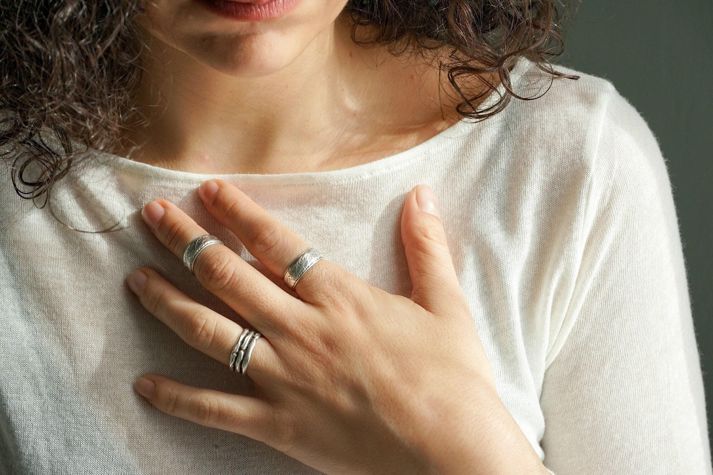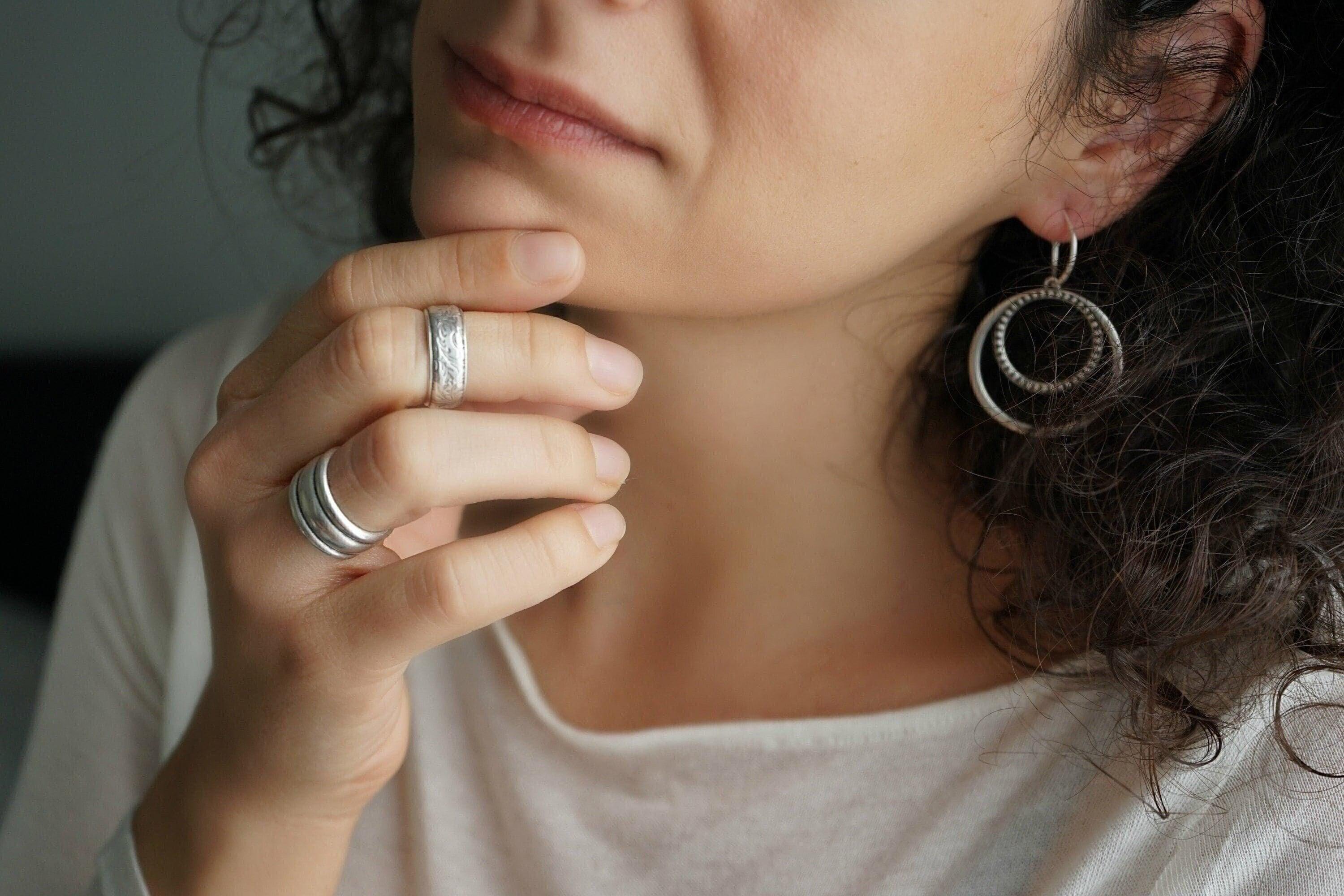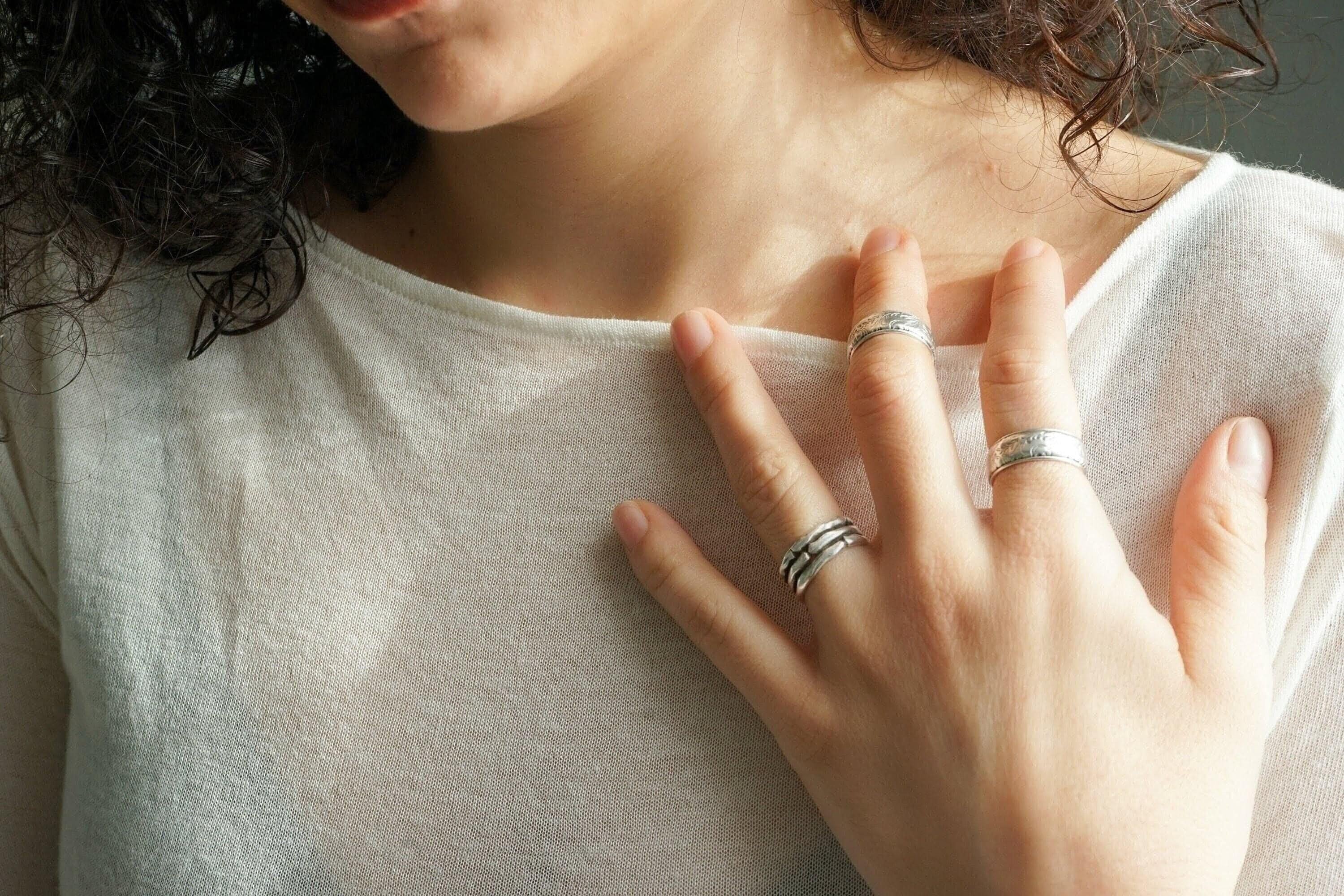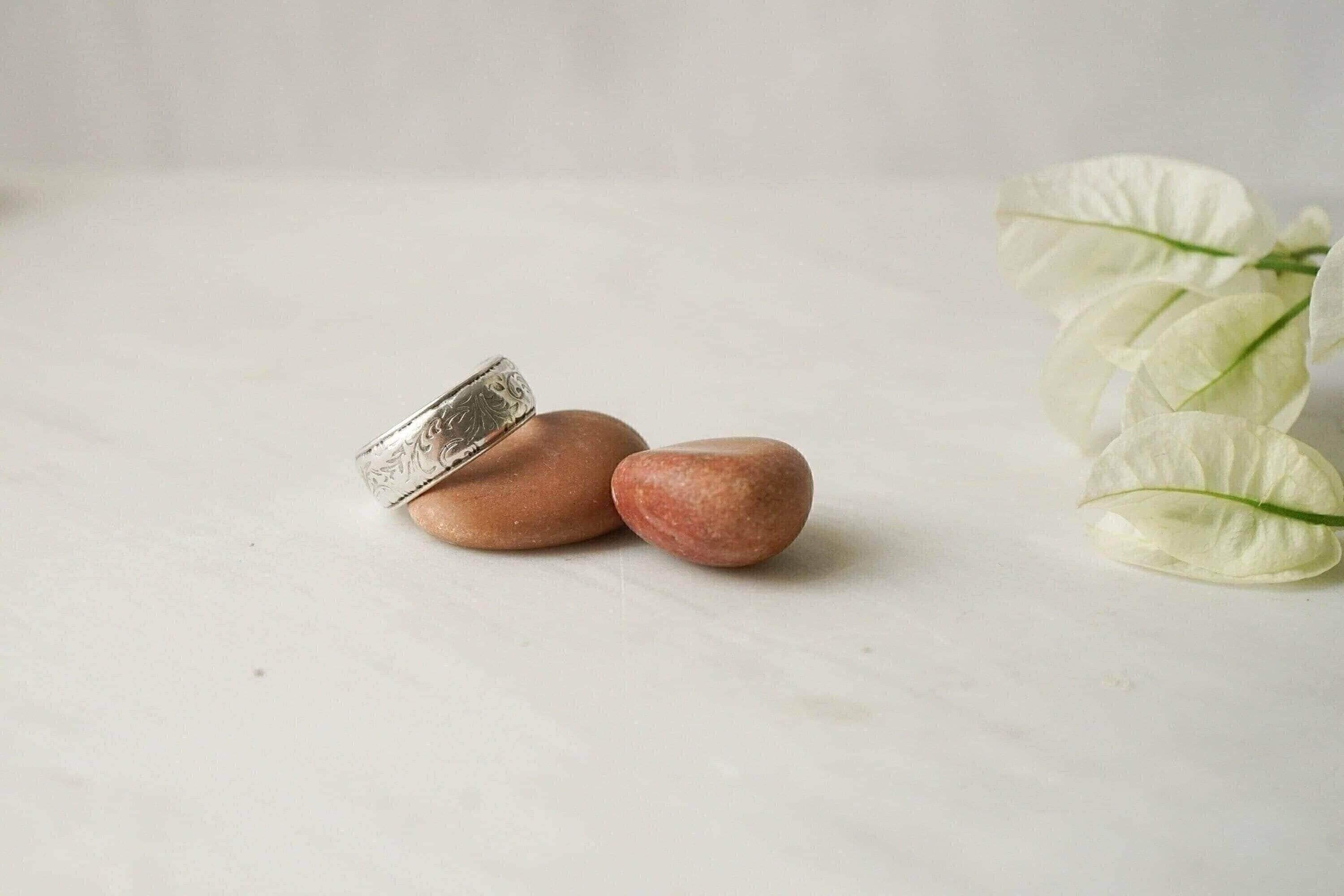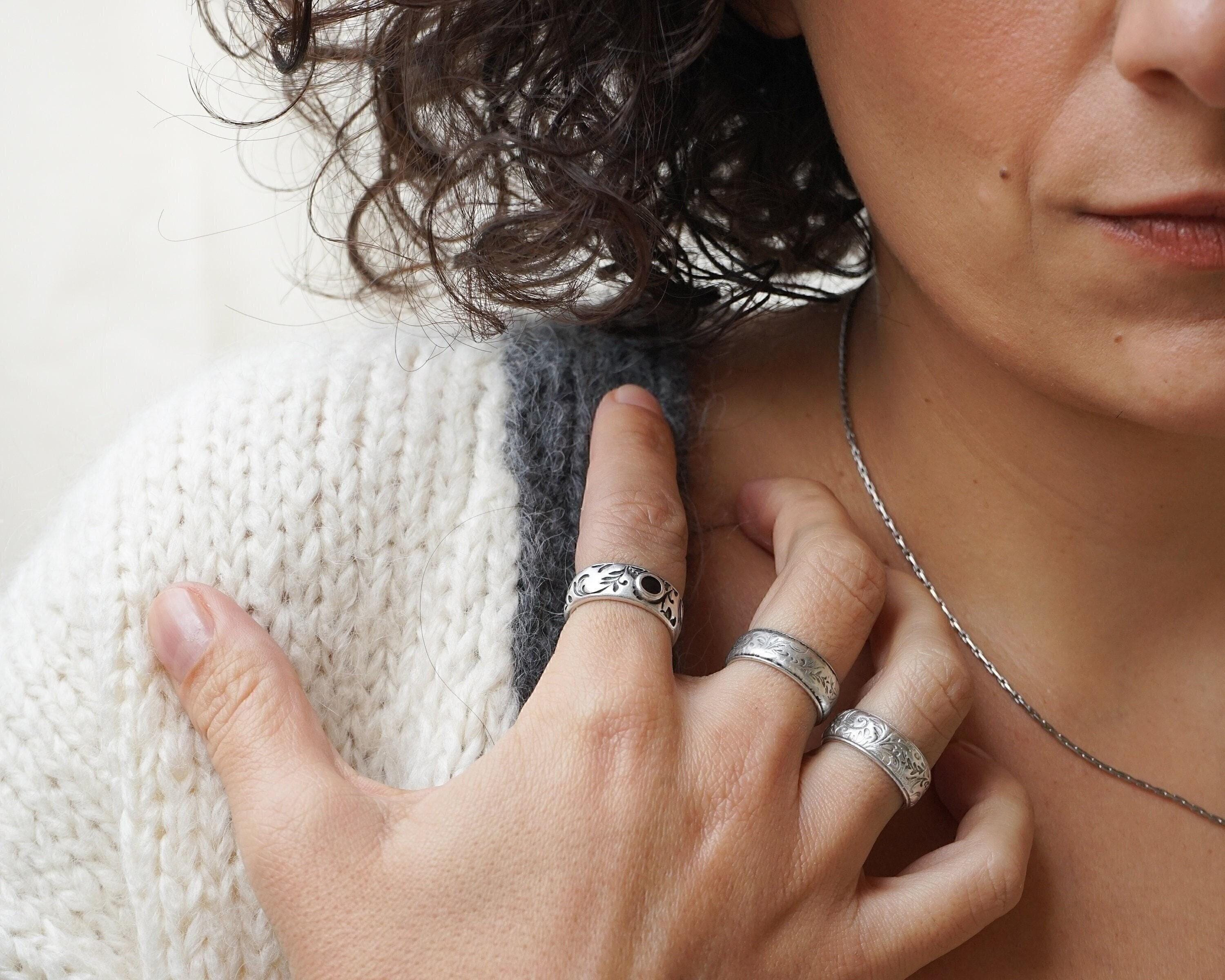 Discover this beautifully crafted silver-plated statement band ring, featuring a meticulously engraved floral design. The intertwined floral pattern is inspired by nature and symbolizes eternal love, making it a thoughtful gift for your special someone on Valentine's Day or any meaningful occasion. This versatile piece can be worn on the index, middle, thumb, or ring finger and looks lovely alongside the rings already in your collection.