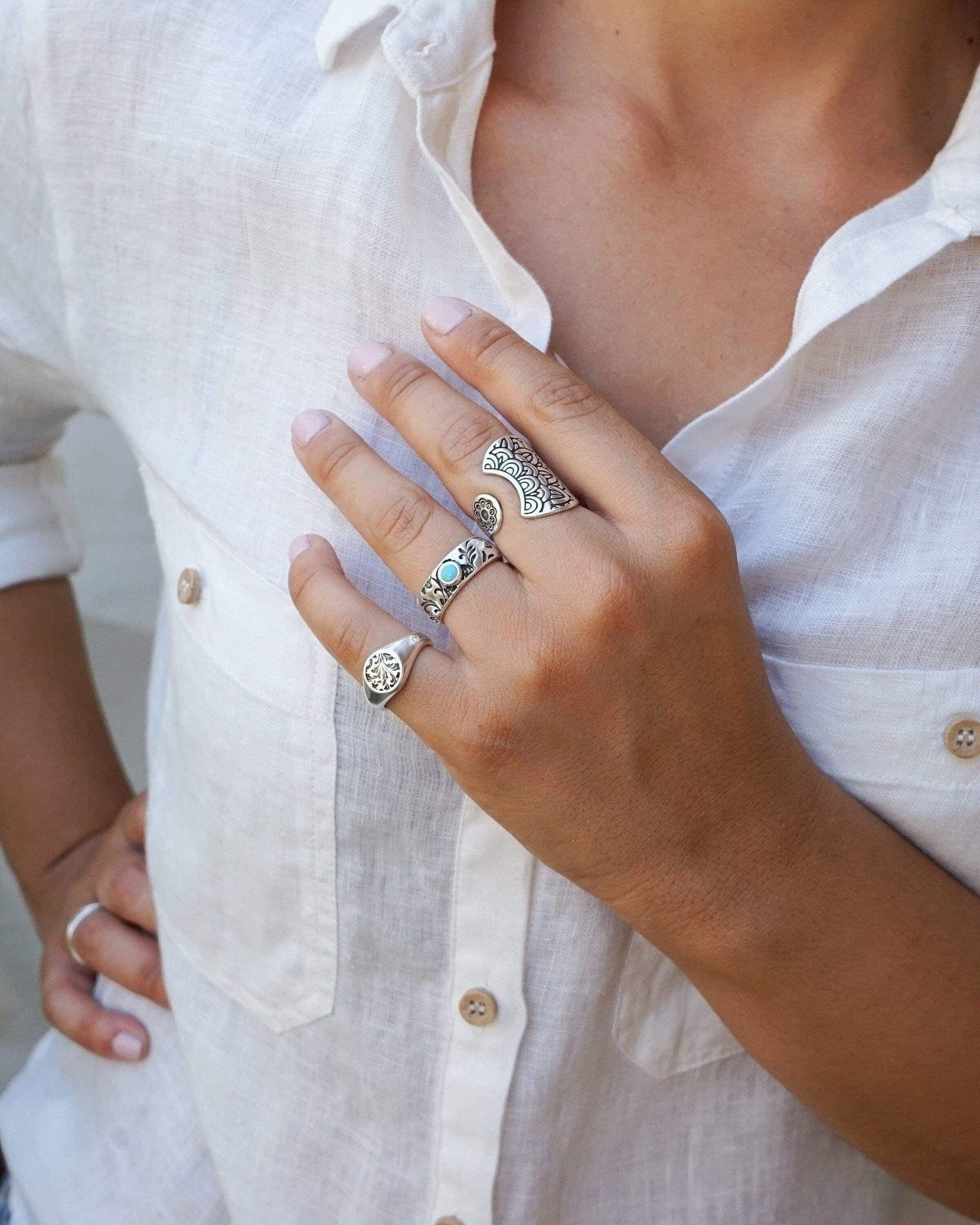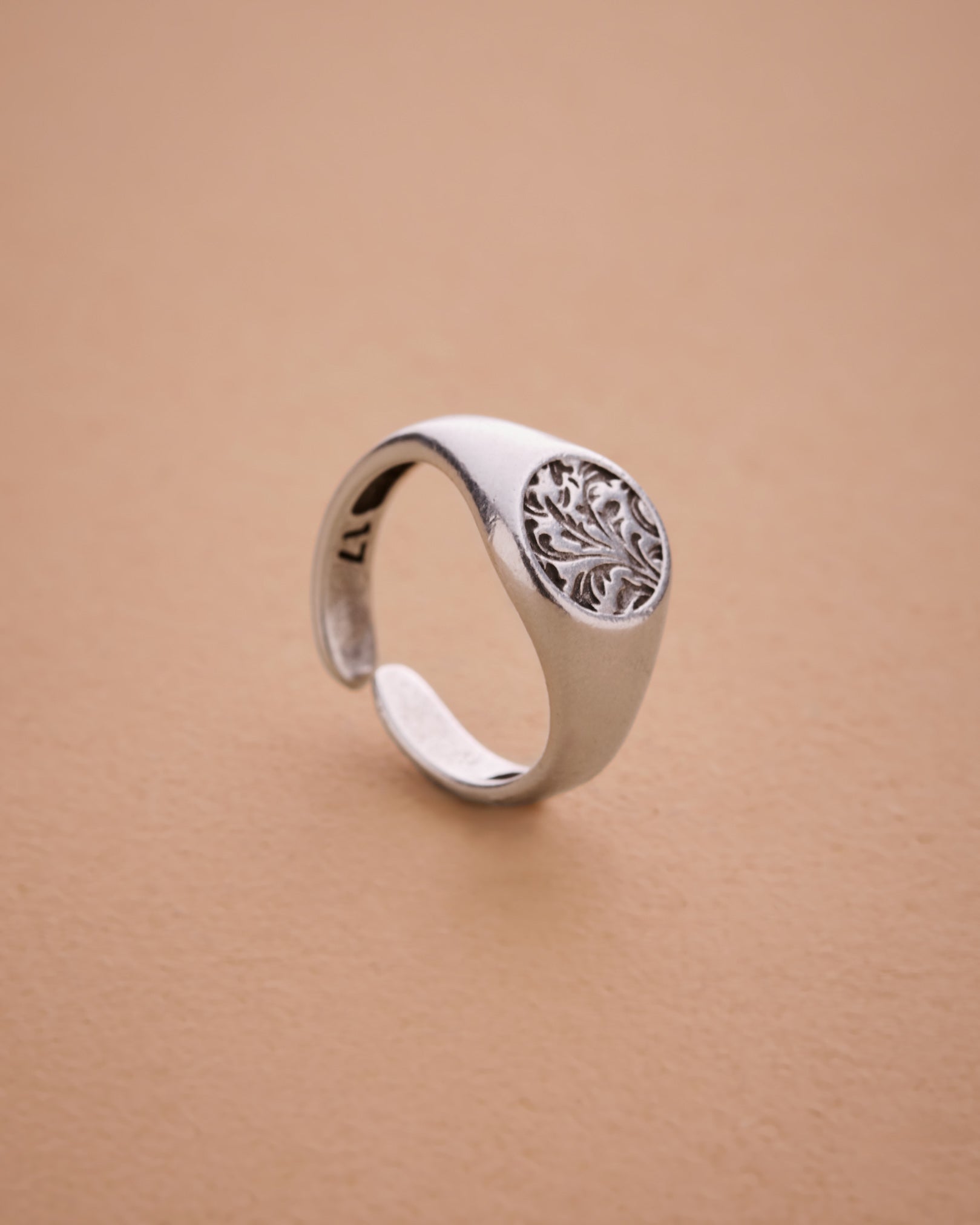 Crafted from silver-plated zamak, this floral-stamped signet ring captures the essence of nature's elegance. Its distinctive design makes it a perfect statement piece for any occasion. This versatile accessory can be styled on any finger you choose, allowing for personal expression and style.