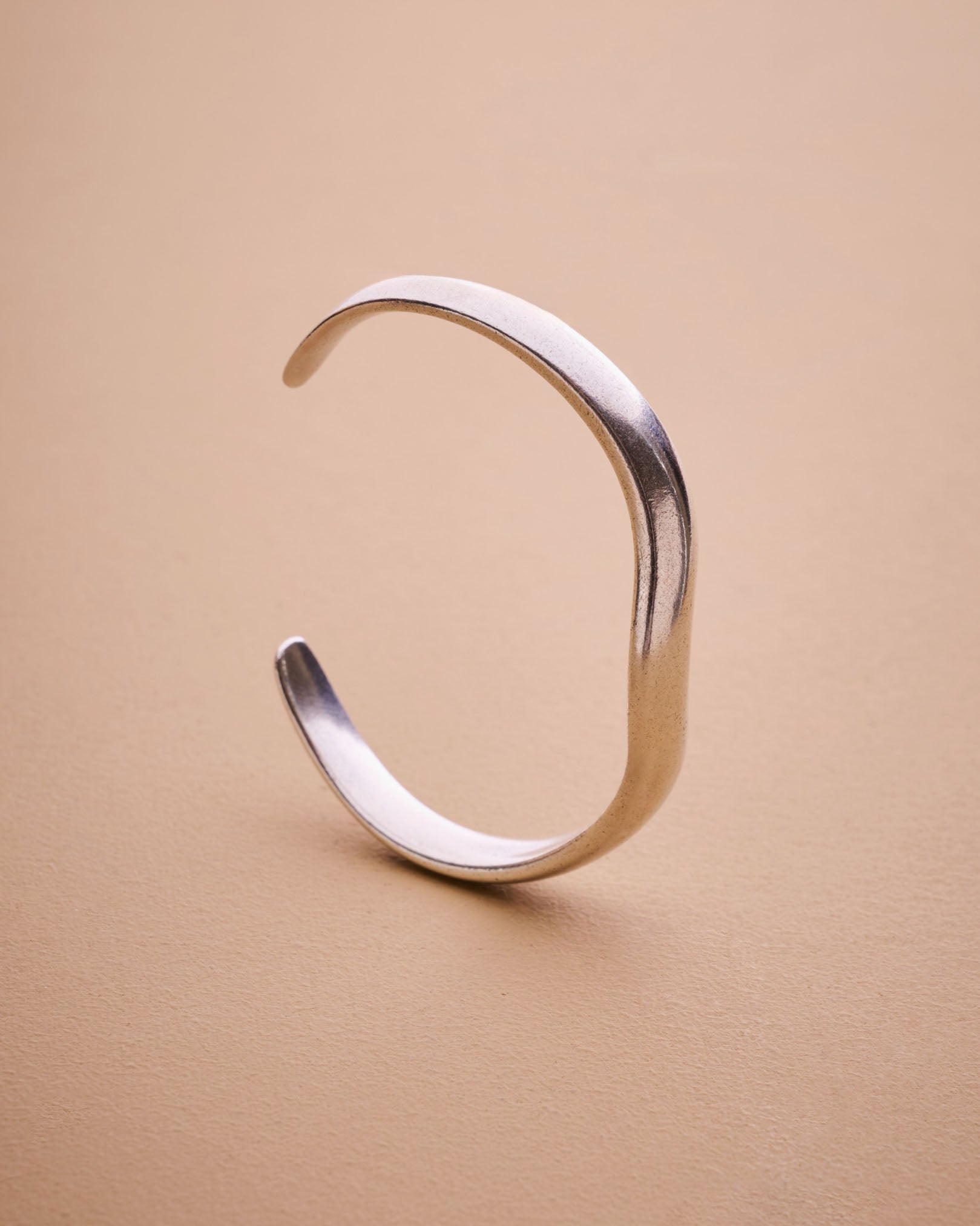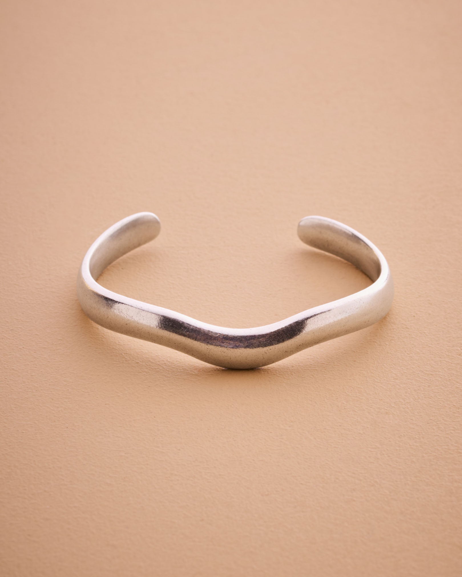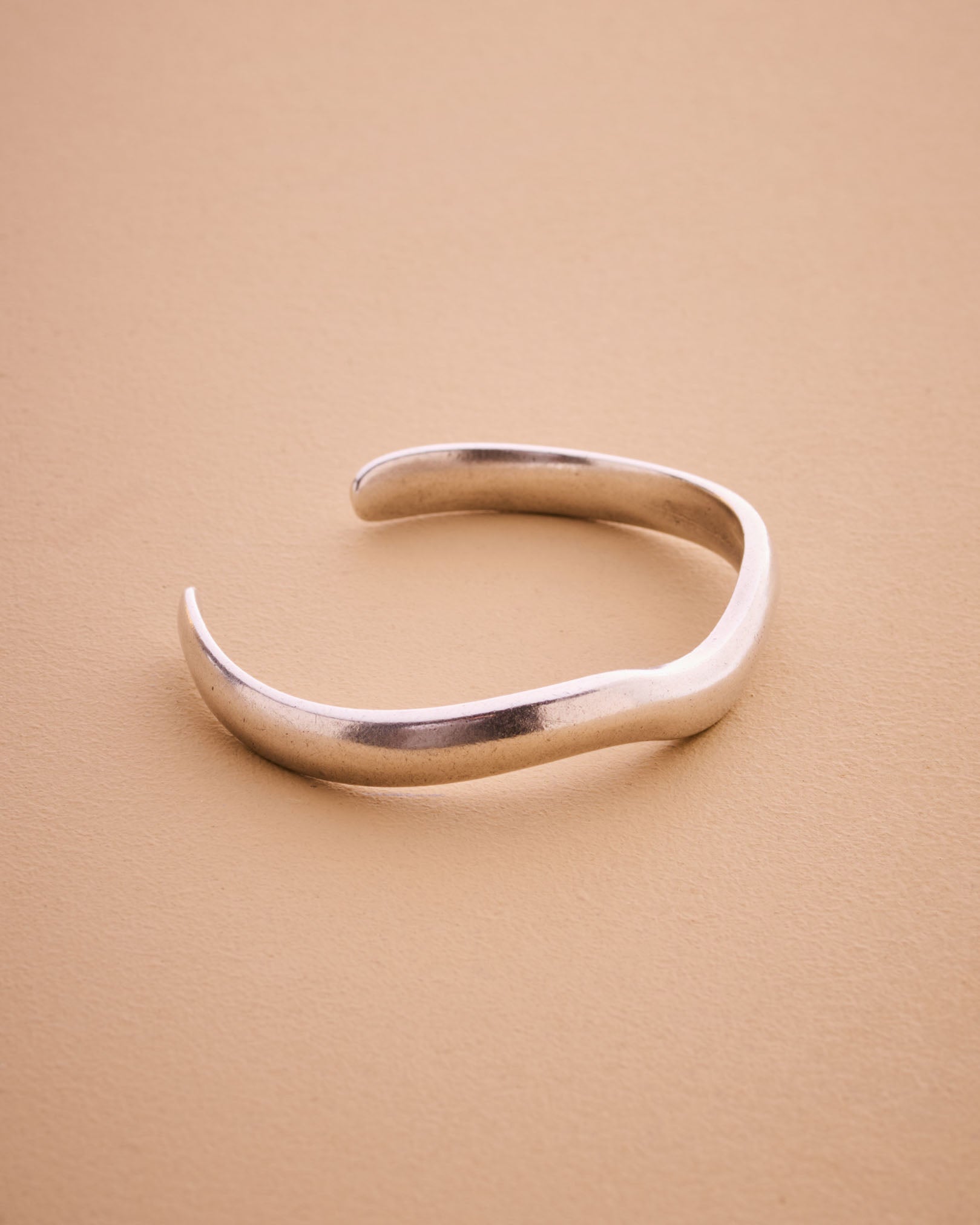 This silver-plated cuff bracelet, crafted with an antique vintage look, features a bold and irregular shape design that adds a unique edge to your style. Its distinctive character makes it a standout piece, perfect for wearing solo or mixing with other cuffs and bangles.