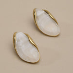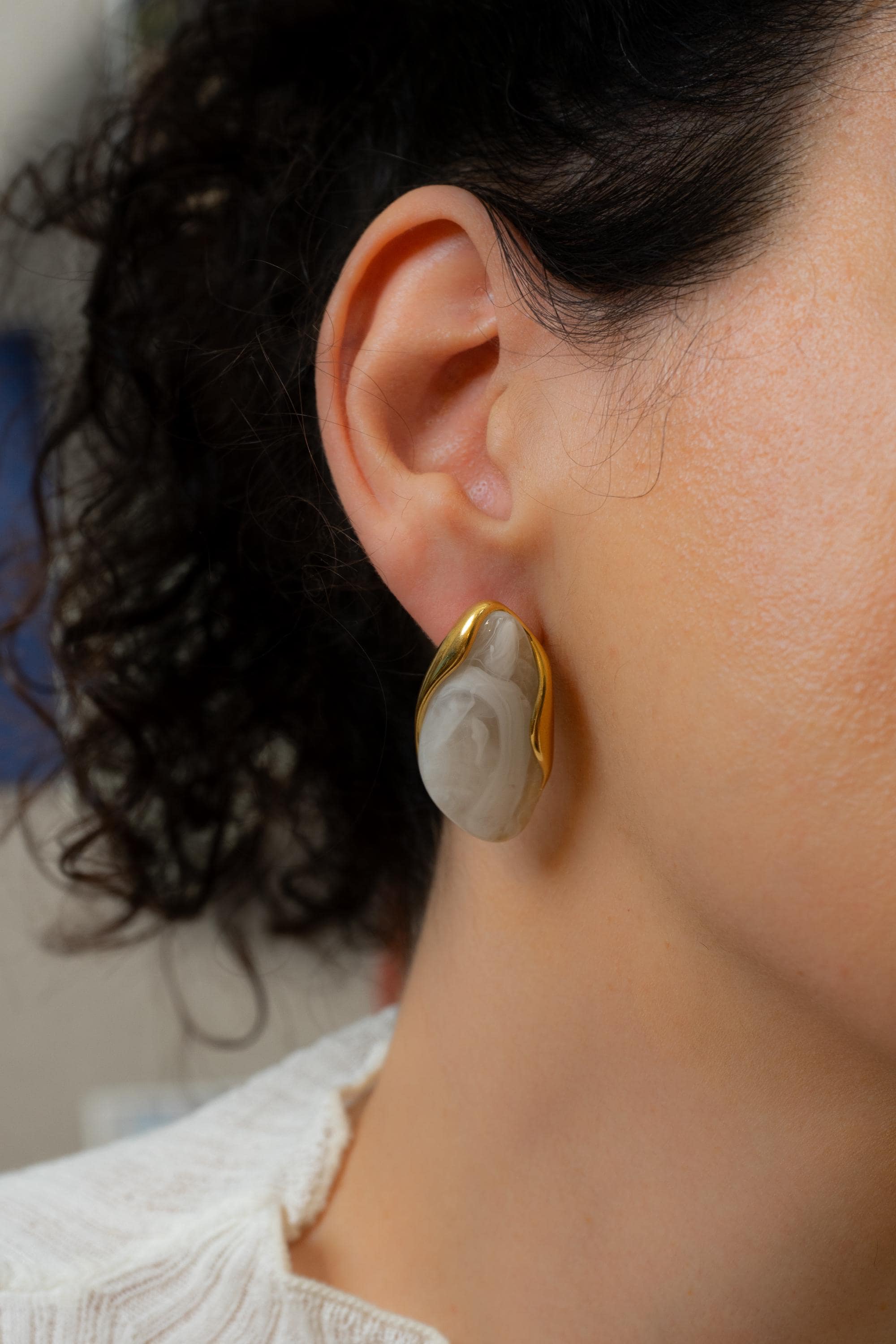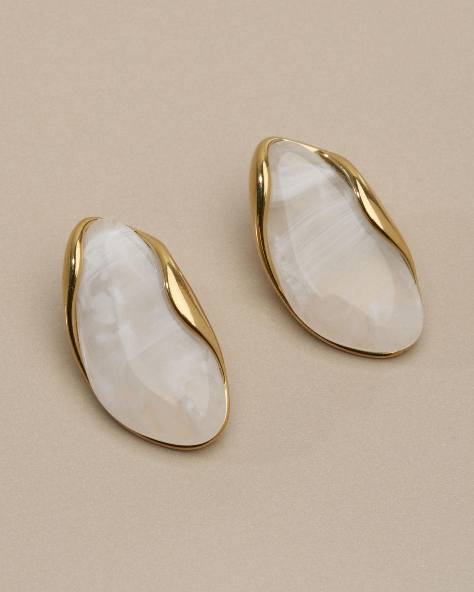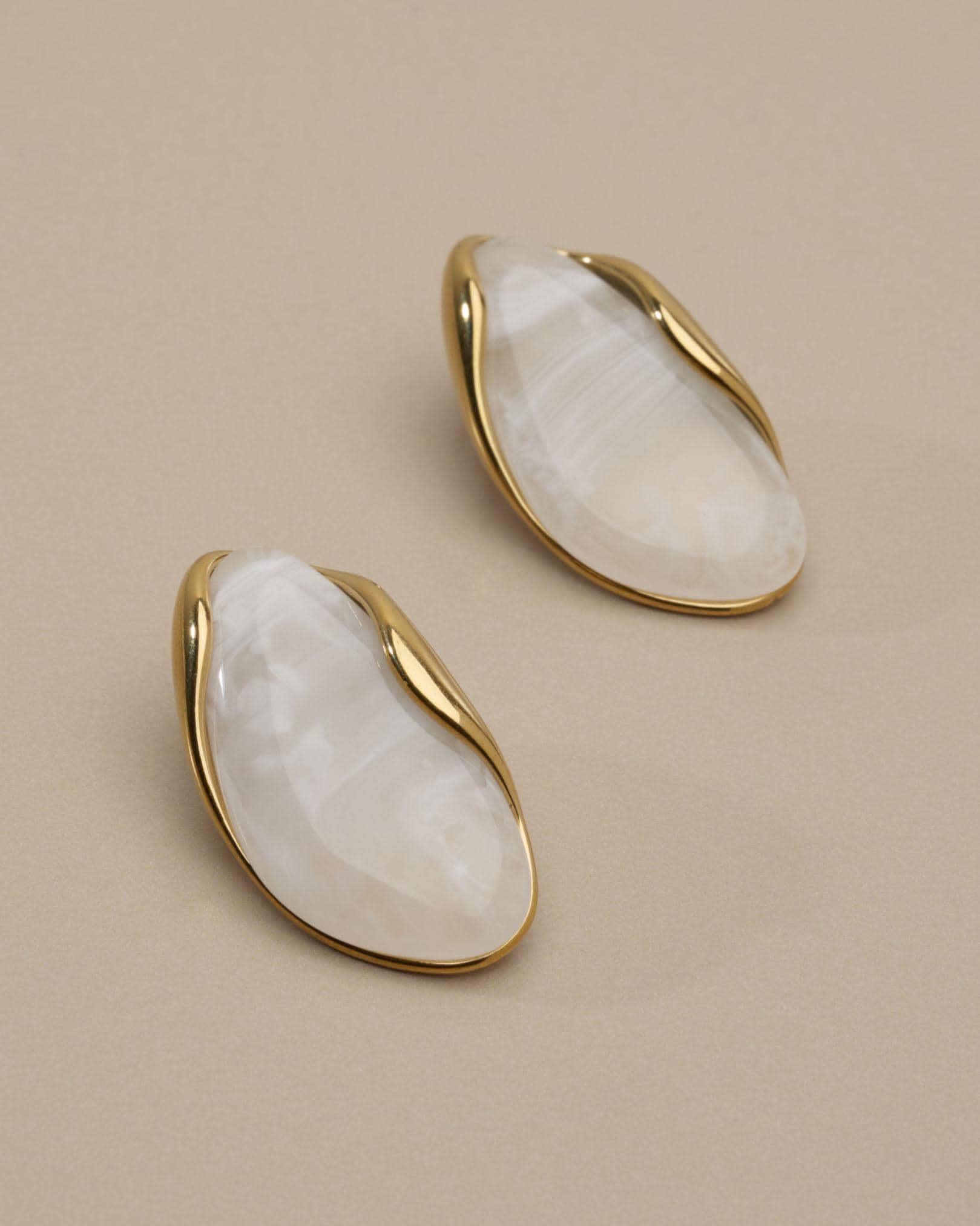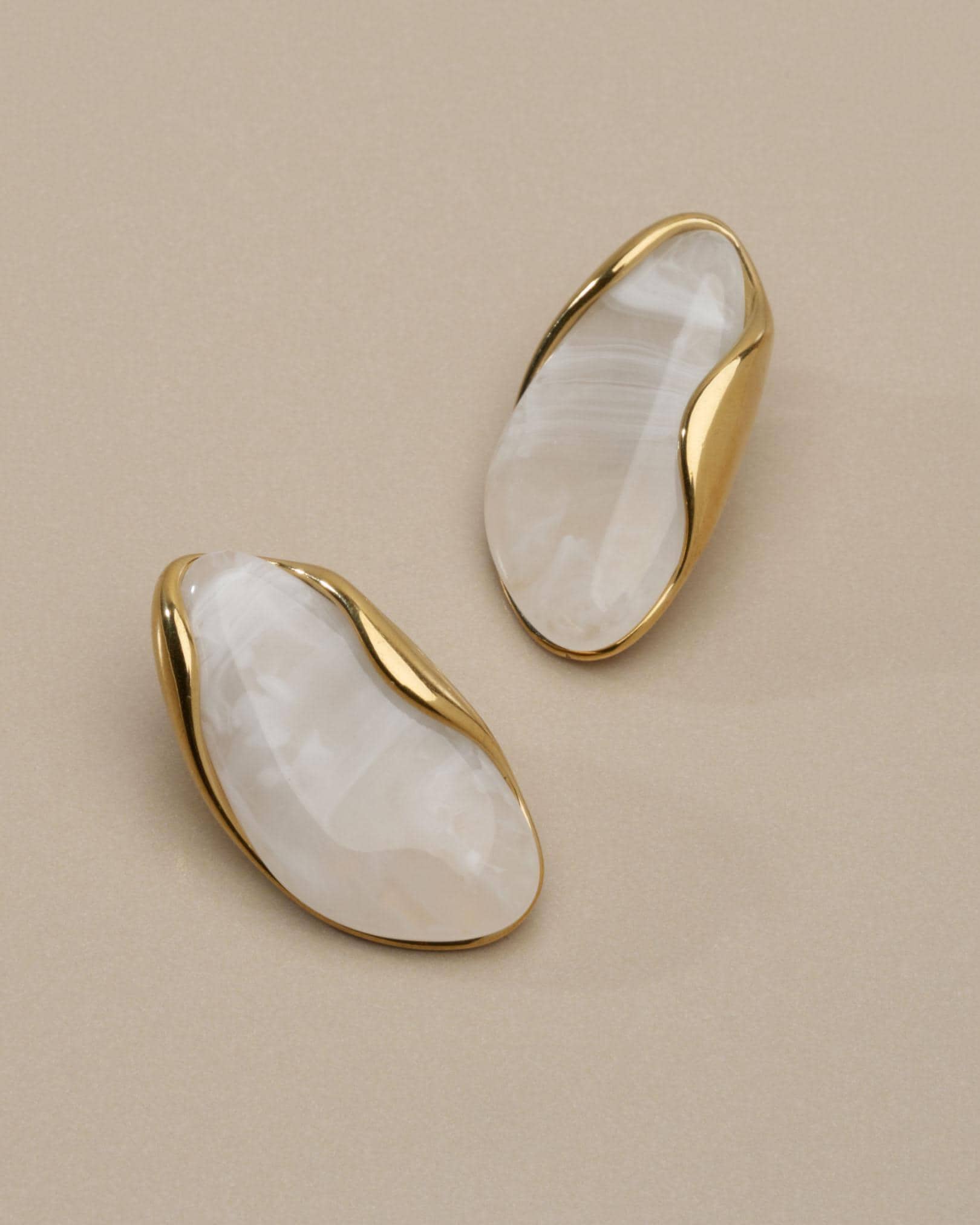 These oval stud earrings feature a smooth acrylic stone framed in gold-tone stainless steel for a clean, sculptural finish. Designed with balance in mind, they offer a statement shape without excess weight.