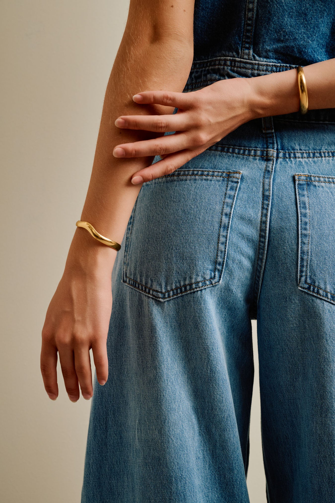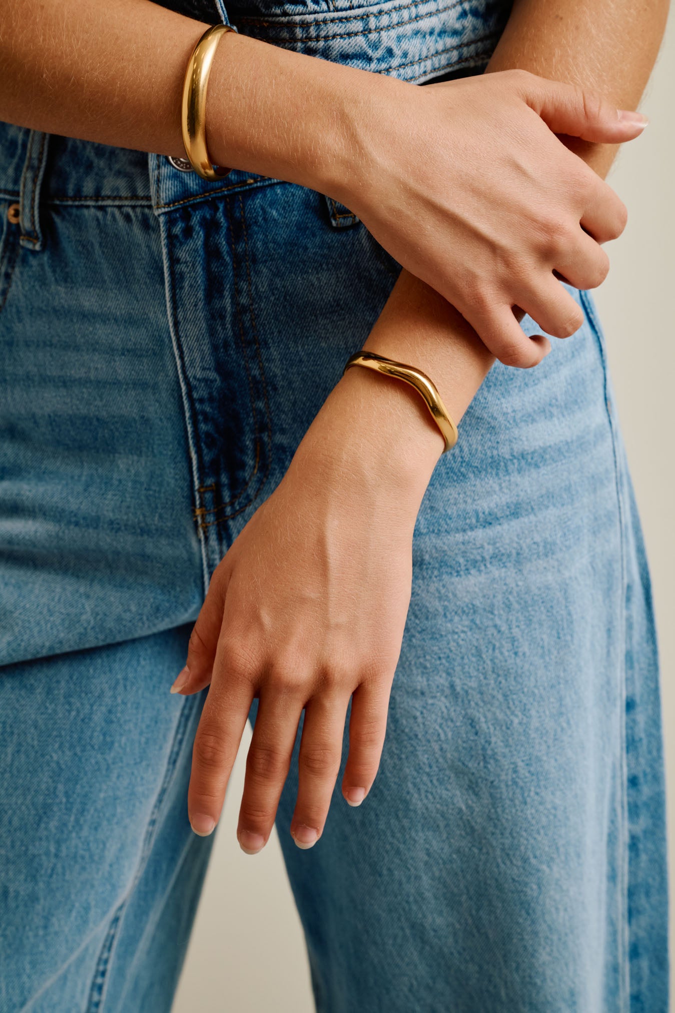 This stunning gold-plated cuff bracelet features a bold and irregular shape design, making it a standout accessory for any occasion. Its contemporary aesthetic and sleek finish add a modern edge to your jewelry collection.