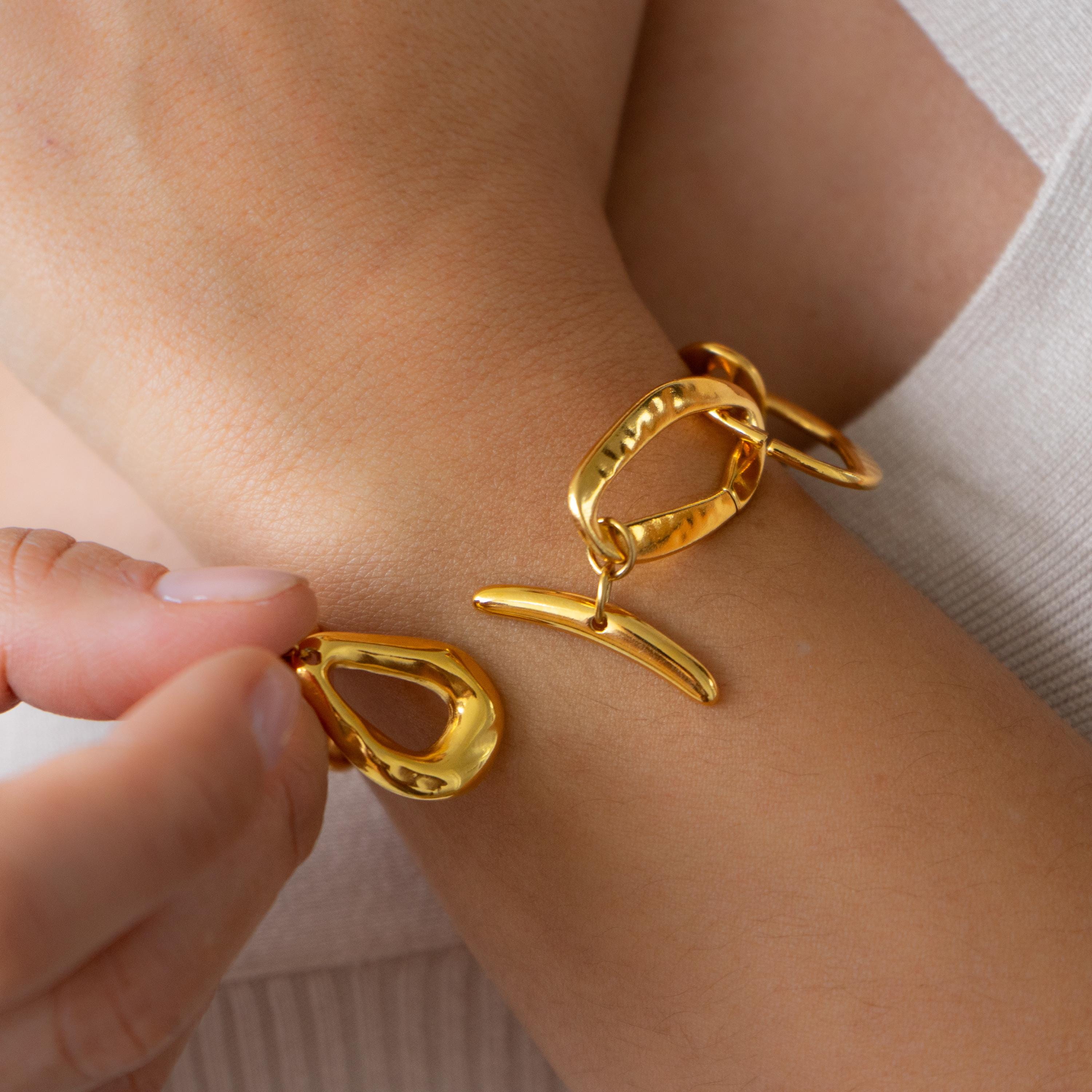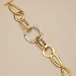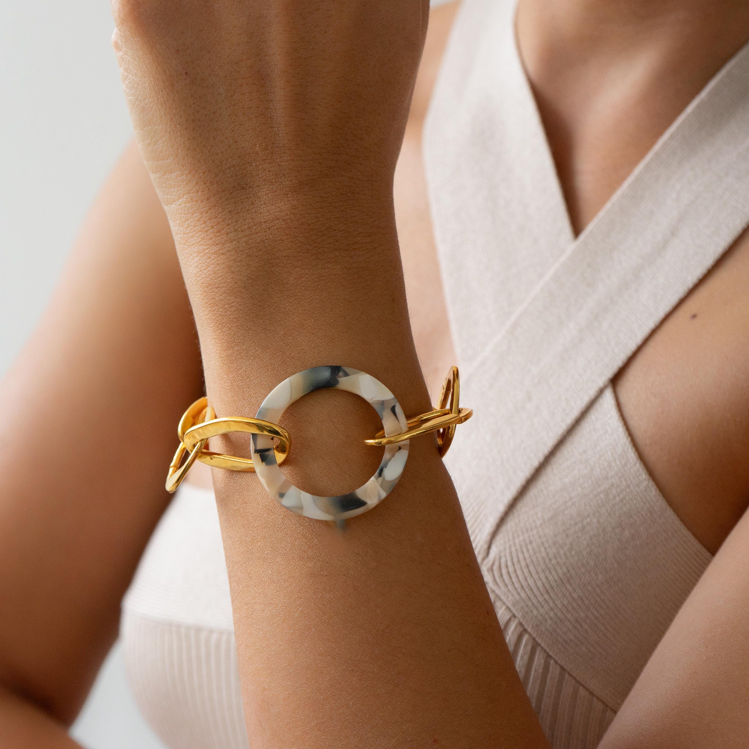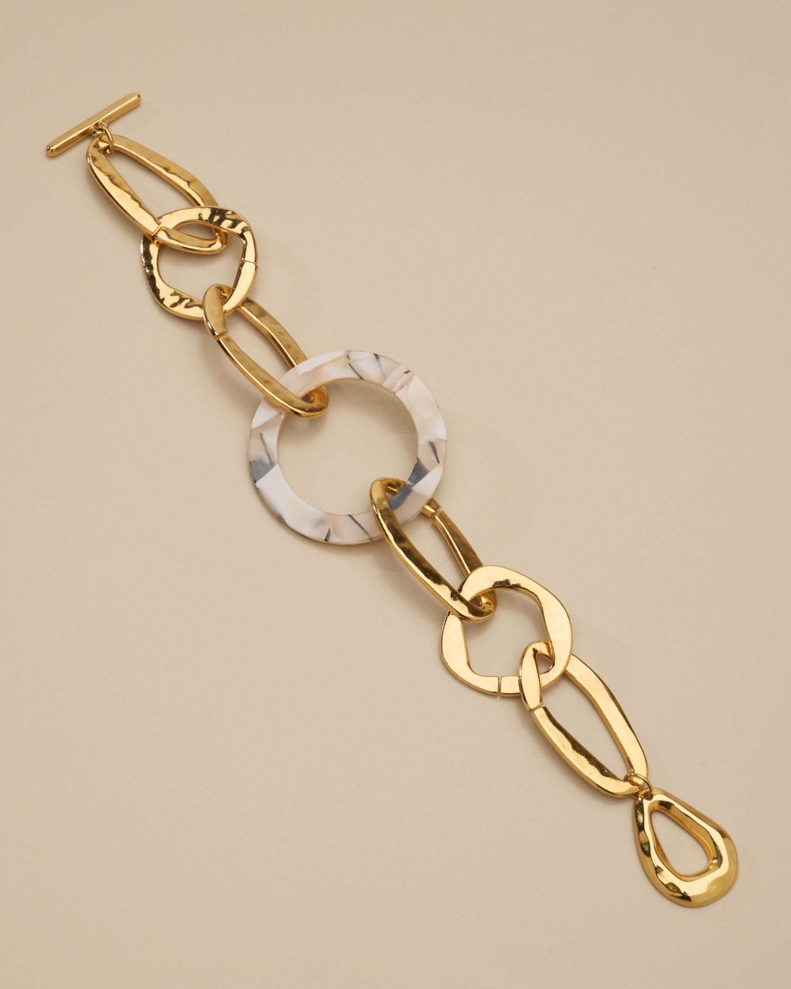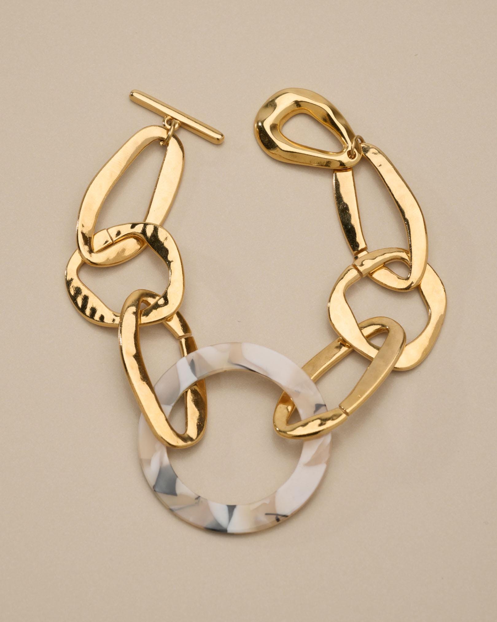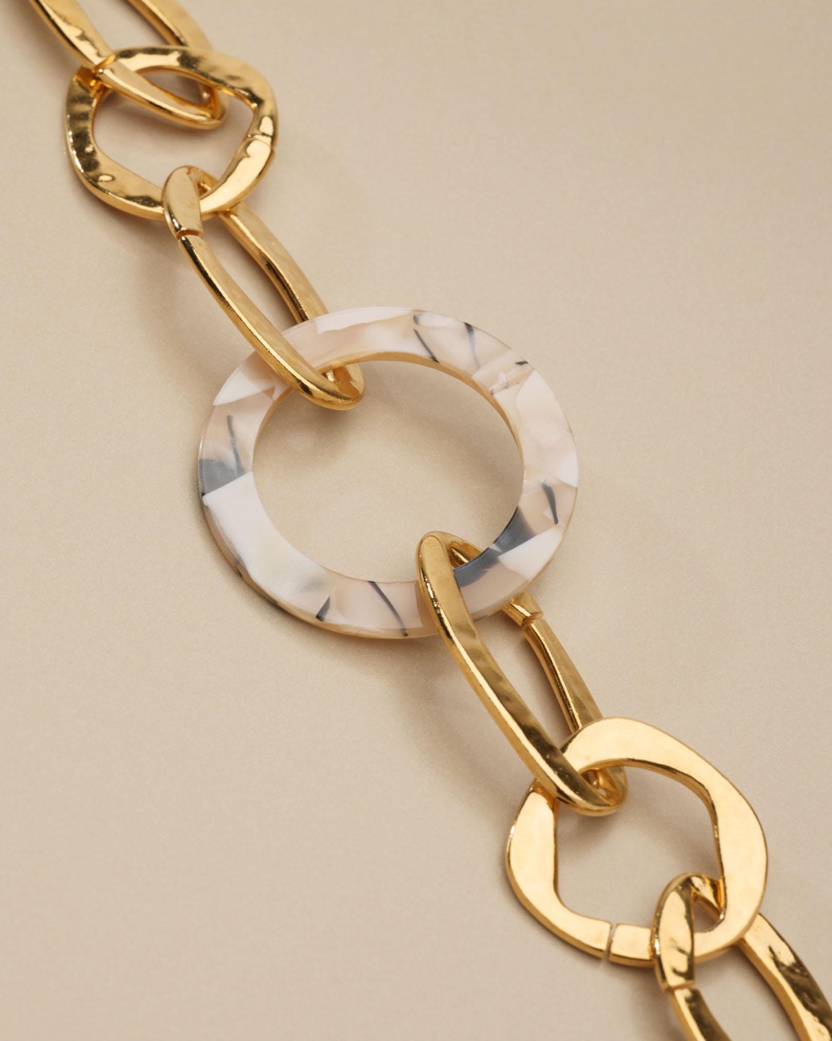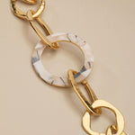 This bold gold plated chain features oversized hammered links paired with a marbled acrylic ring for contrast and dimension. The wide silhouette gives it structure and presence, while the acrylic detail softens the design with subtle movement and light.