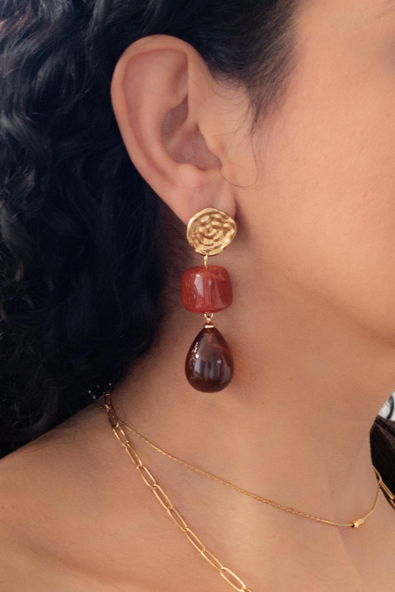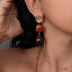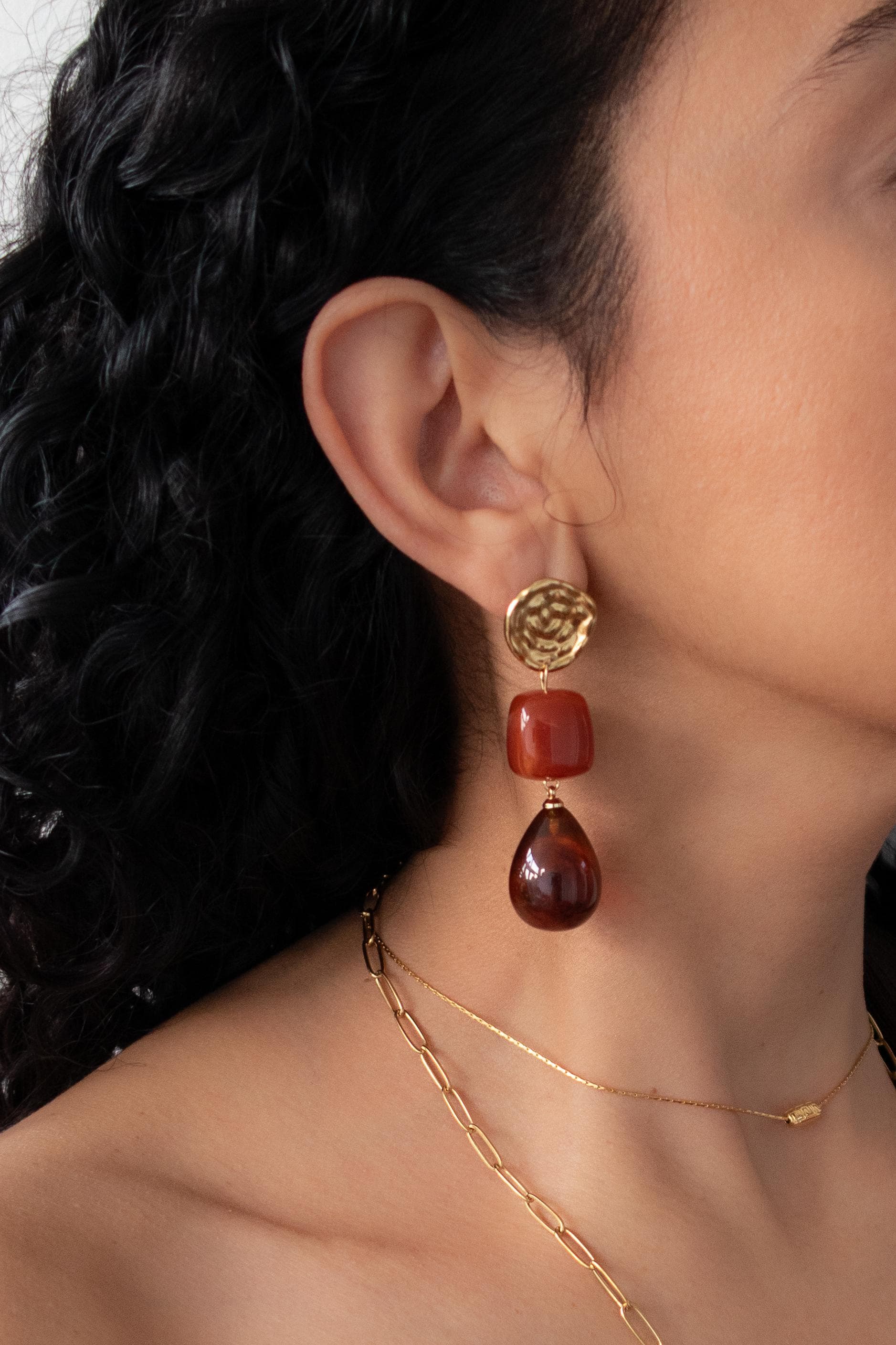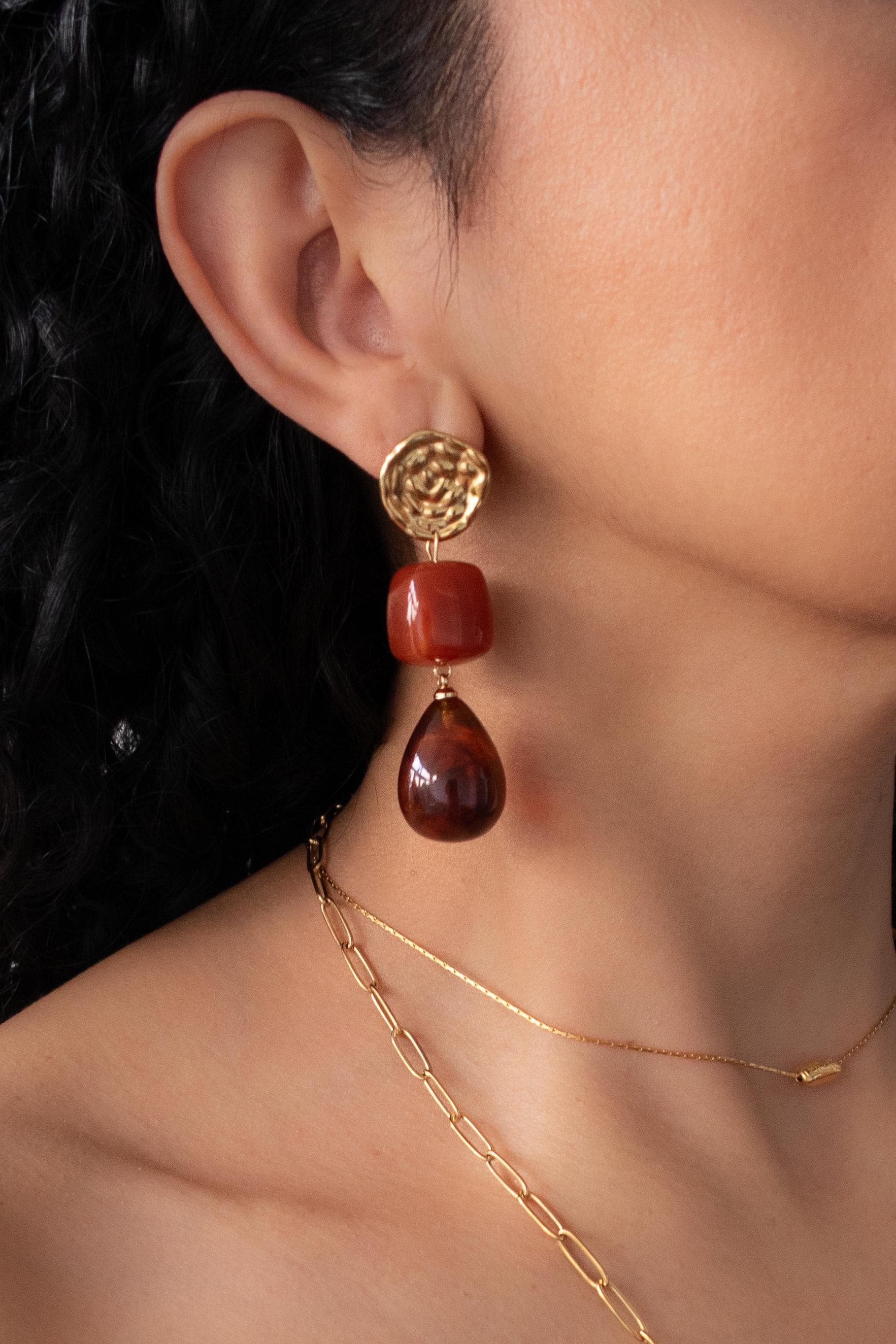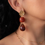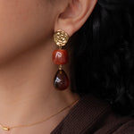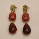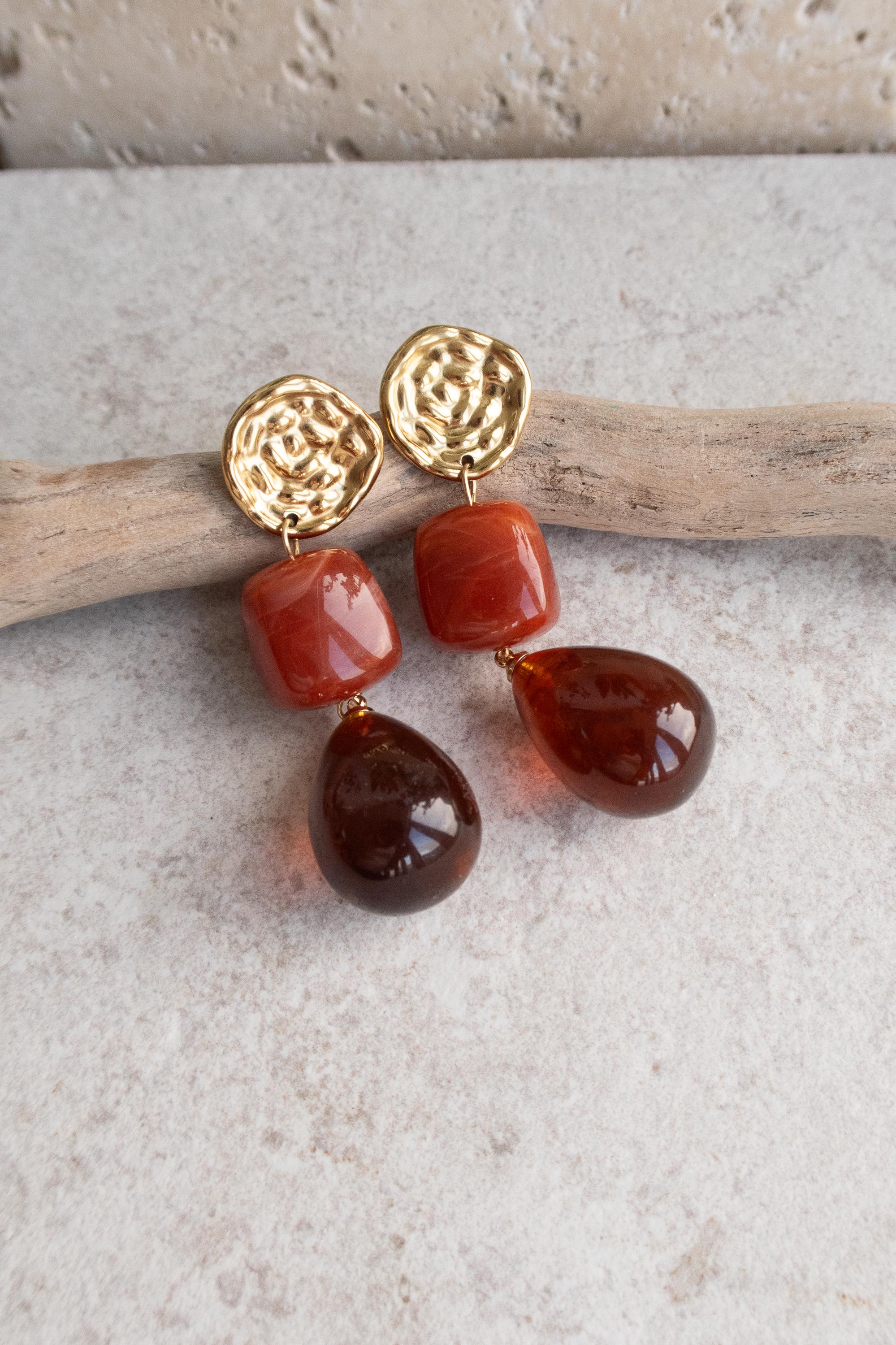 These modern gold resin drop earrings feature sculptural gold-tone studs paired with warm amber-red resin drops, creating a refined statement that feels artistic, feminine, and effortlessly elegant.