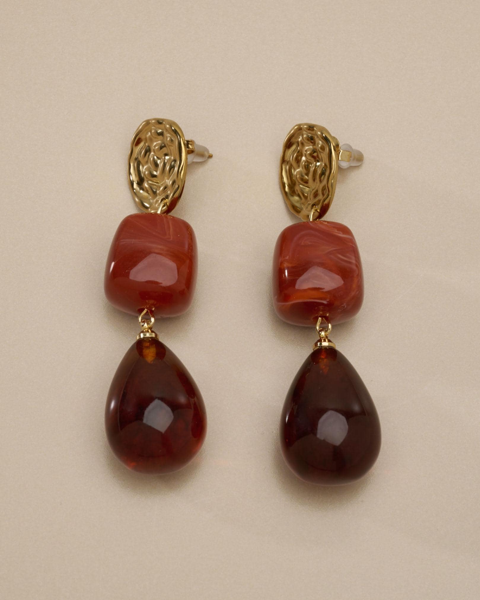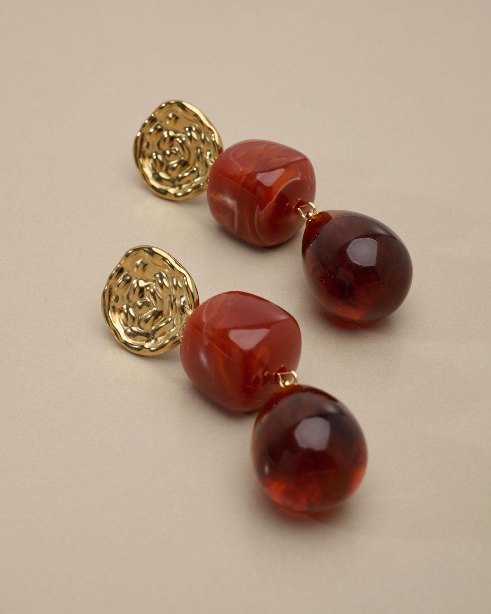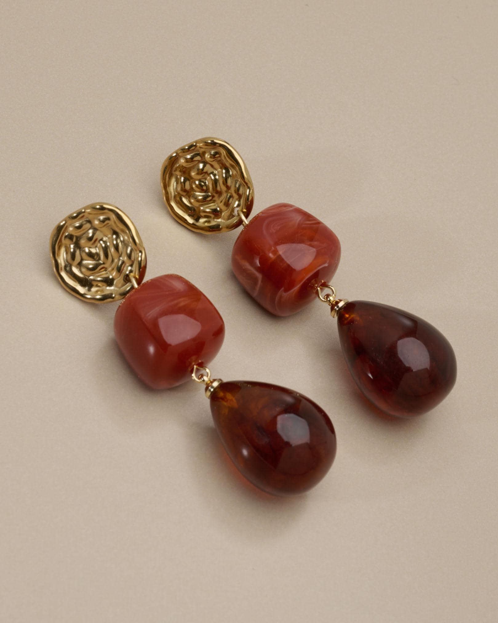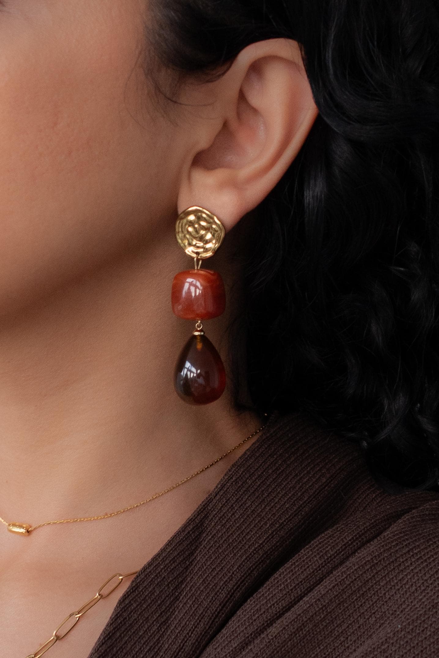 These modern gold resin drop earrings feature sculptural gold-tone studs paired with warm amber-red resin drops, creating a refined statement that feels artistic, feminine, and effortlessly elegant.