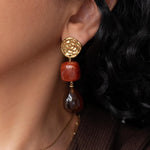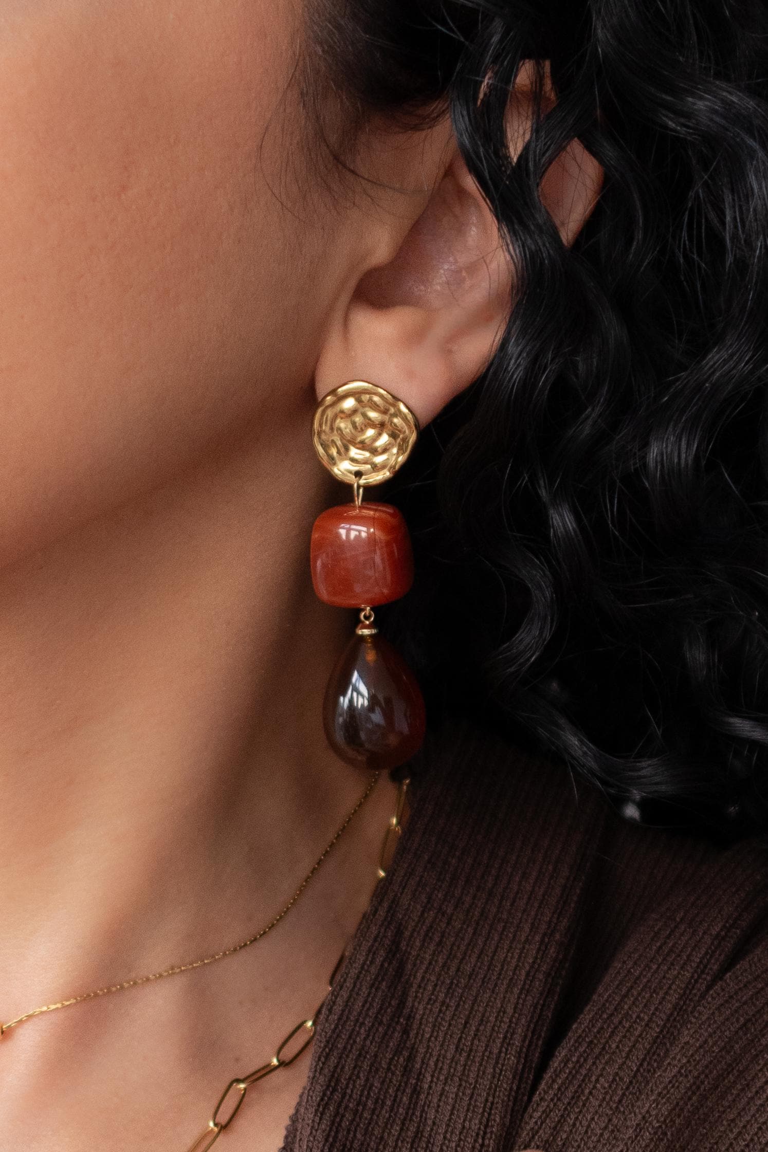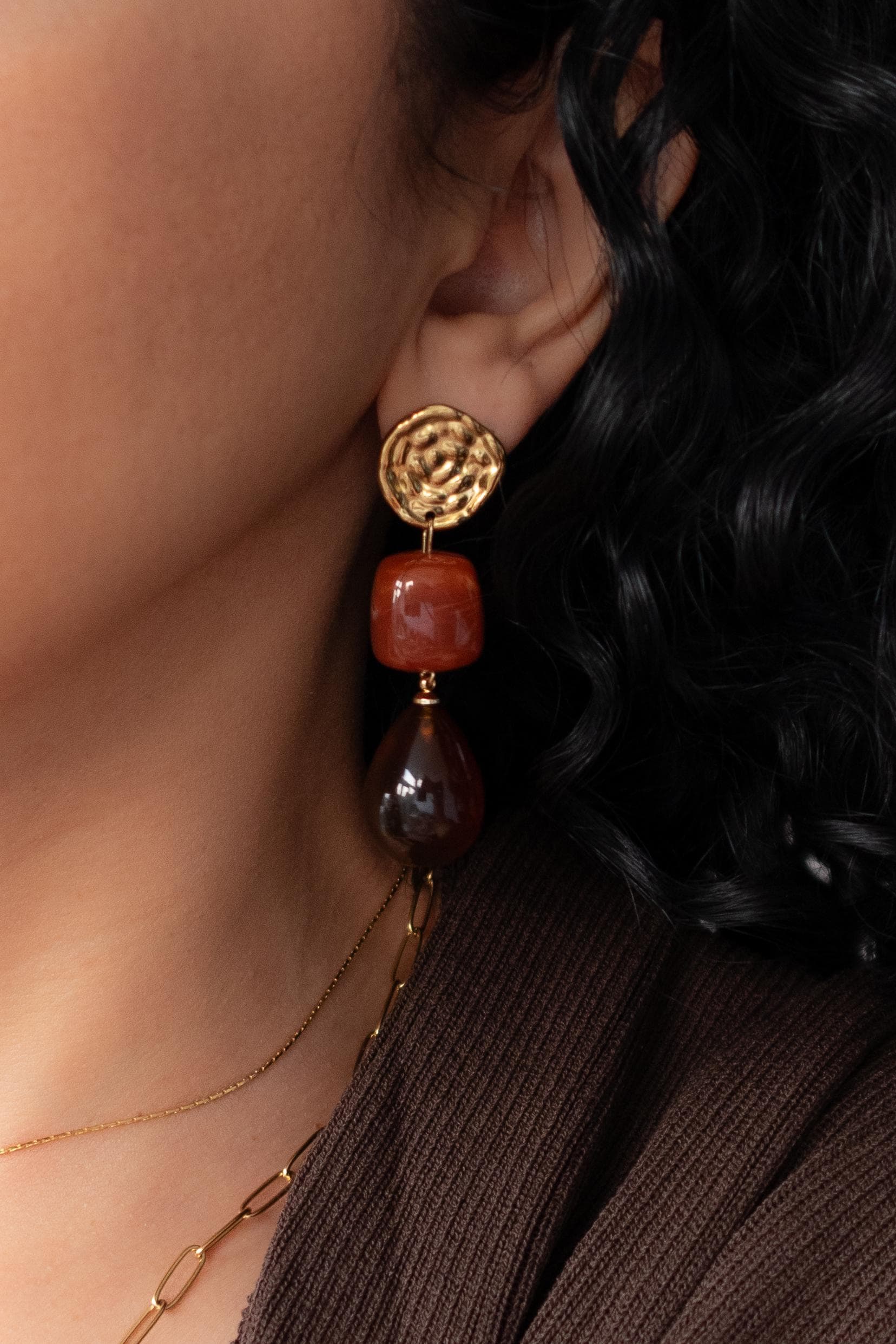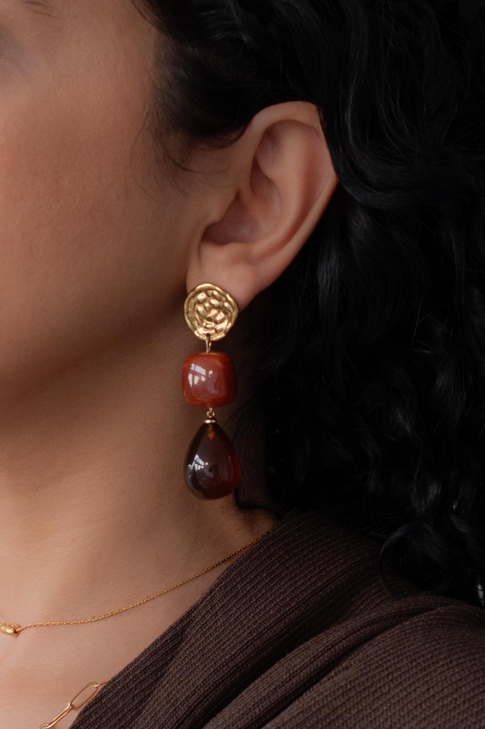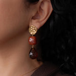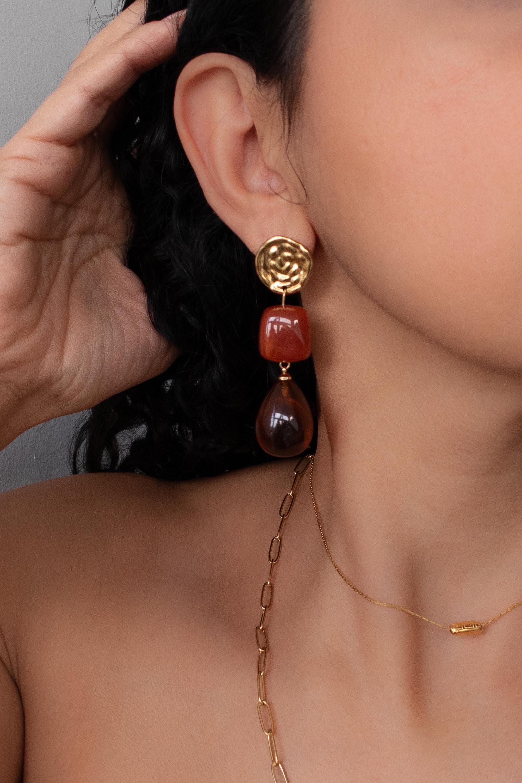These modern gold resin drop earrings feature sculptural gold-tone studs paired with warm amber-red resin drops, creating a refined statement that feels artistic, feminine, and effortlessly elegant.