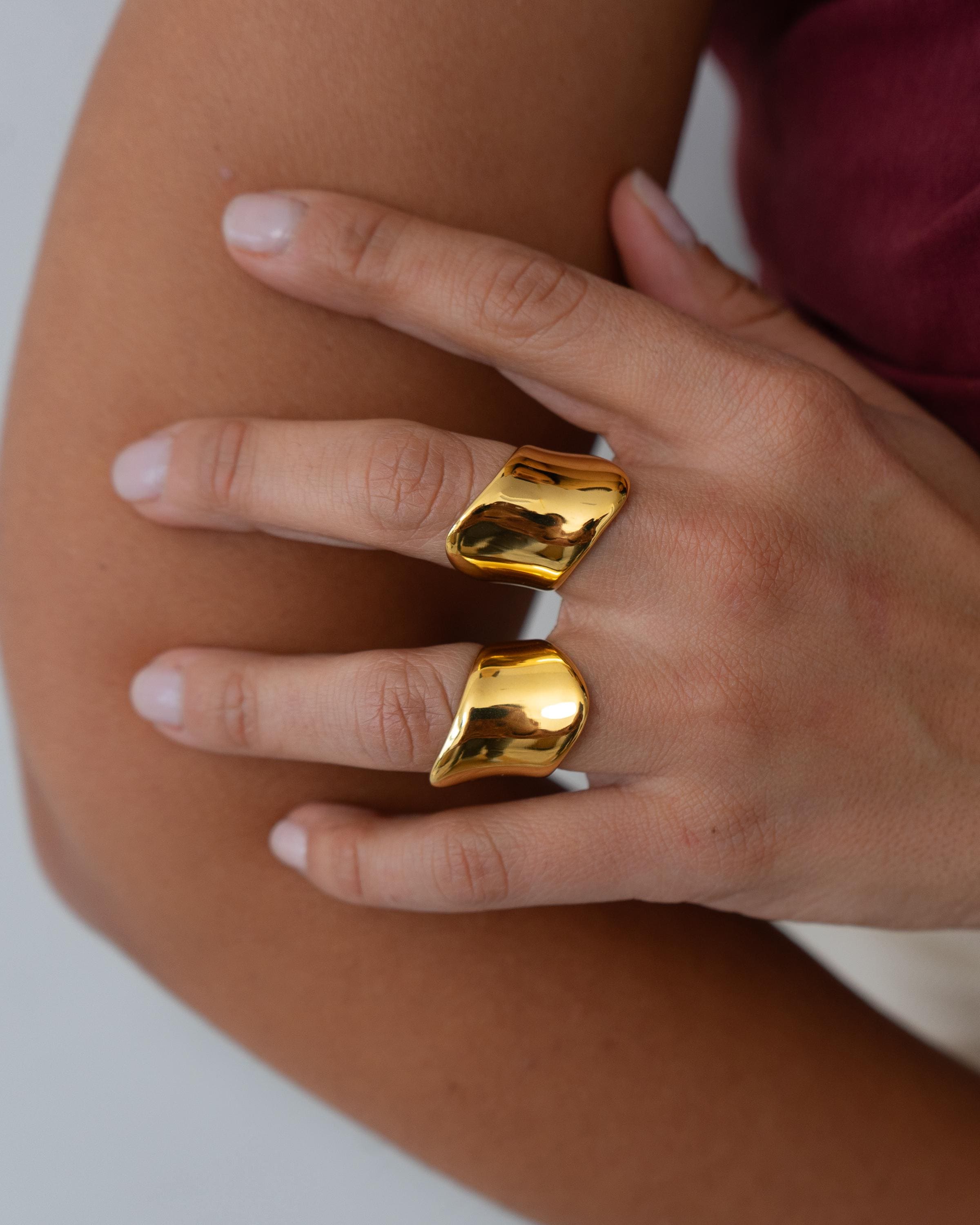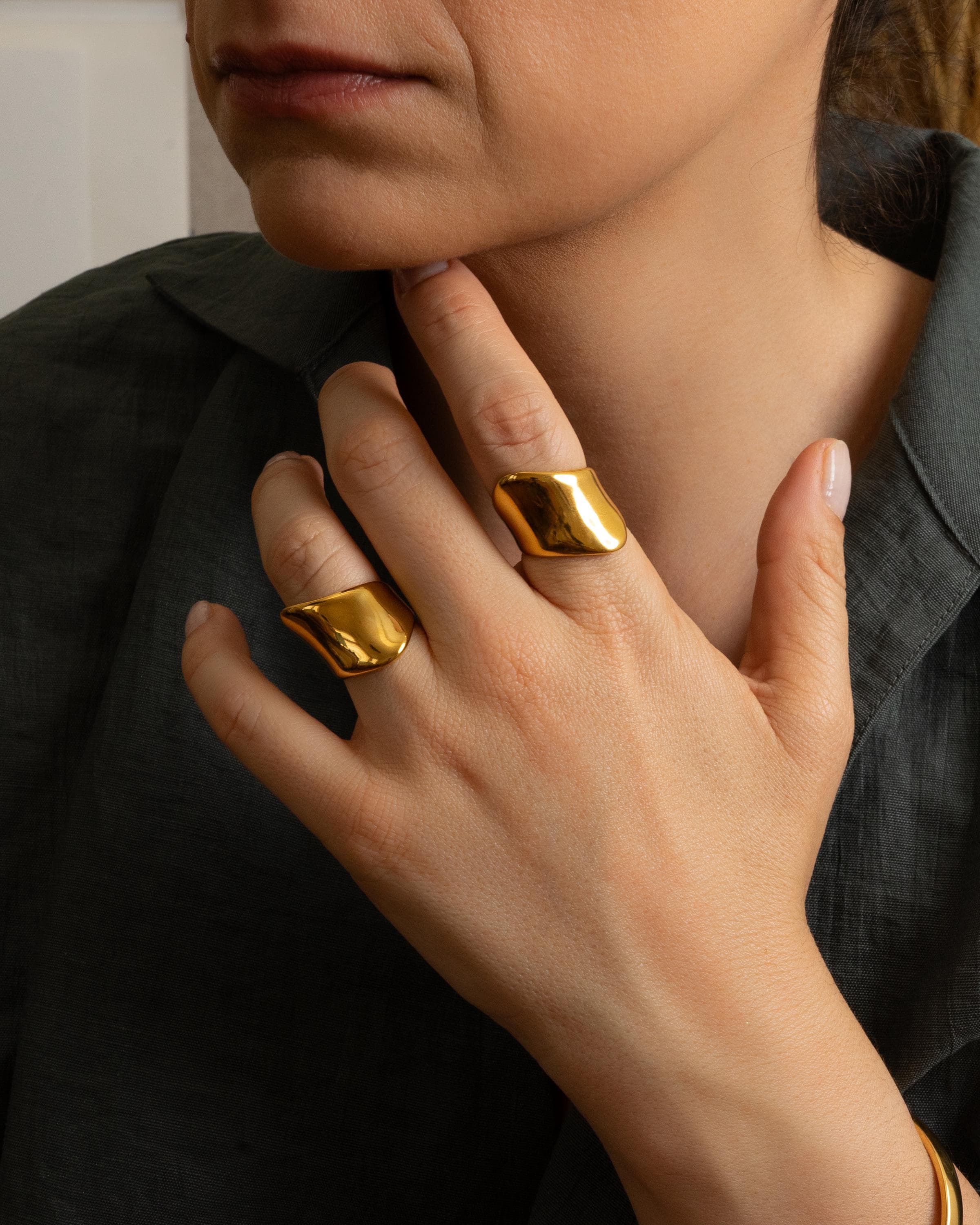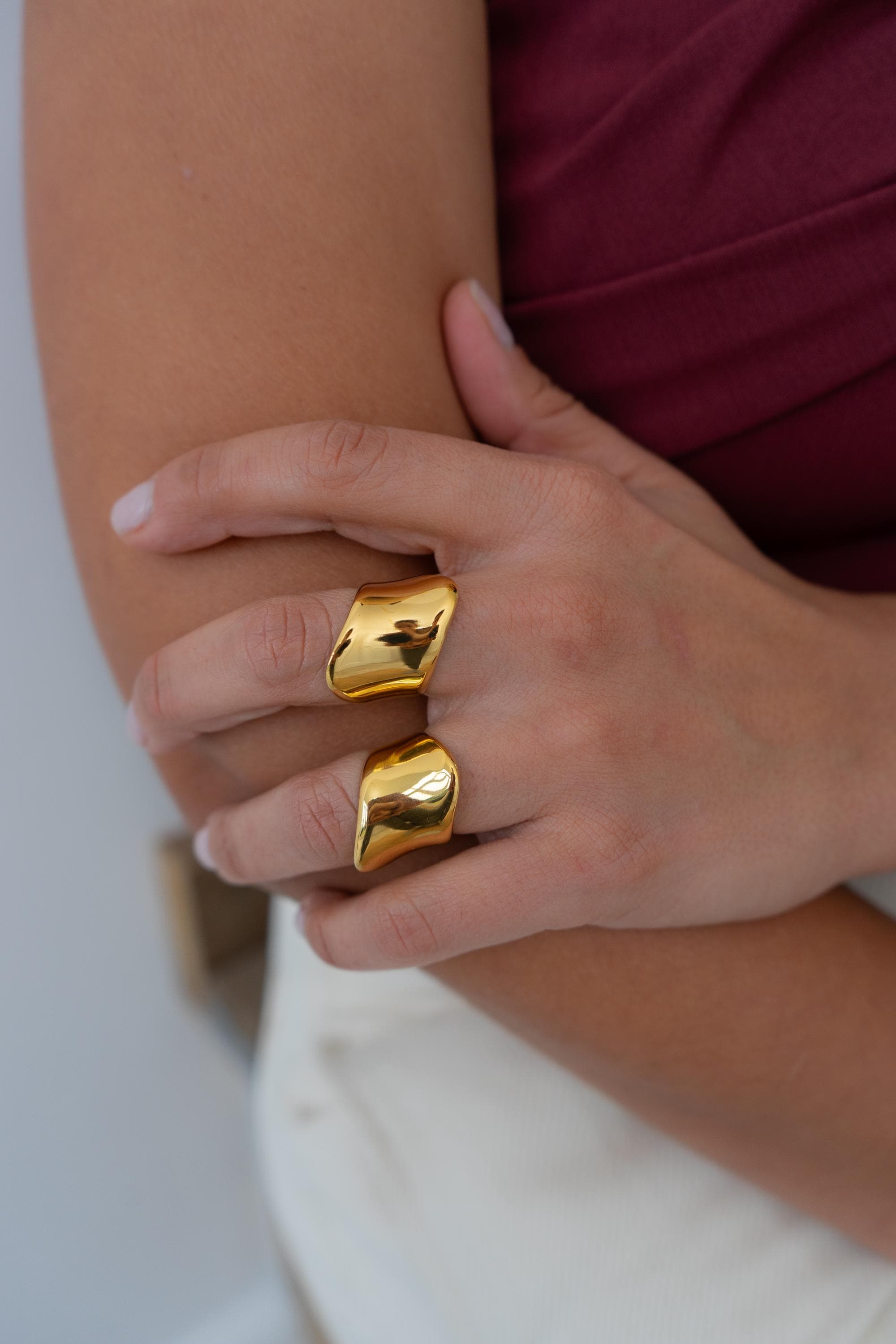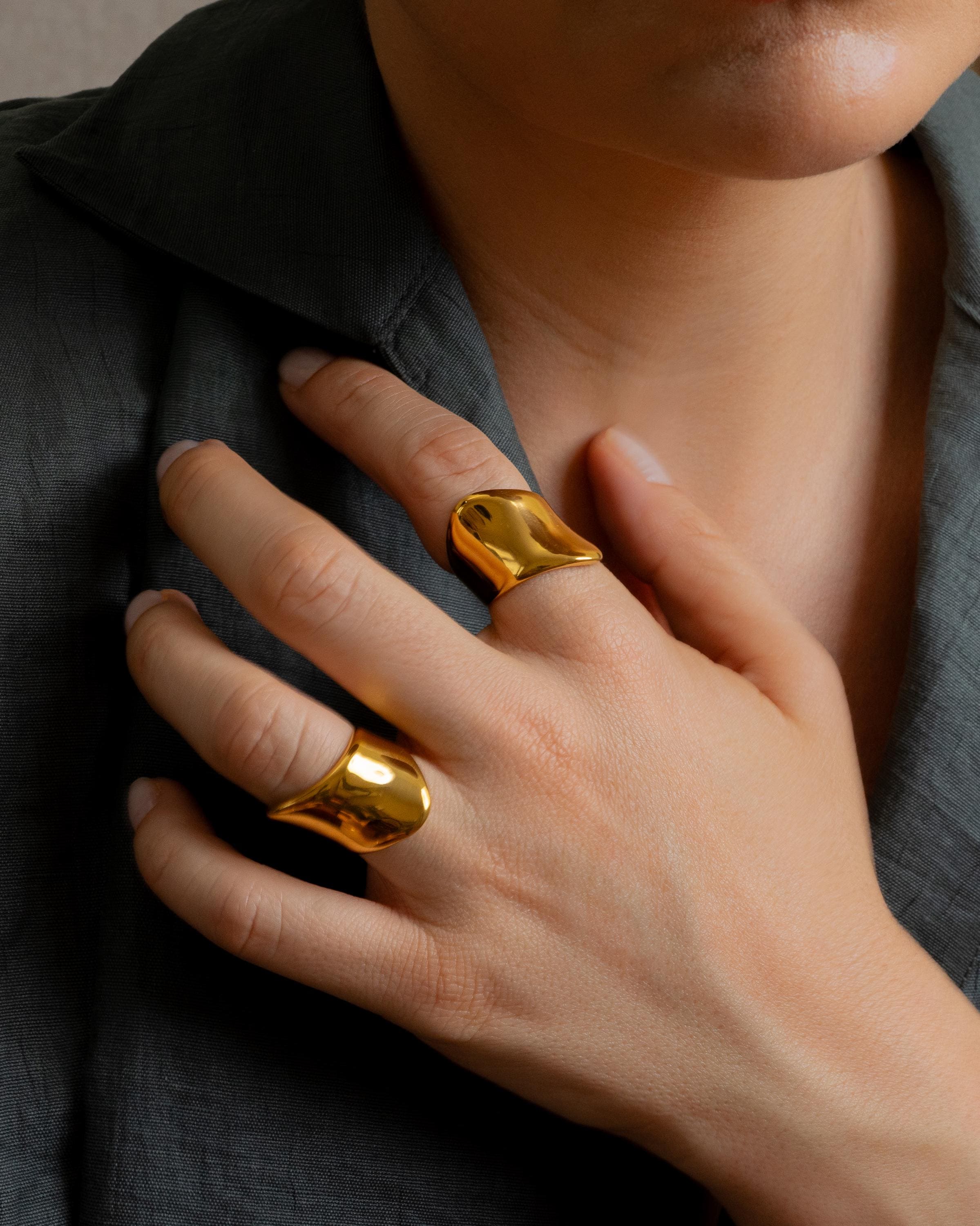 A modern sculptural ring with bold curves and a smooth mirror finish — designed to make a statement. Crafted from high-quality stainless steel and plated with gold, this piece is both durable and timeless.The ring’s wide organic shape adds an elegant, fashion-forward edge that pairs perfectly with any outfit. It’s lightweight yet striking — ideal for daily wear or special occasions.Many love styling it in pairs or trios across different fingers for a bold, layered look. Whether worn solo or stacked, this ring embodies effortless sophistication.MEASUREMENTS AND SIZE
