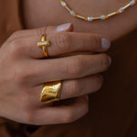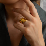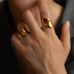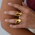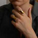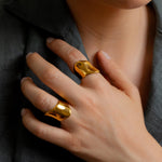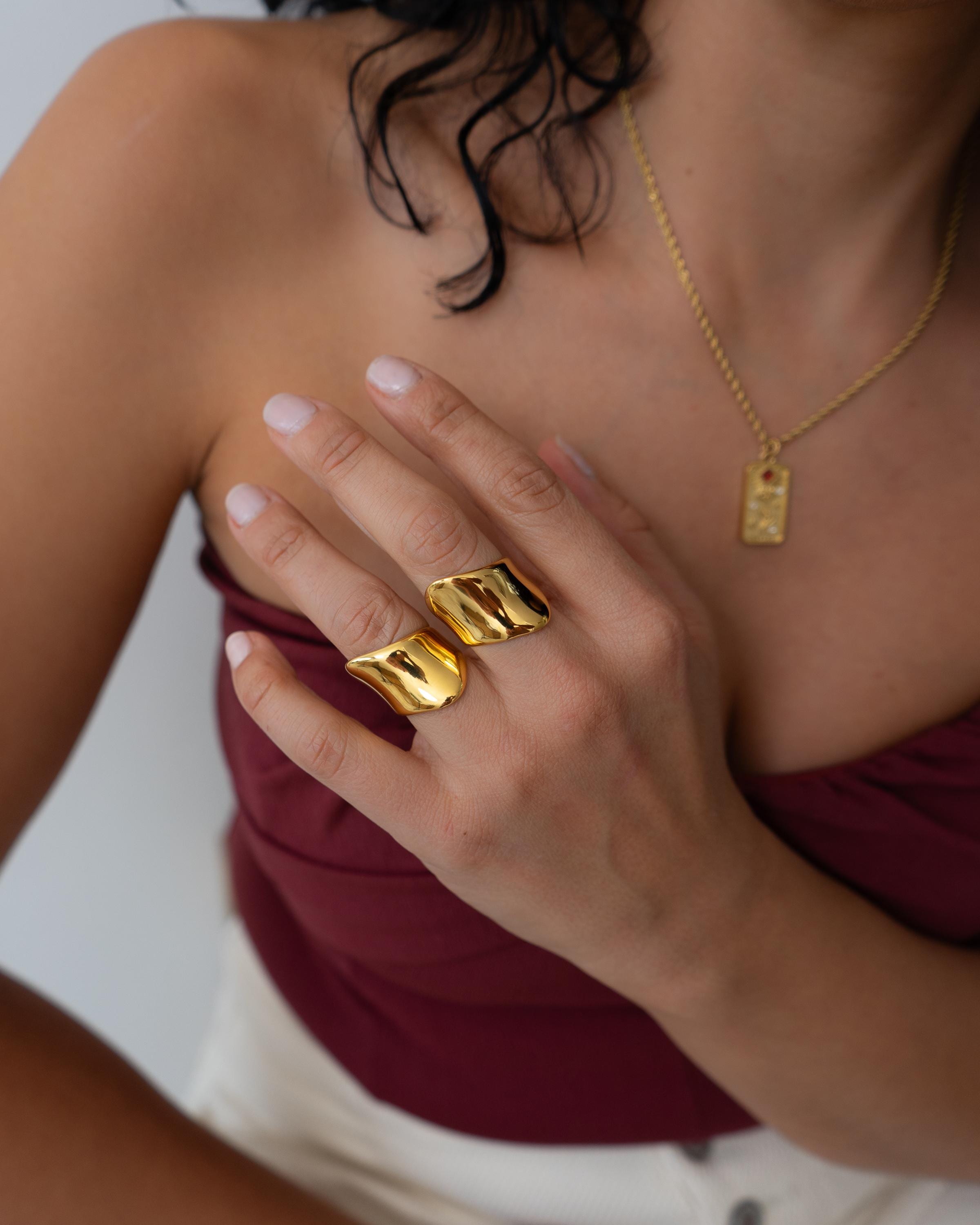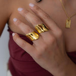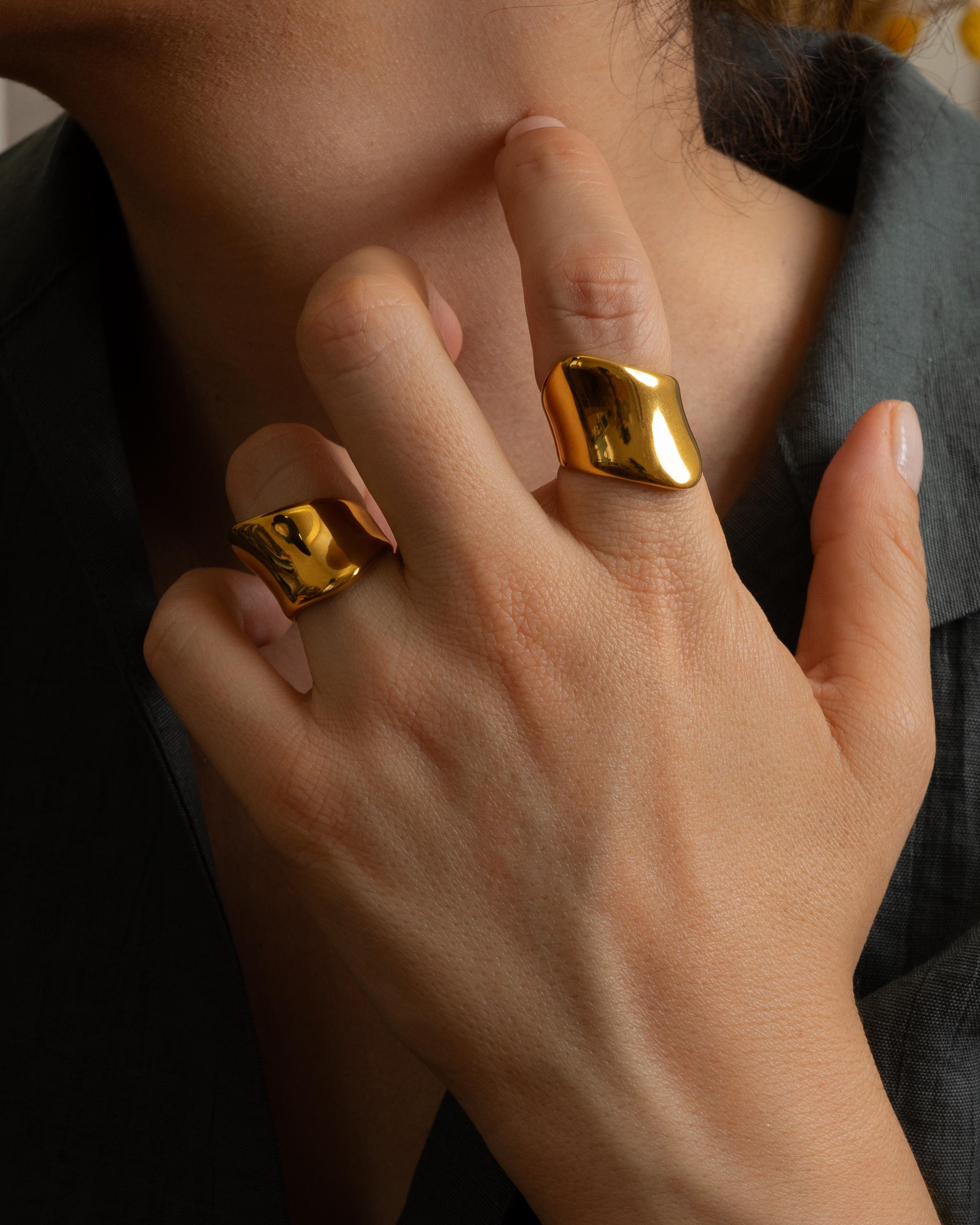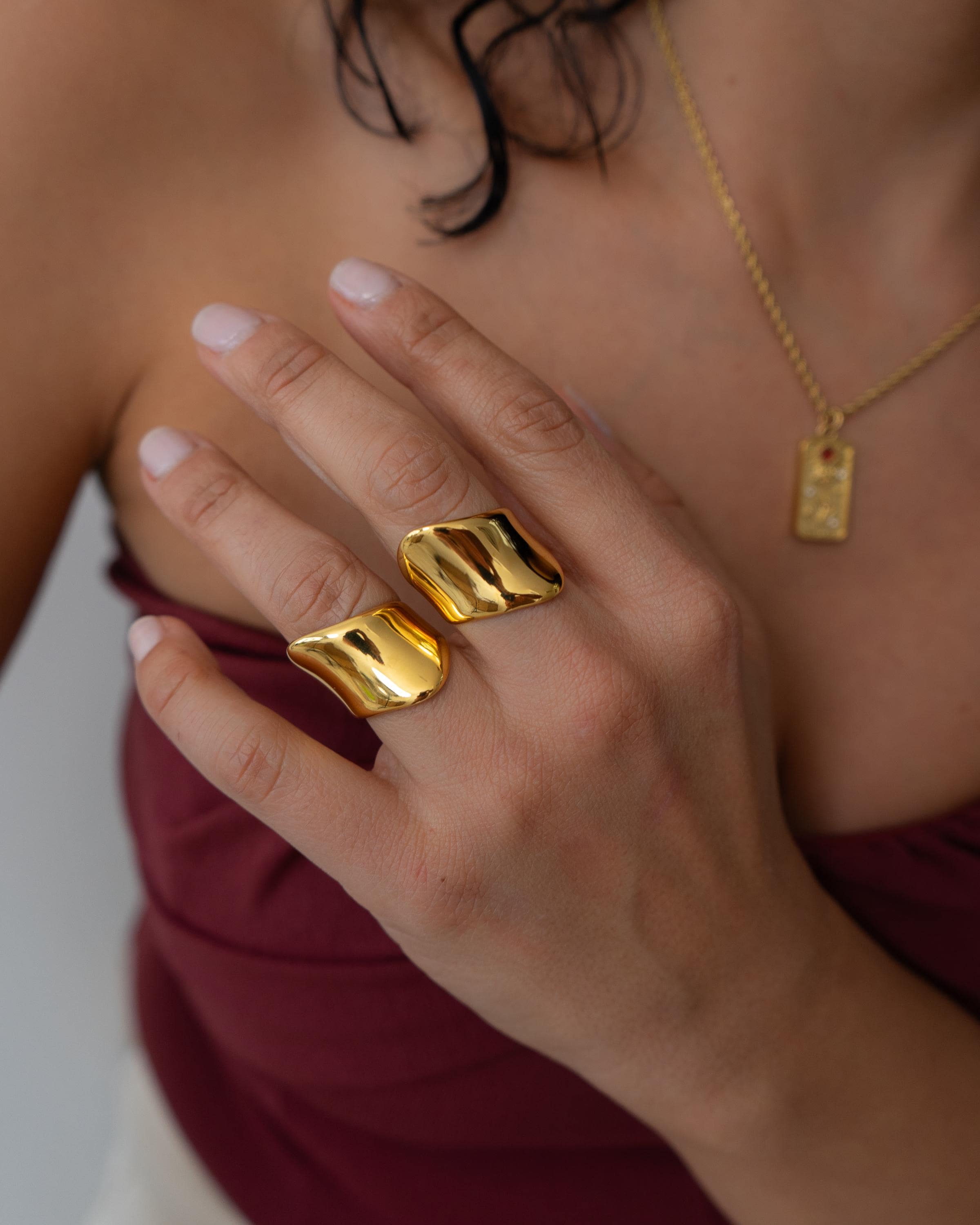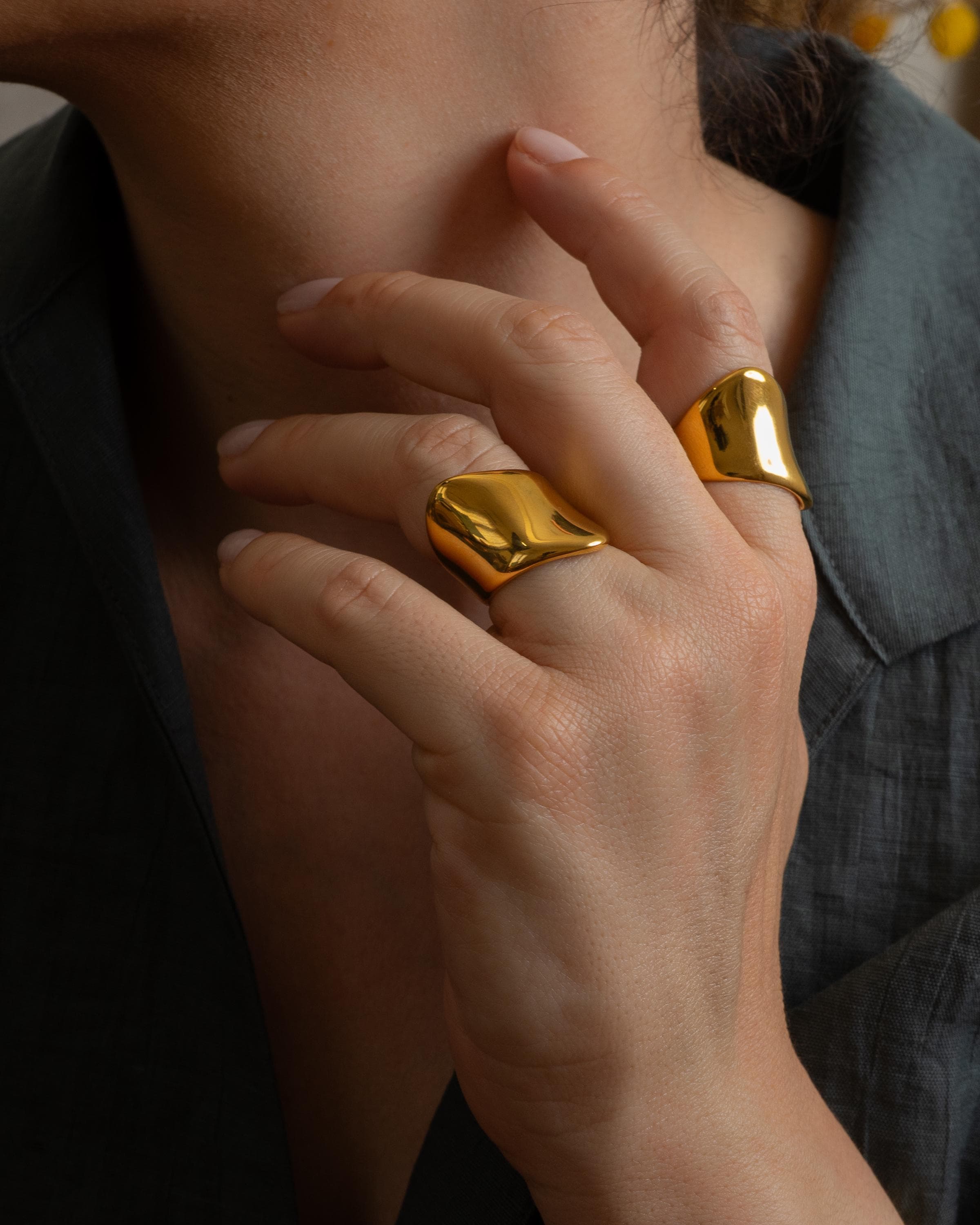 A modern sculptural ring with bold curves and a smooth mirror finish — designed to make a statement. Crafted from high-quality stainless steel and plated with gold, this piece is both durable and timeless.The ring’s wide organic shape adds an elegant, fashion-forward edge that pairs perfectly with any outfit. It’s lightweight yet striking — ideal for daily wear or special occasions.Many love styling it in pairs or trios across different fingers for a bold, layered look. Whether worn solo or stacked, this ring embodies effortless sophistication.MEASUREMENTS AND SIZE