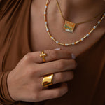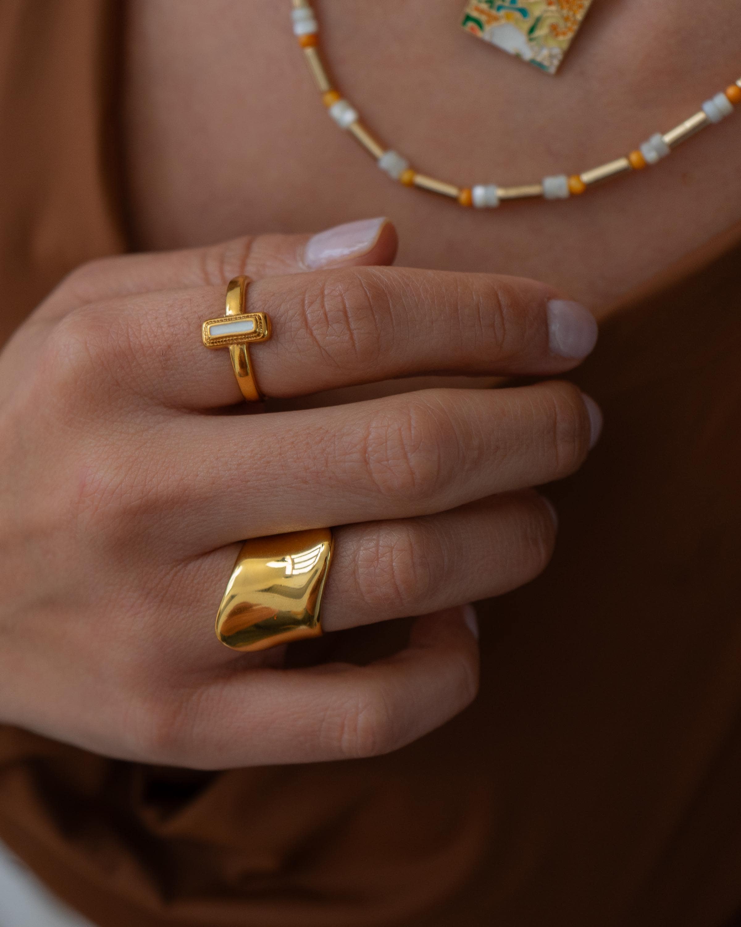 Dimensions: 27 mm x 20 mm (1.06 x 0.78 in) Weight: 6.6 g per piece Available sizes: US 6, 7, and 8Materials Stainless Steel with gold finish Hypoallergenic, waterproof, and tarnish-resistantGIFTS OF LOVE All of our jewelry come gift wrapped with love, even if you purchase it for yourself. If this is a gift we can make it even more special. Just let us know with a comment at the checkout or a message. CUSTOMIZE TO YOUR LIKING Most of our designs can be customized to your preference in size, color or even style. If you desire any alteration feel free to contact us. If you require a major alteration you must contact before placing an order. MADE WITH LOVE Our metal components are made from silver/gold/rose gold plated zamak unless stated otherwise. All our metals are lead free and nickel free. Zamak is a high quality alloy with a base metal of zinc and alloying elements of aluminium, magnesium, and copper. It is a hypoallergenic material that gets dipped in silver and gold. We use the finest quality of leather, faux leather, silk, cotton elastic string and crystals to make high quality, safe and durable jewelry. Please note that color and size of products may vary slightly as we use semi precious stones and metal casting products which are not all exactly the same. Many of the semi precious stones and the gemstones are being coated to improve their natural color and luster. This is a common practice in the cutting and treatment of the gemstones and it doesn’t lower their quality. Avoiding contact with any chemicals, strong perfumes or water will help you preserve their beauty. All natural stones are subject to natural inclusions and vary slightly in colour and cut. CARE INSTRUCTIONS All metal tarnish over time, even pure silver. Gold/silver plated findings (charms, pendants, clasps, beads, chains, jump rings etc) may tarnish if they are exposed to humidity for an extended time, or if they get in contact with alcohol, which is found in perfumes. To preserve longevity, store your jewelry in a dry place and avoid spraying perfume or alcohol based body lotion near them.SHIPPING All orders are shipped from Athens, Greece via ELTA postal service, packed in protective bubble mailers. We use International and Domestic Priority Mail. International Priority mail is normally delivered to European Union countries in three working days following the day of their posting, and to the rest of the World in 3-5 days. Delivery times depend on delivery times within the destination country, as determined by the Postal Service of each country. For more information on our shipping and policies please click hereREFUNDS, EXCHANGES AND CANCELATIONS: A mistake on our part will be refunded 100% along with all shipping costs. If for any reason you are not happy with your purchase, we will gladly accept returns or exchanges. If you want to return any item, please contact us before posting it. Buyers are responsible for the shipping costs of the returned item. Please note that shipping costs are not refundable.GET TO KNOW US Lets connect on your favourite social platform: - Instagram: @houseofasterodea, http://bit.ly/2JAKASW - Facebook: fb.me/HouseOfAsterodea - Pinterest: www.pinterest.com/ houseofasterodea
