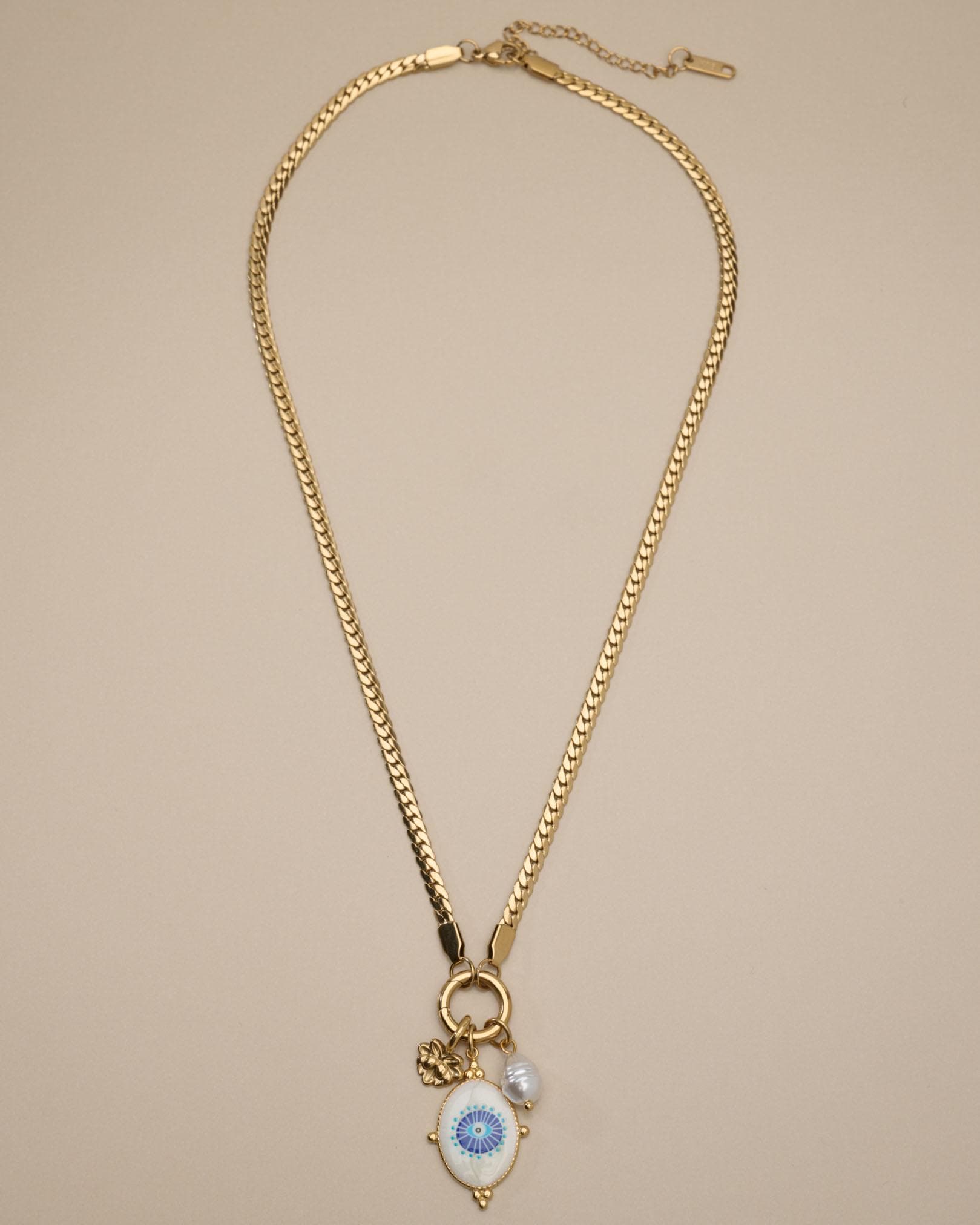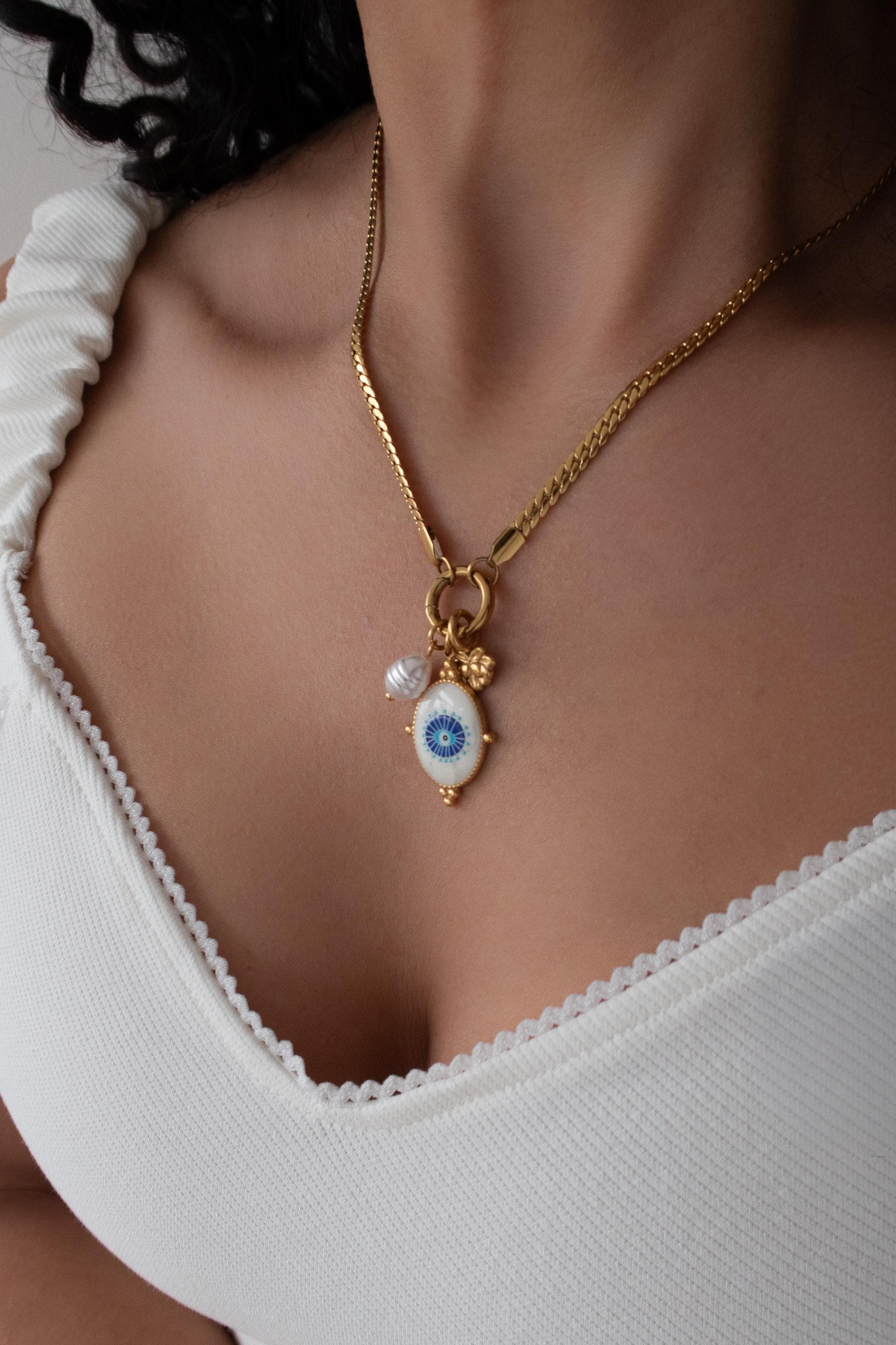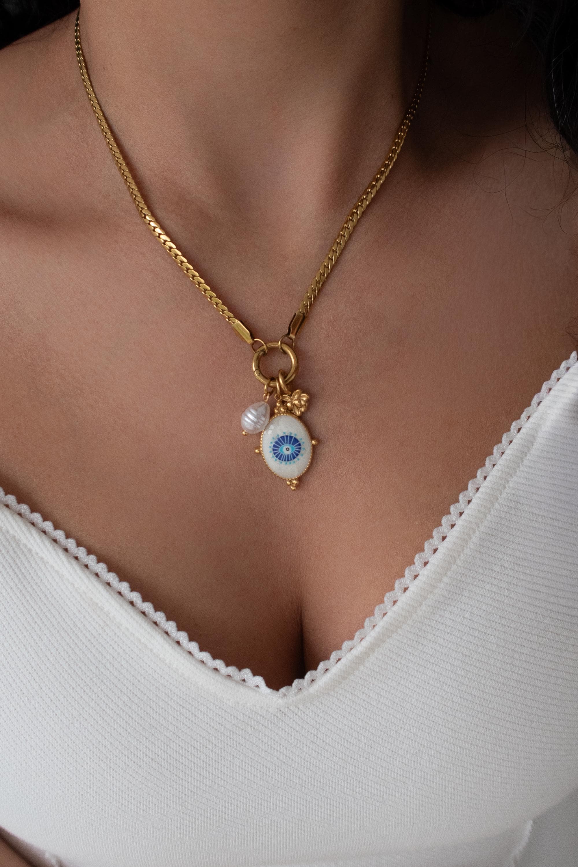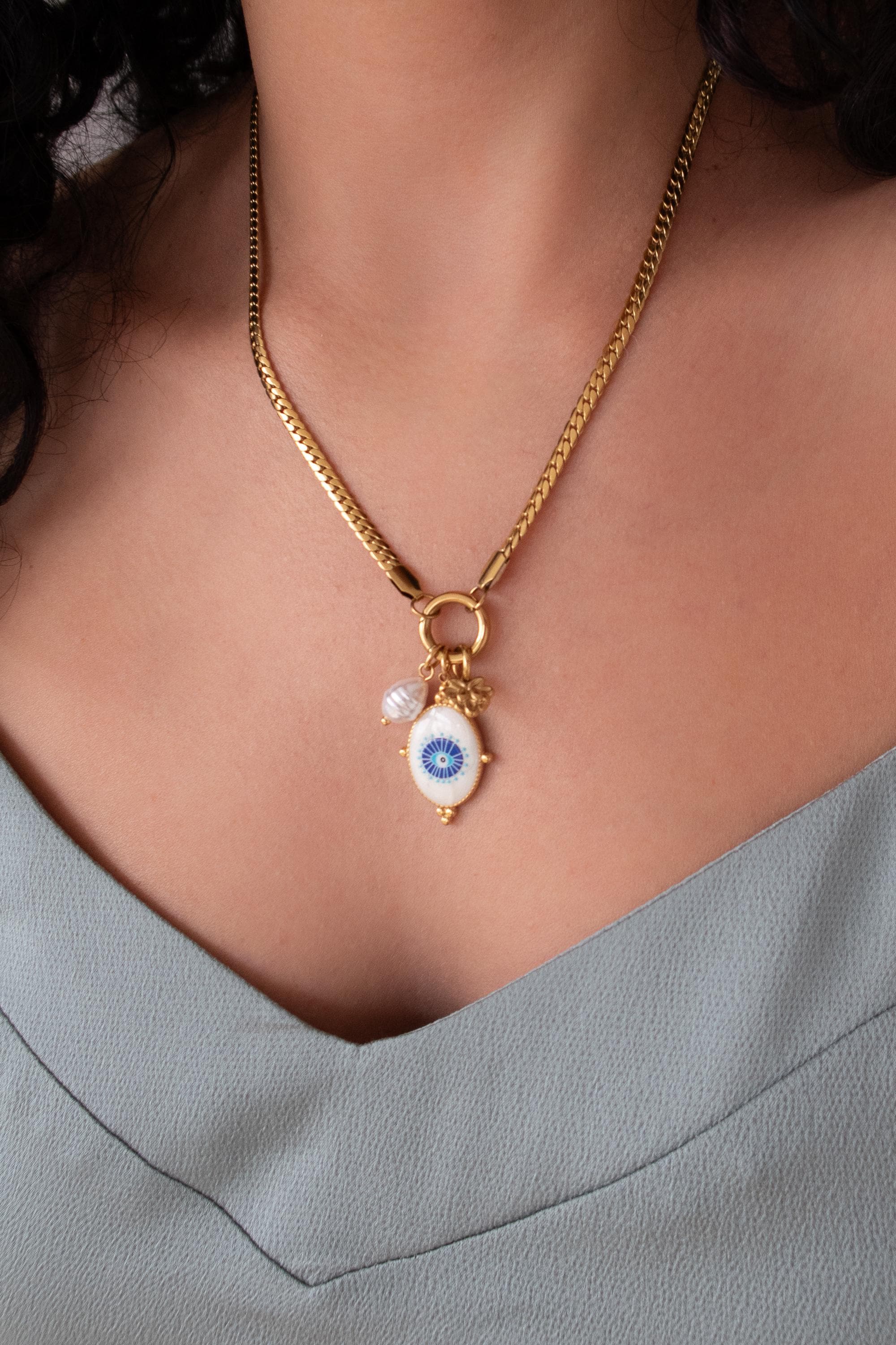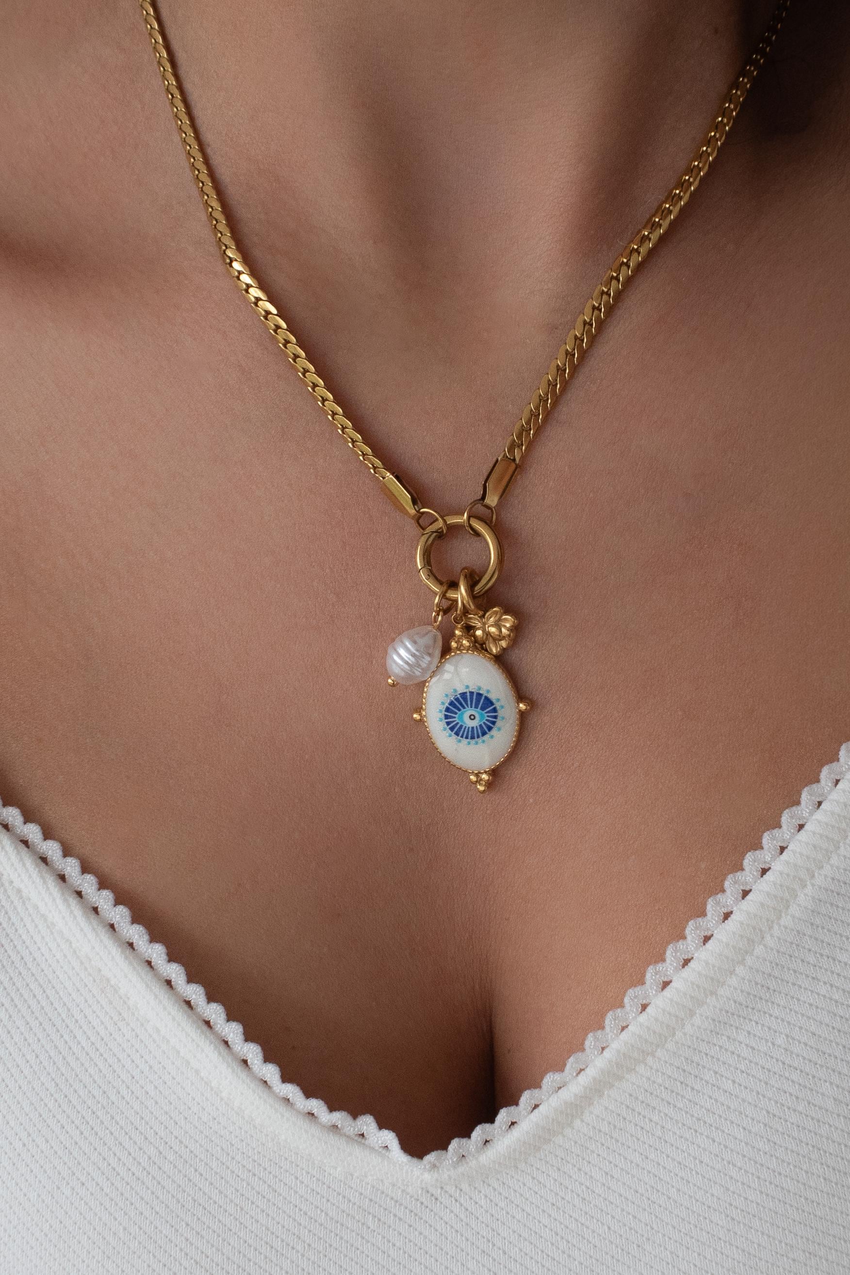 A modern evil eye necklace designed to be worn your way. This interchangeable necklace features a front clasp that allows you to easily add, remove, or layer charms from your own collection. At its centre is a symbolic evil eye charm, traditionally worn for protection and positive energy.