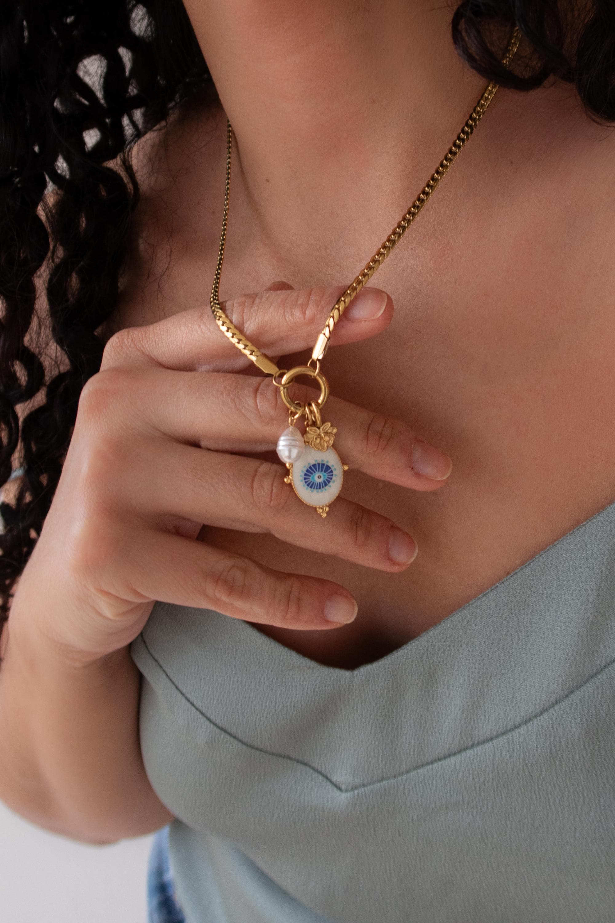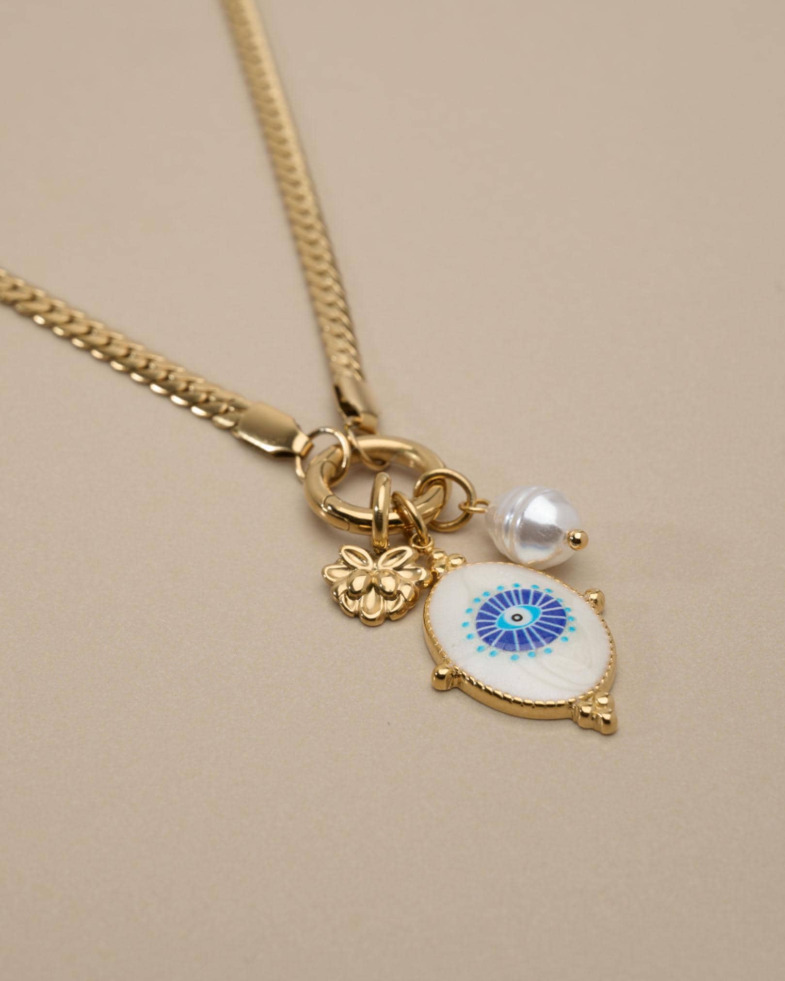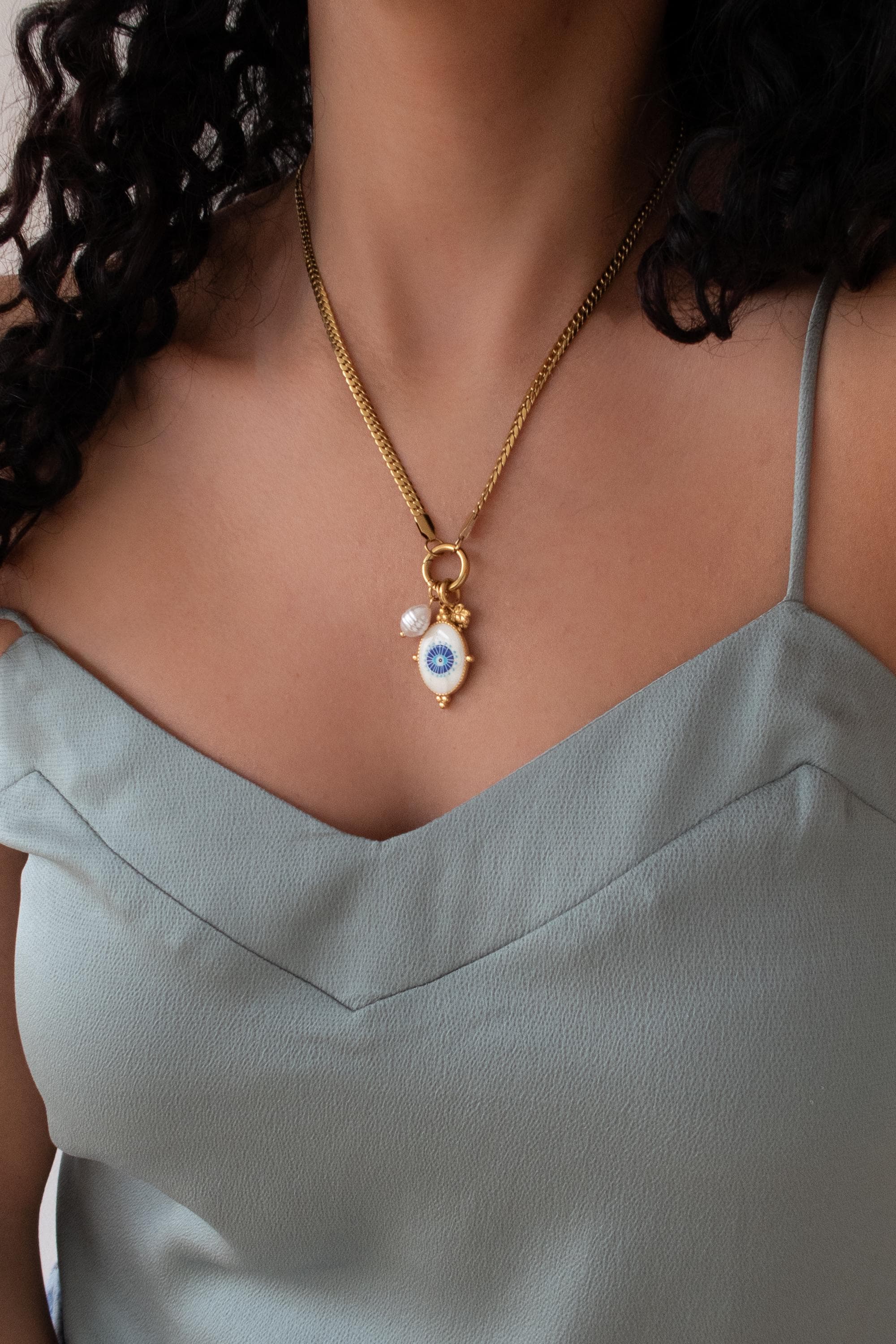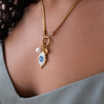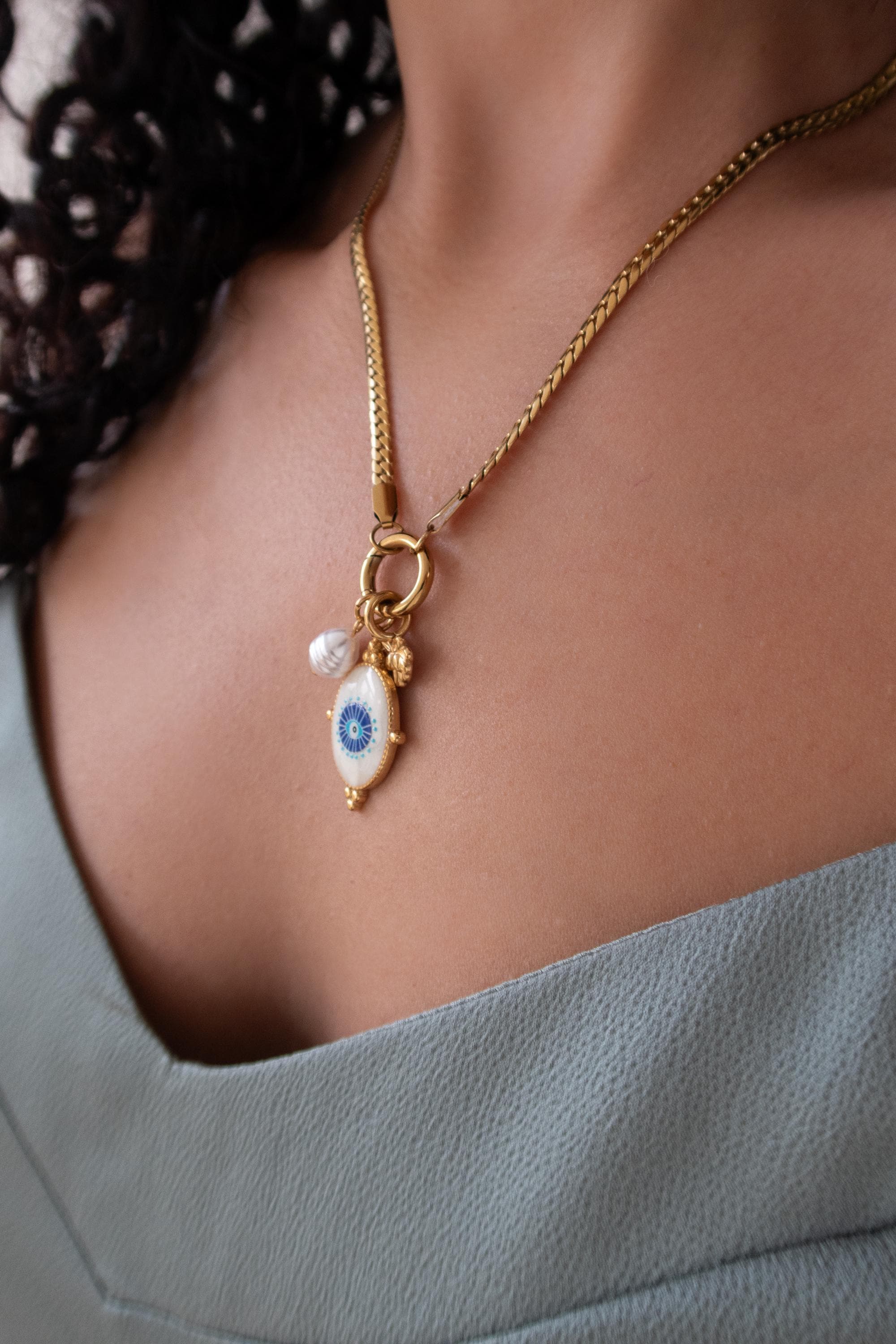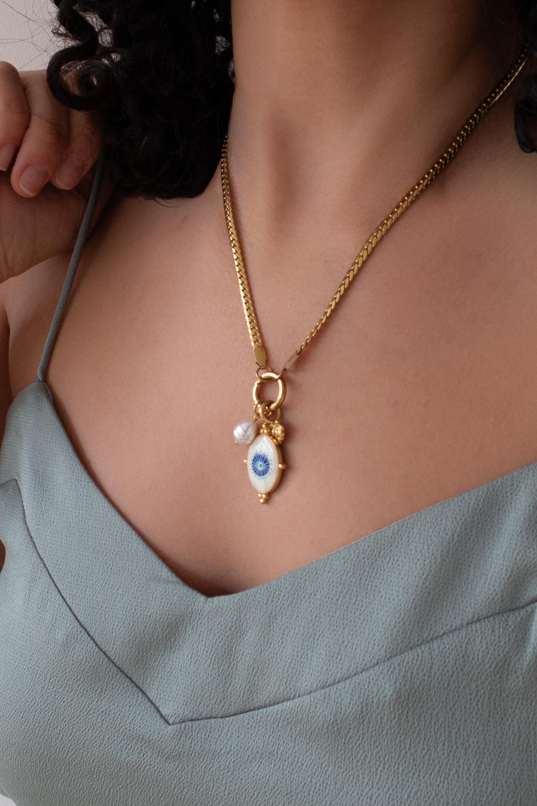 A modern evil eye necklace designed to be worn your way. This interchangeable necklace features a front clasp that allows you to easily add, remove, or layer charms from your own collection. At its centre is a symbolic evil eye charm, traditionally worn for protection and positive energy.