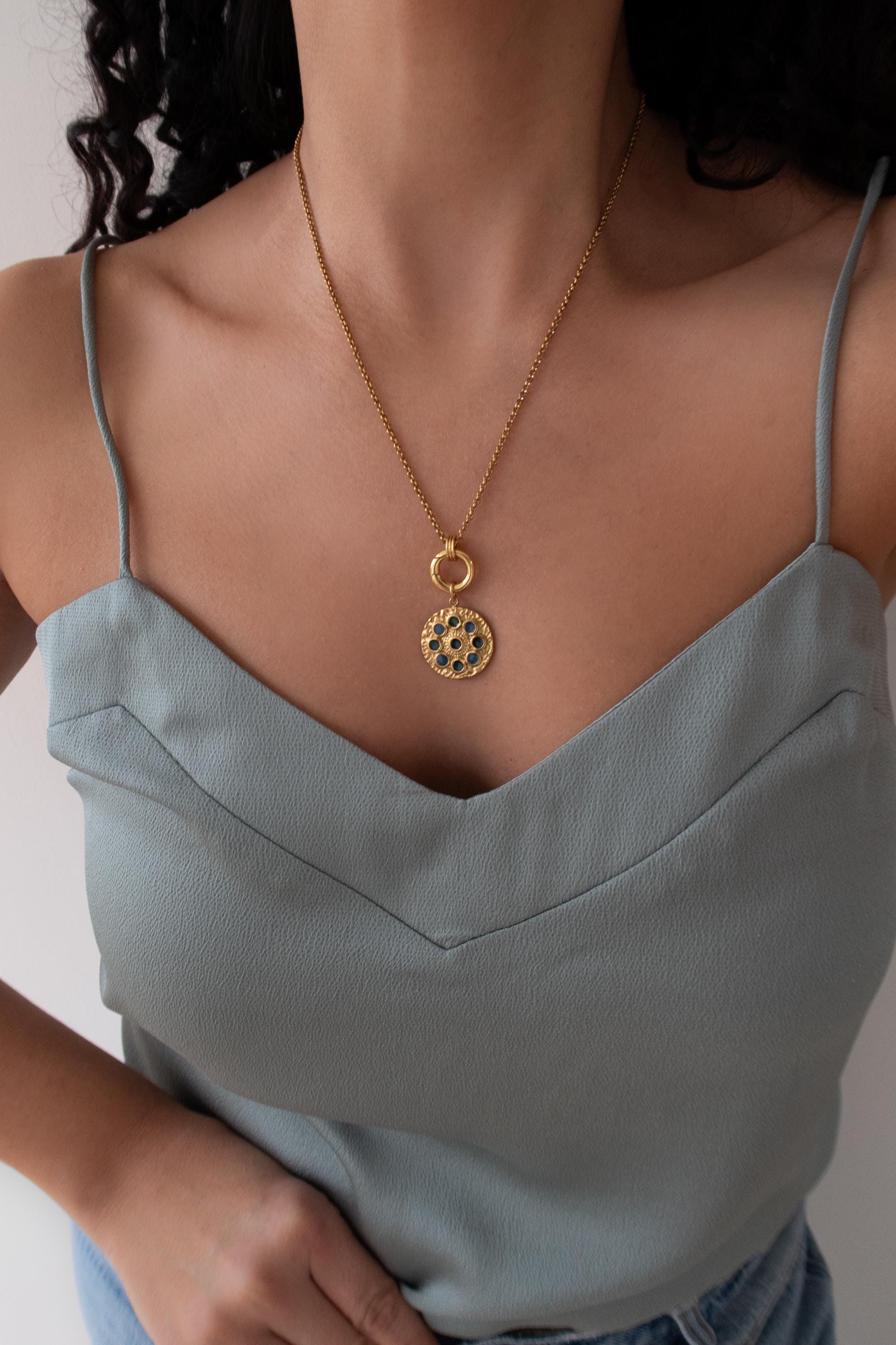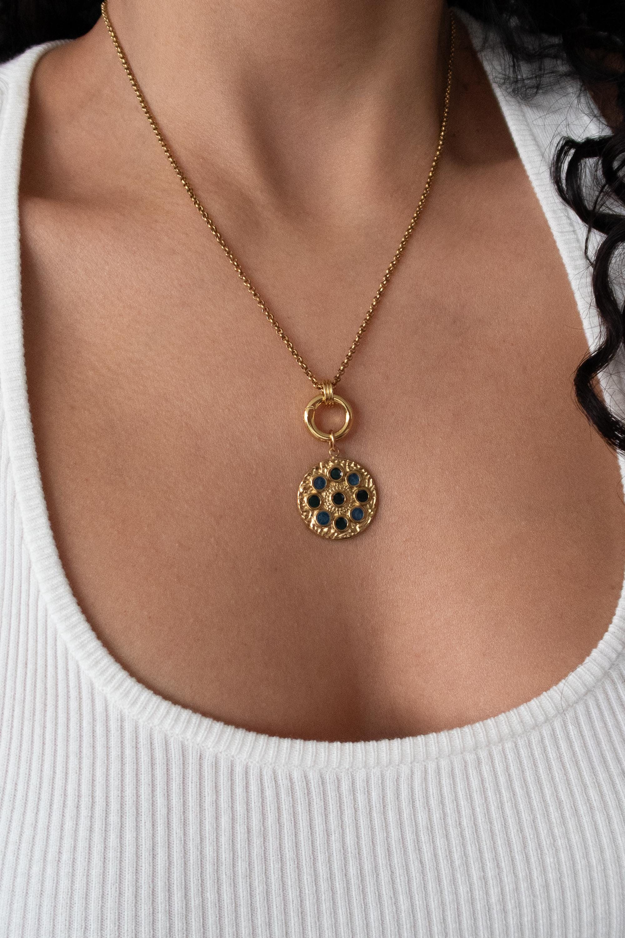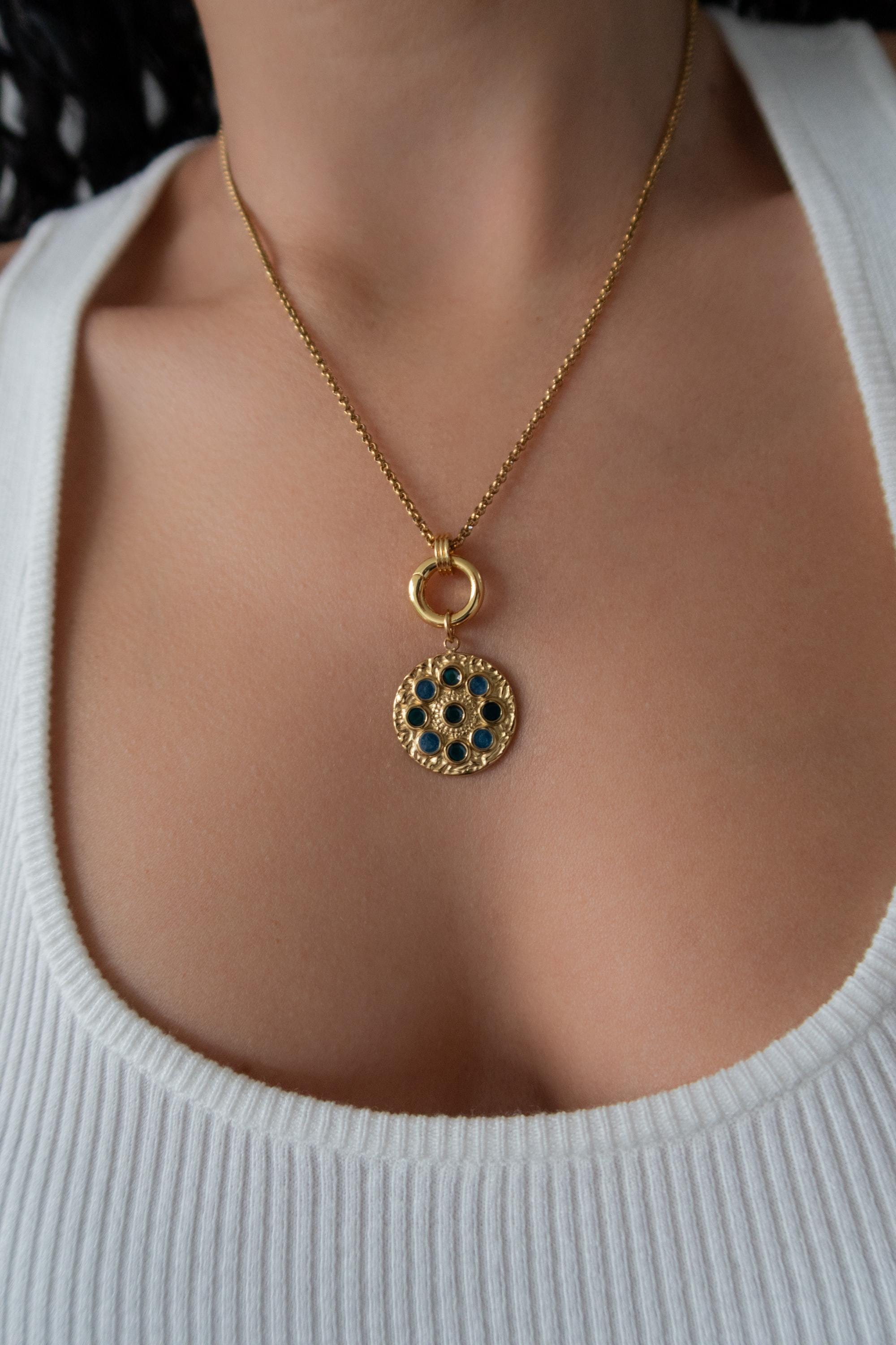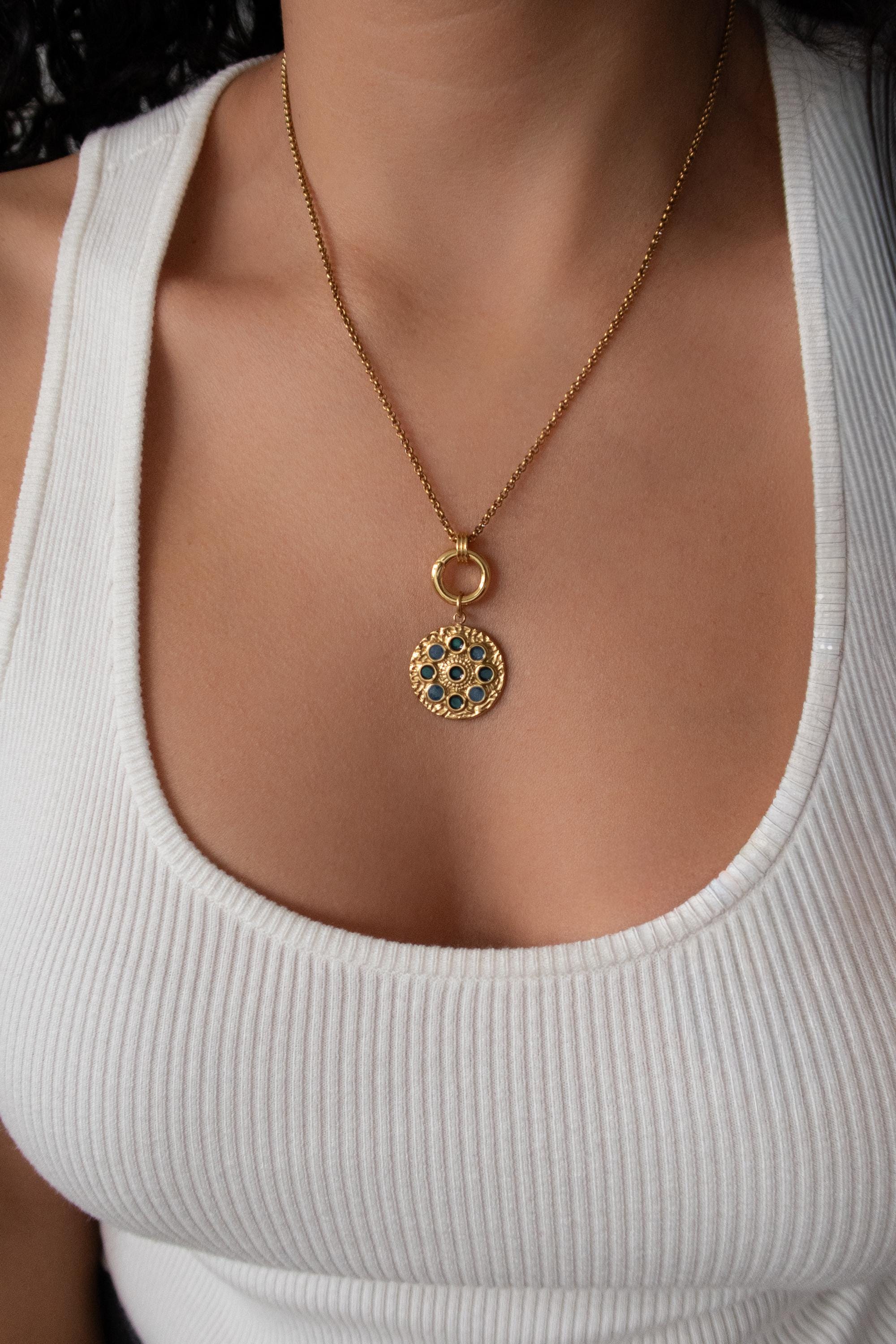• Elegant circular pendant with subtle rhinestone detail • Gold-tone chain with front clasp • Interchangeable charm design • Evil eye charm as shown • Additional charms can be added or removed • Lightweight and comfortable for daily wear