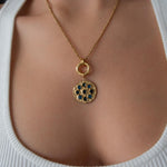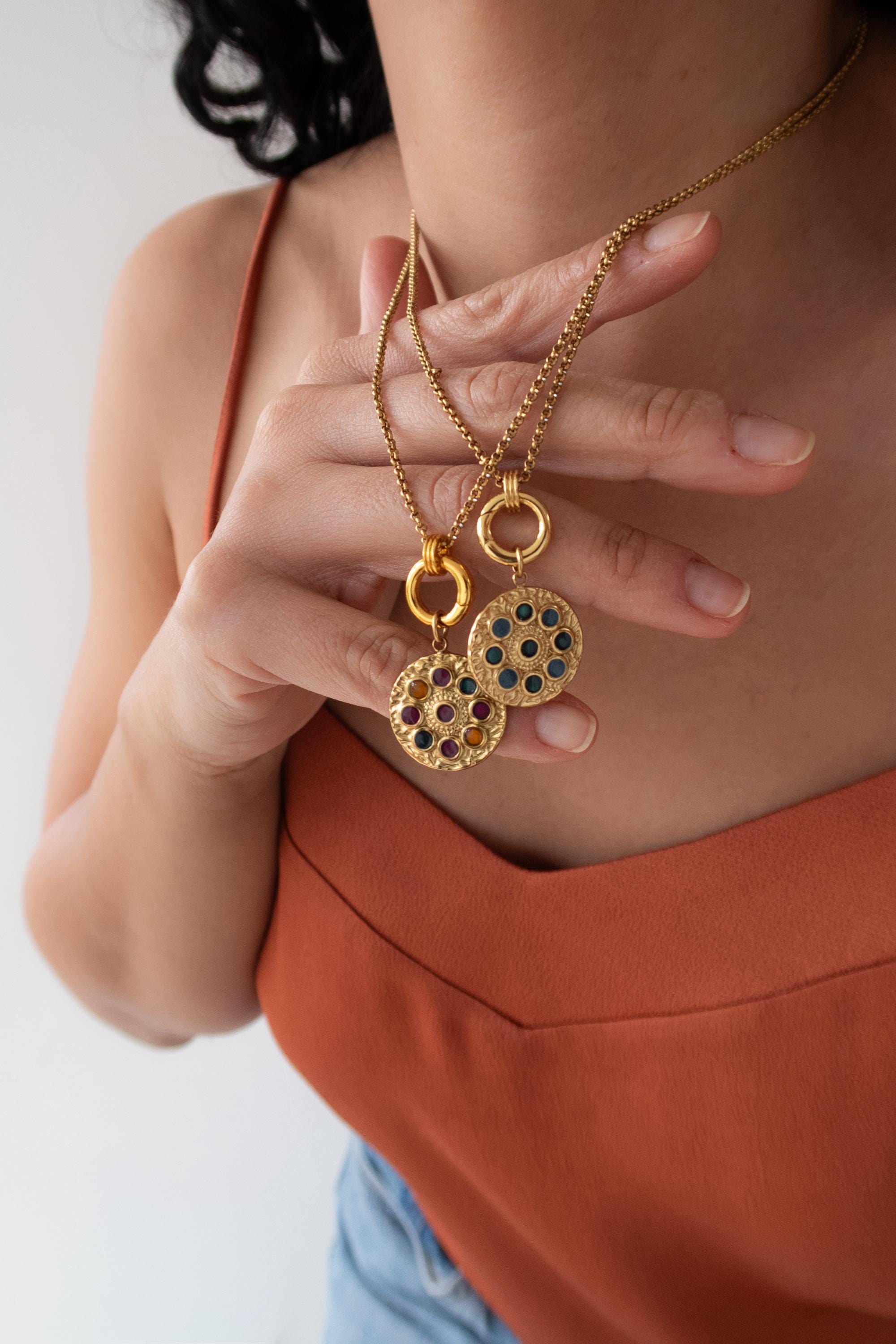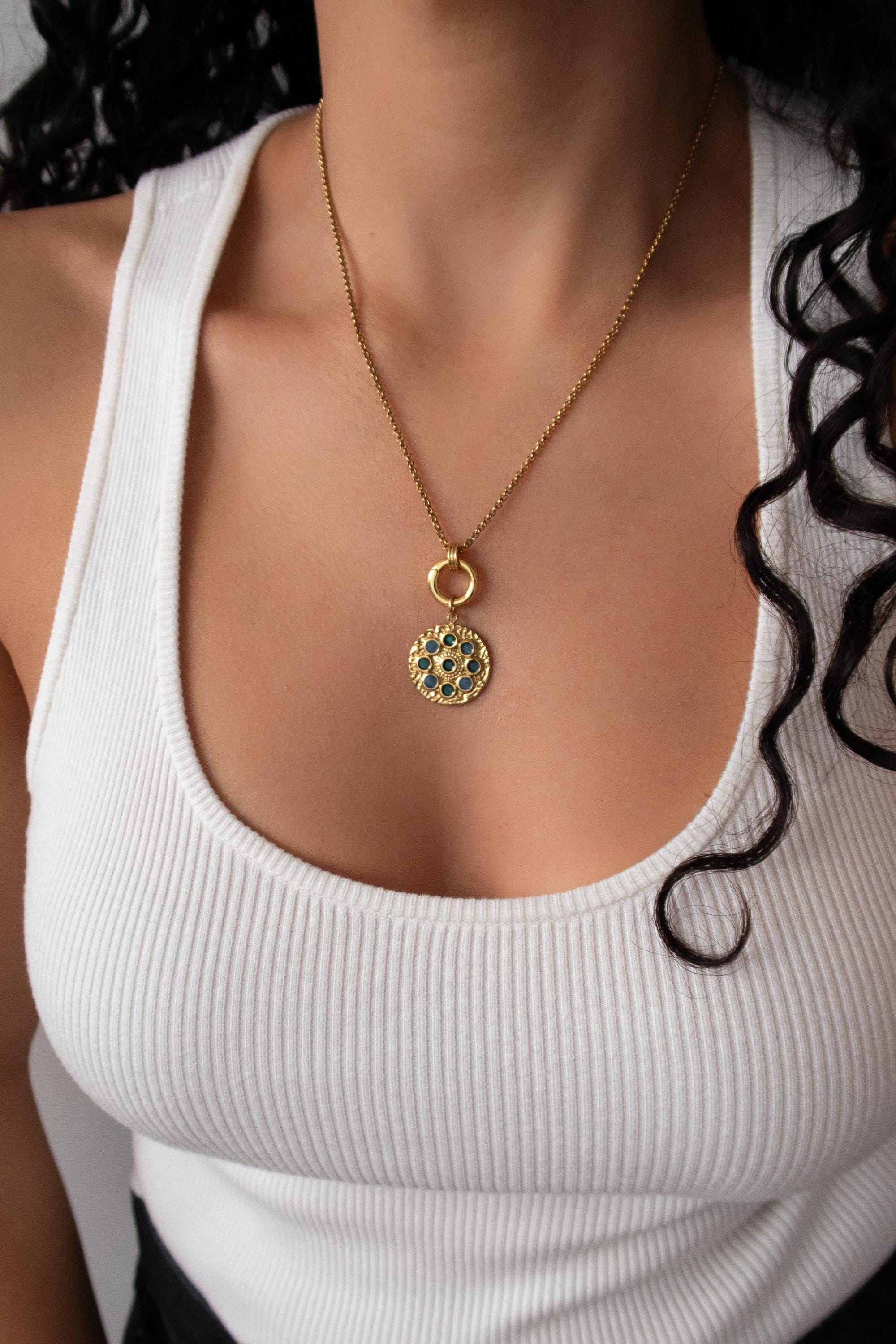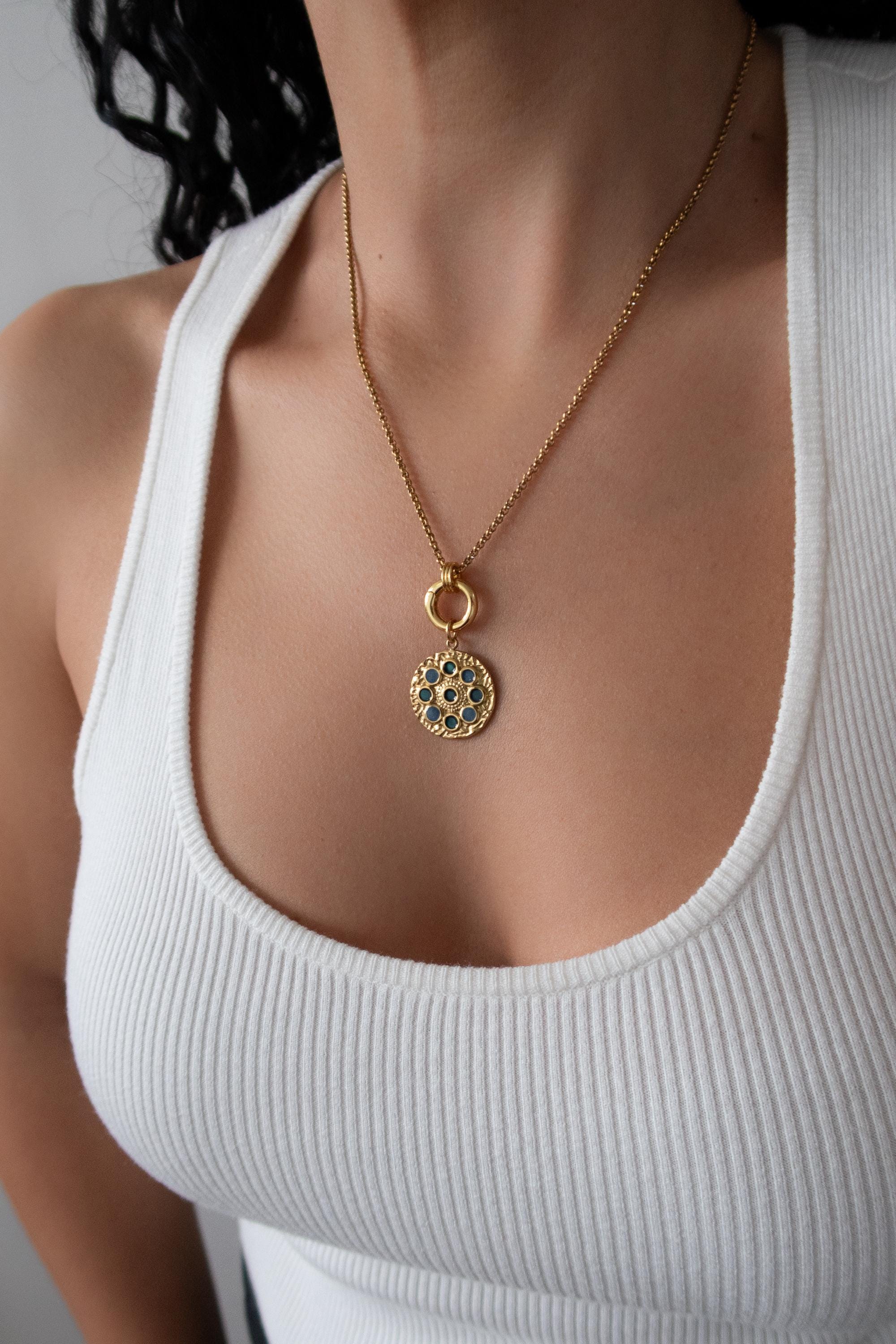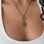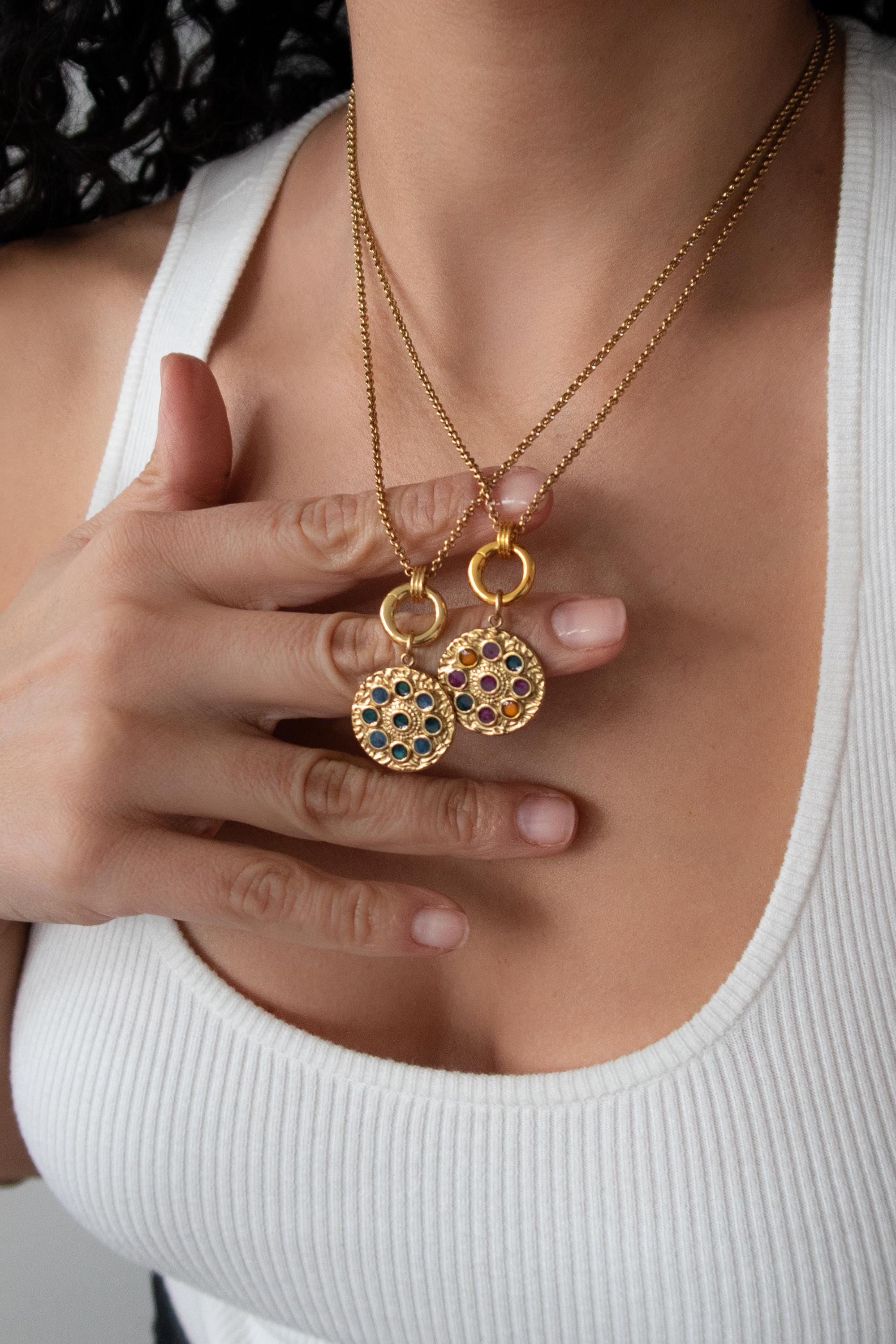 • Elegant circular pendant with subtle rhinestone detail • Gold-tone chain with front clasp • Interchangeable charm design • Evil eye charm as shown • Additional charms can be added or removed • Lightweight and comfortable for daily wear
