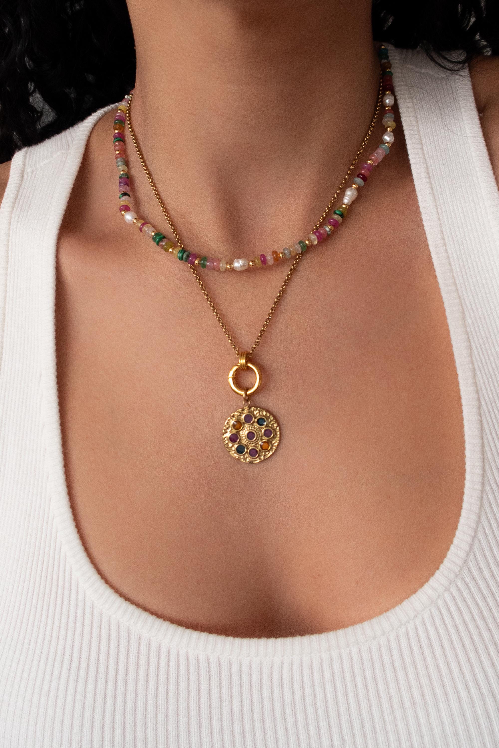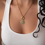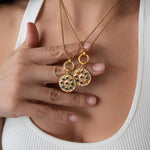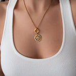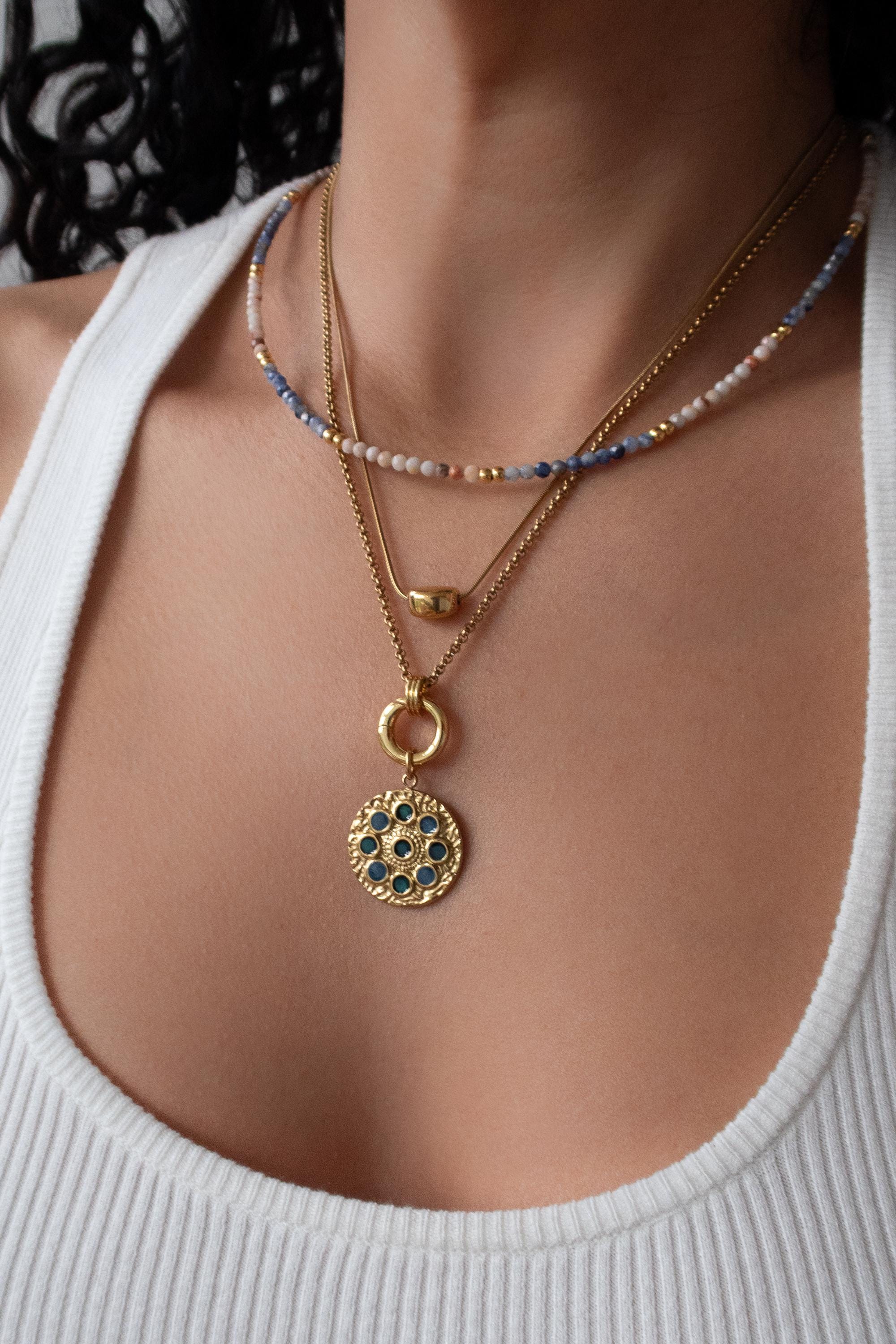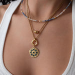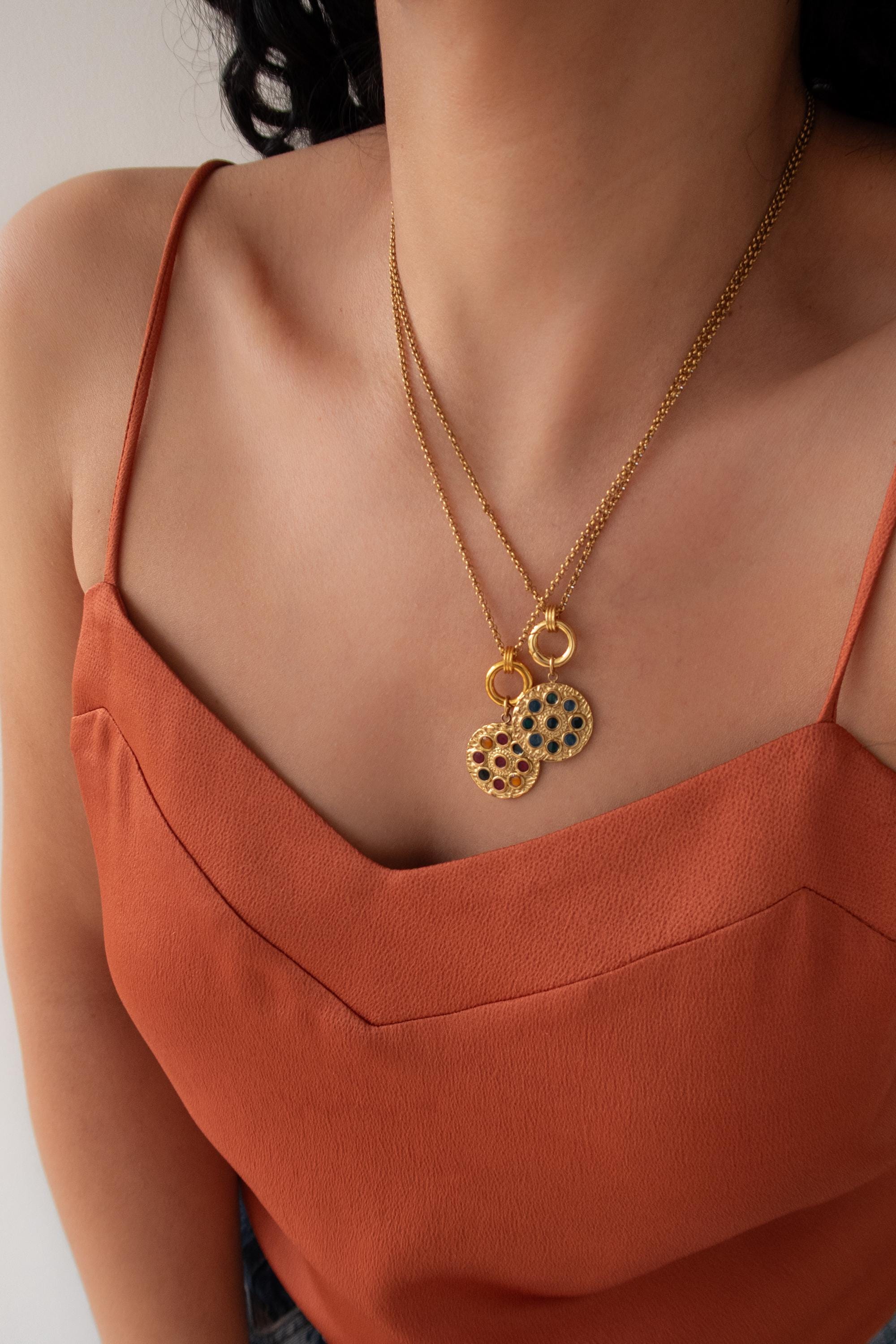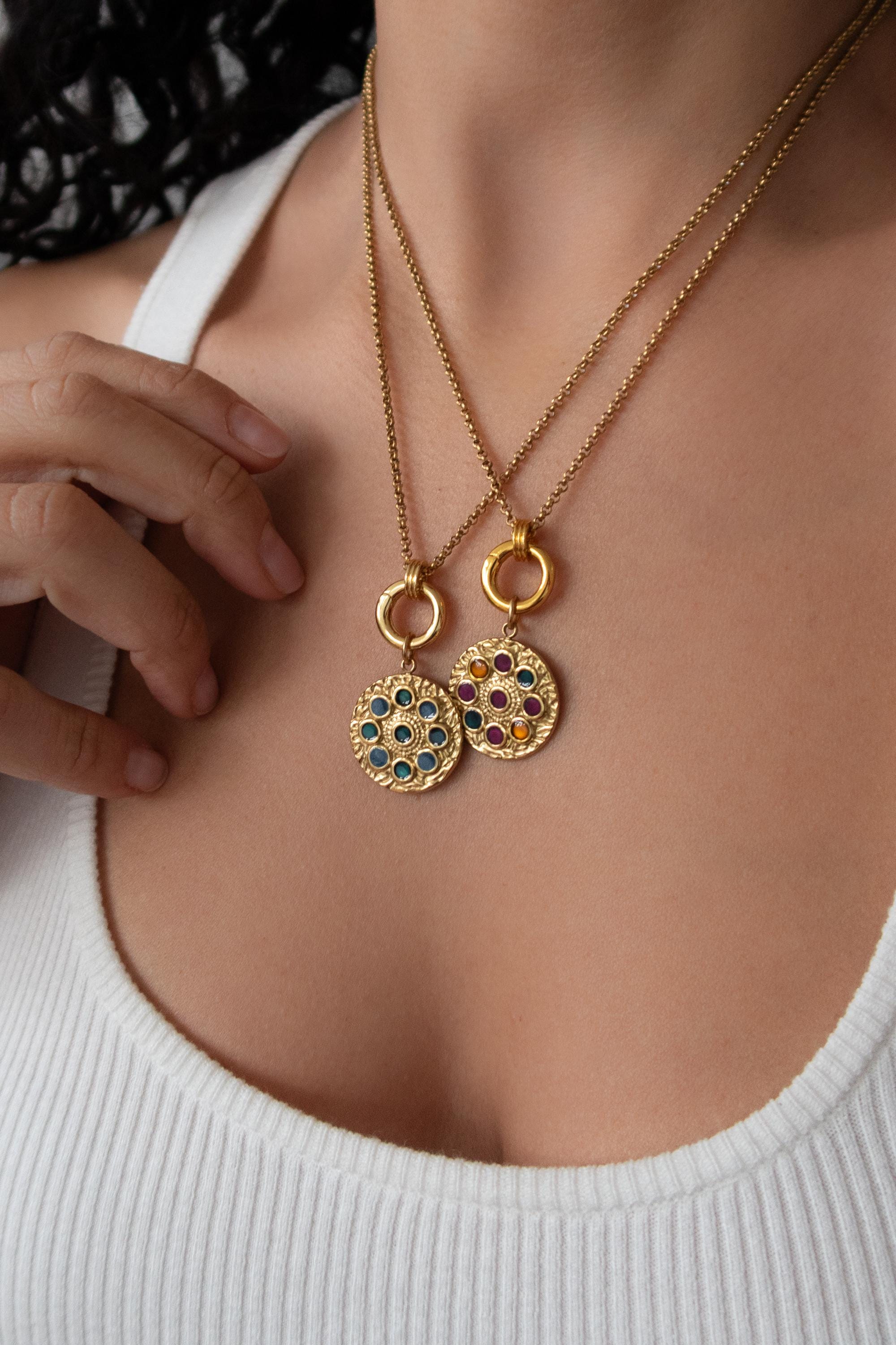 • Elegant circular pendant with subtle rhinestone detail • Gold-tone chain with front clasp • Interchangeable charm design • Evil eye charm as shown • Additional charms can be added or removed • Lightweight and comfortable for daily wear