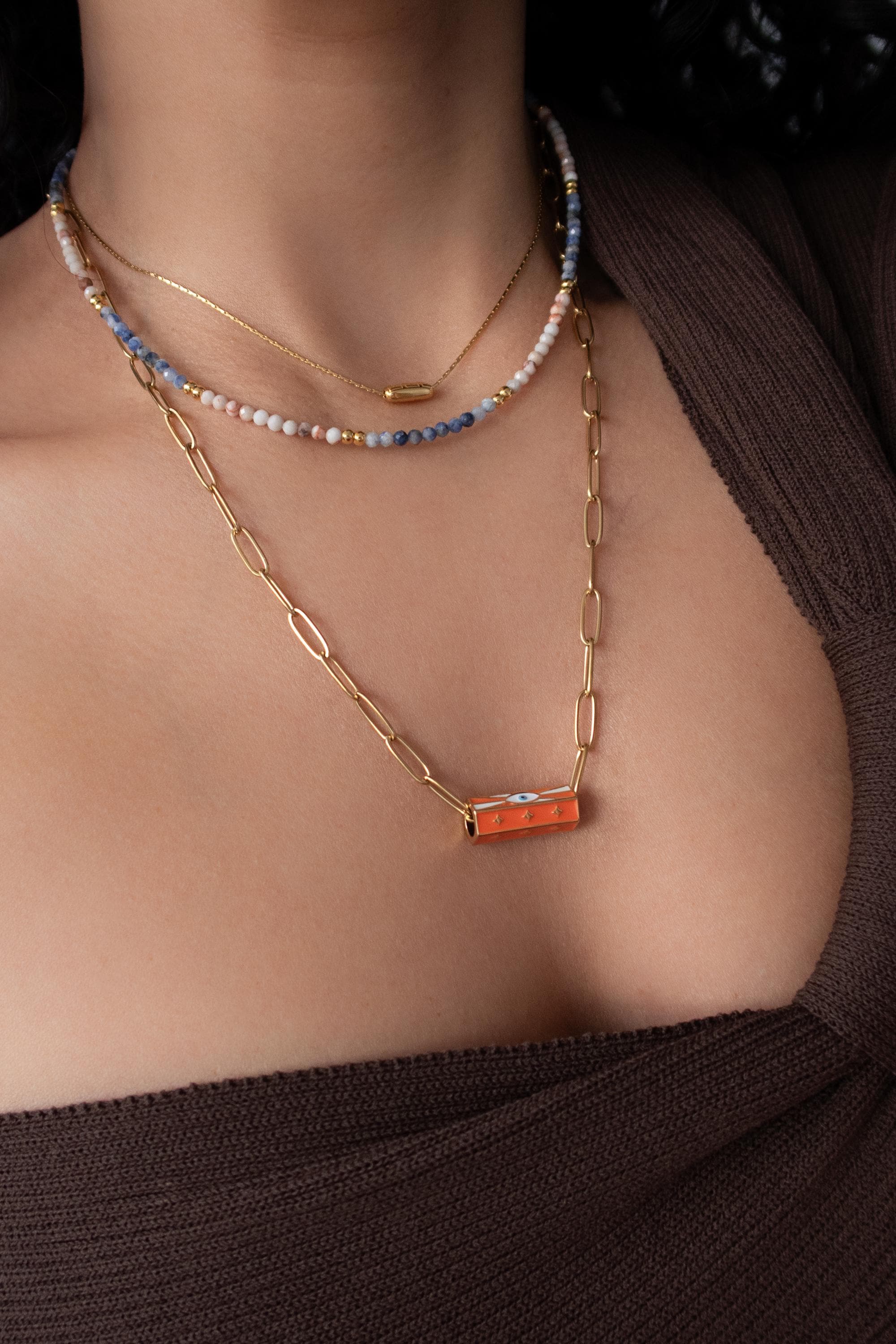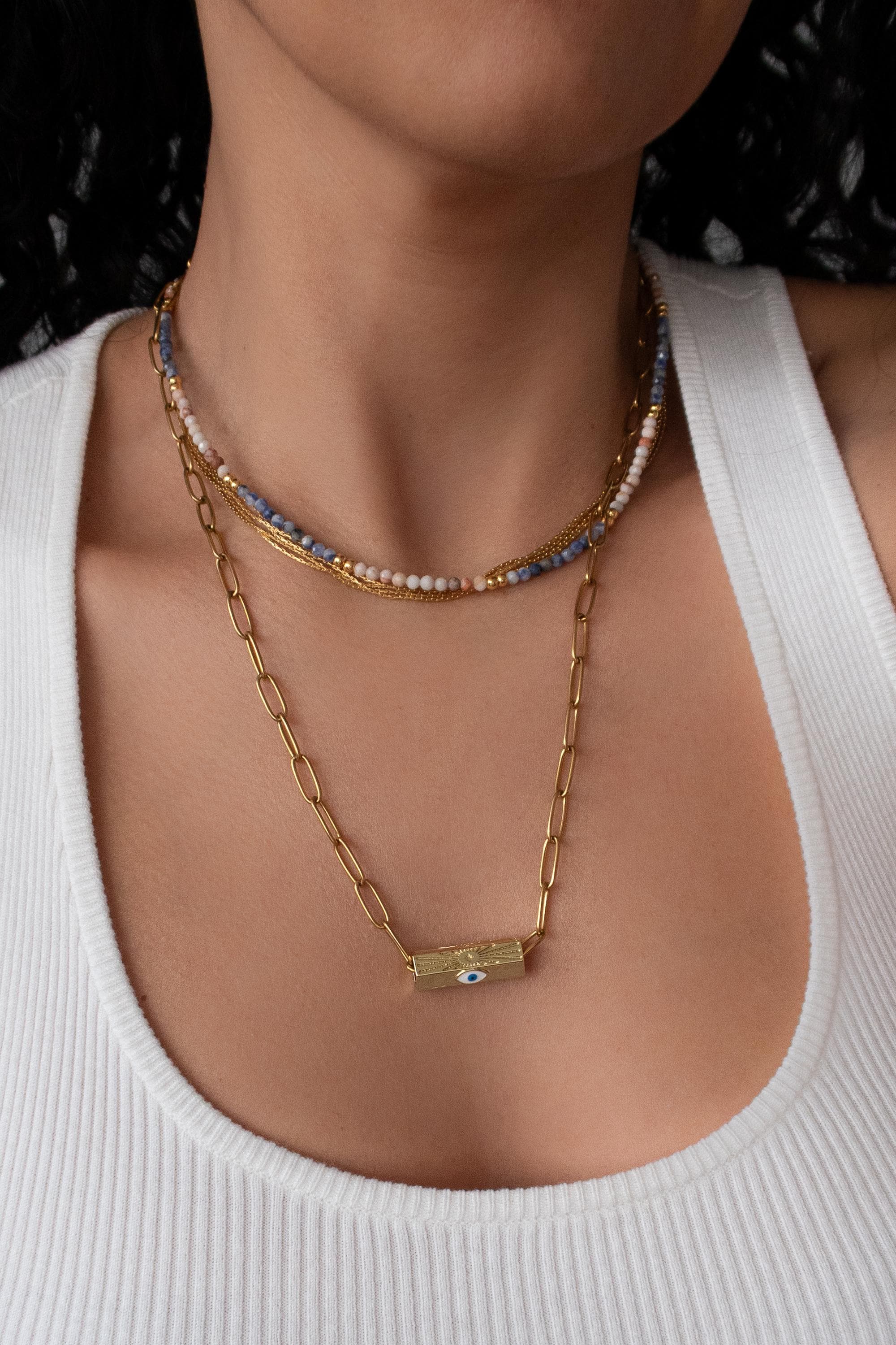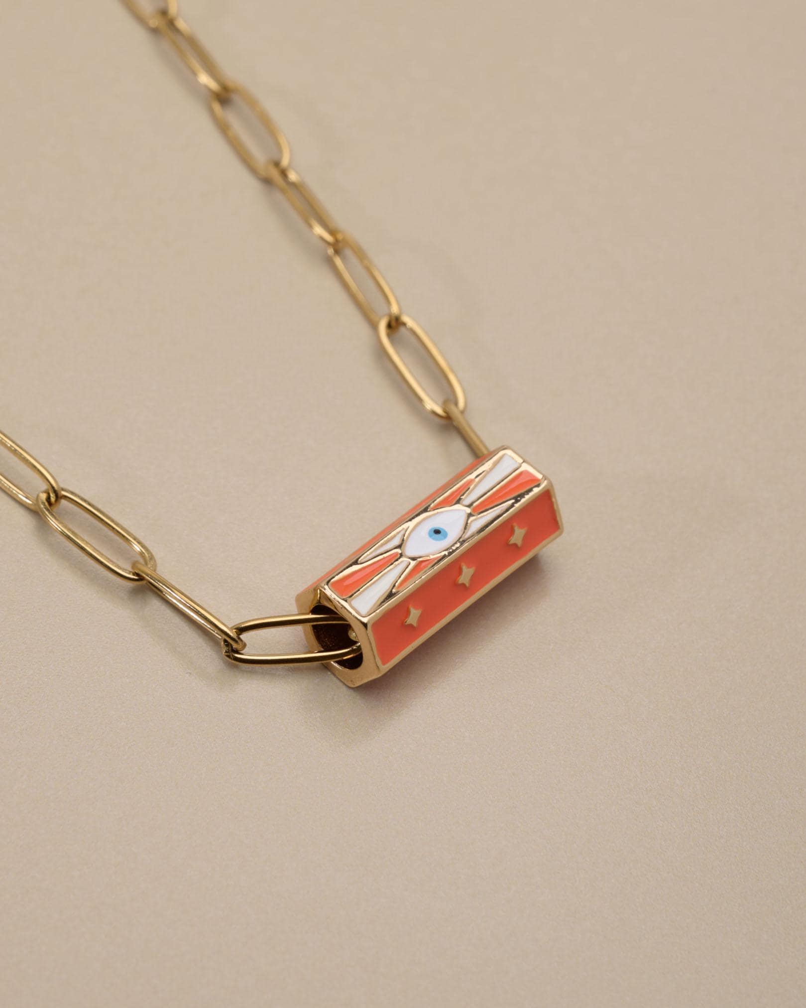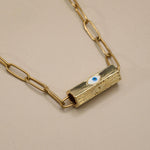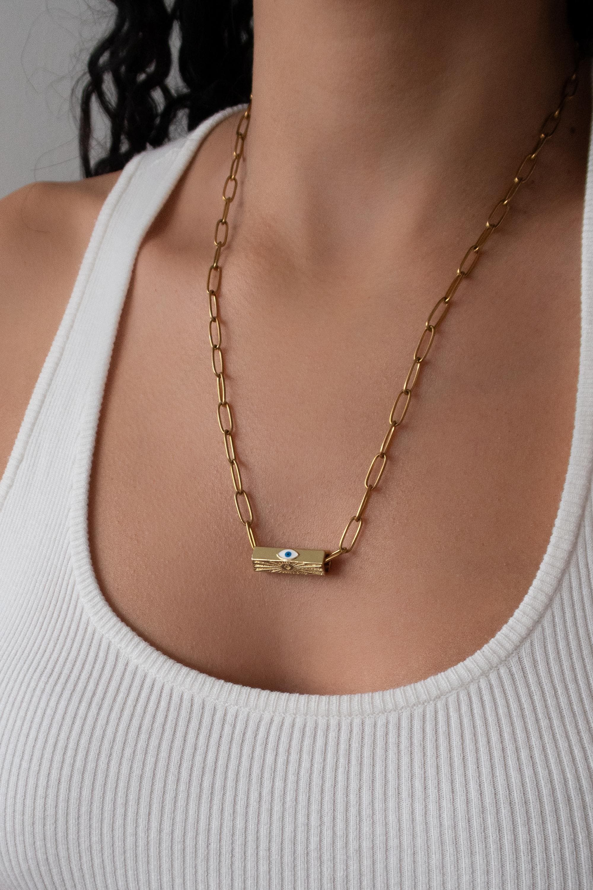 This gold 316L stainless steel evil eye necklace features a modern barrel-shaped pendant with enamel detailing. Designed with an adjustable chain up to 57cm, it can be styled as a statement piece or layered with other chains.