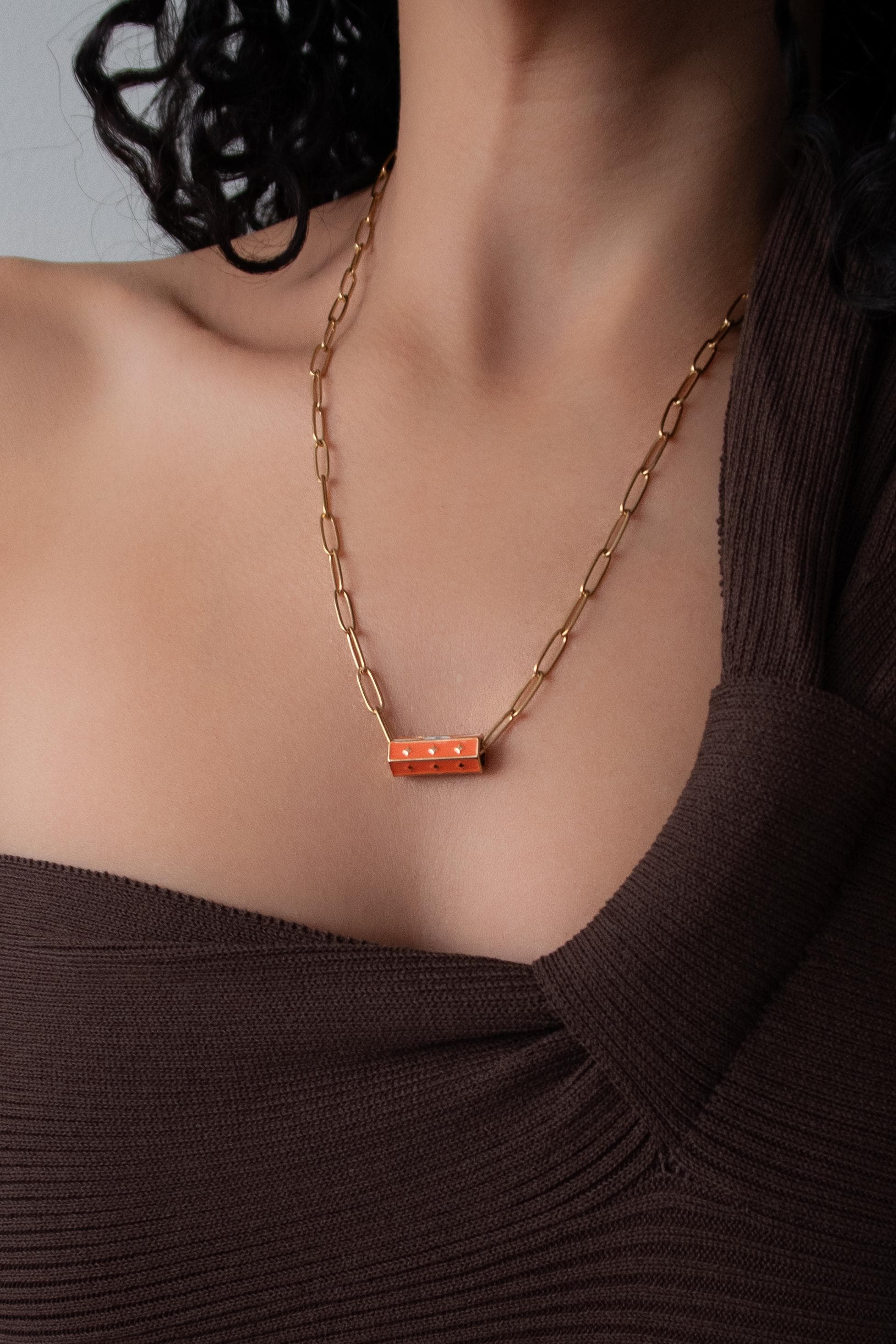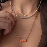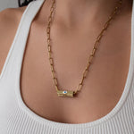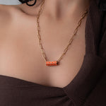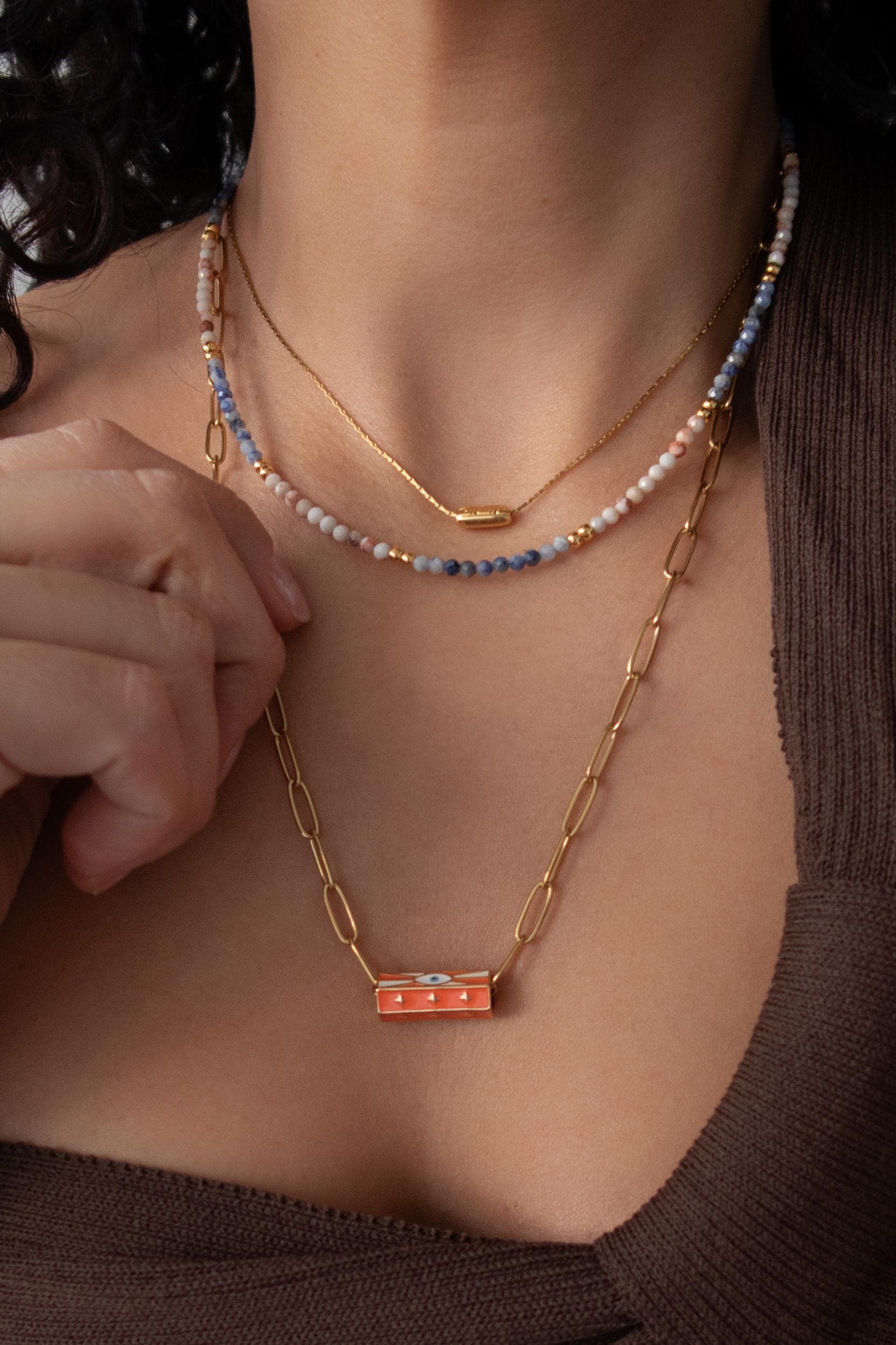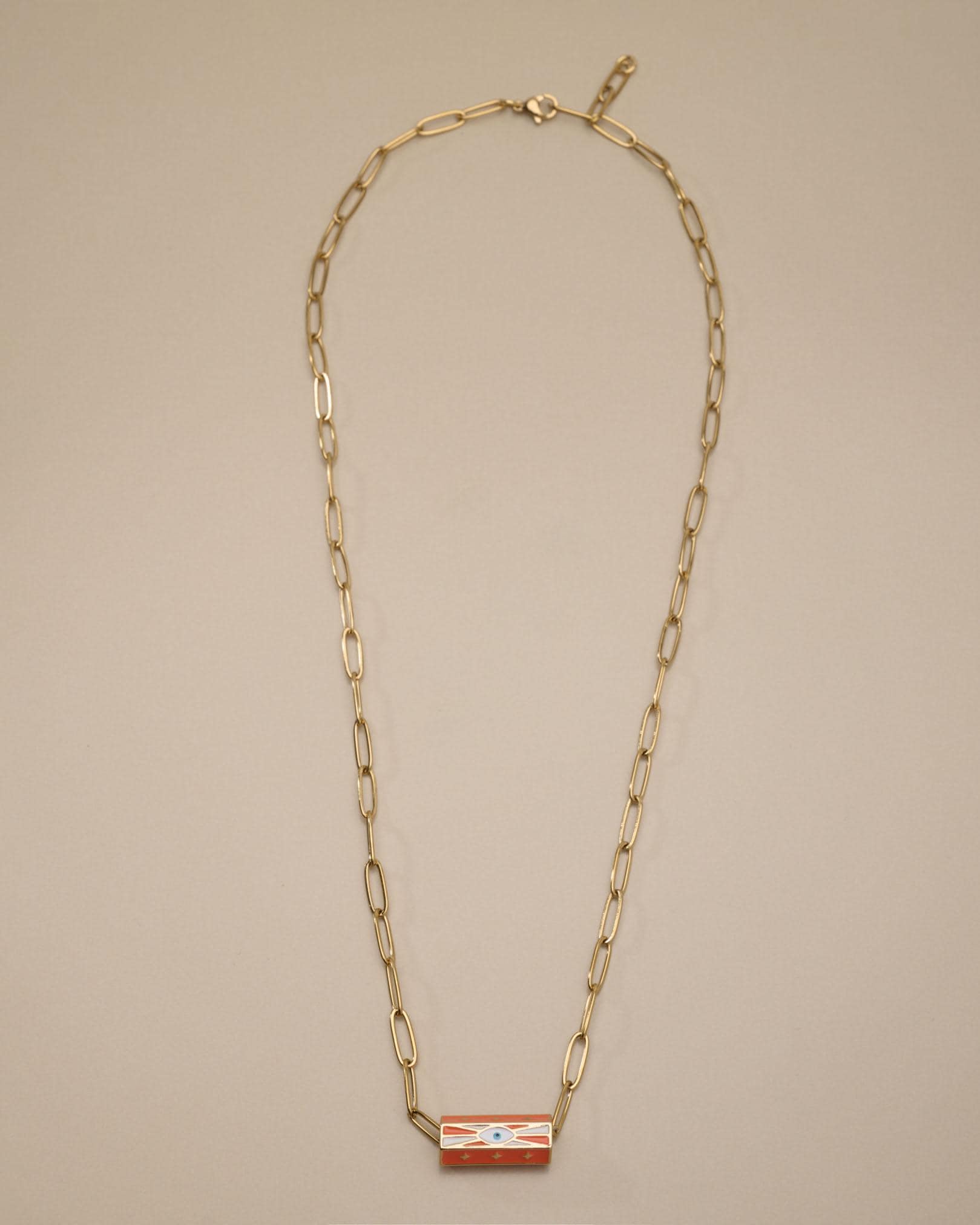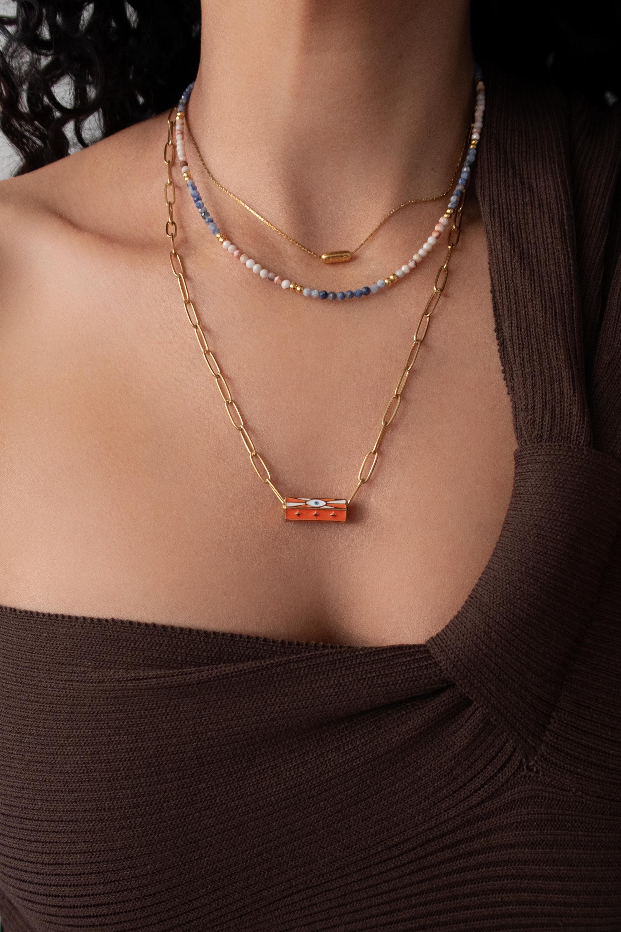 This gold 316L stainless steel evil eye necklace features a modern barrel-shaped pendant with enamel detailing. Designed with an adjustable chain up to 57cm, it can be styled as a statement piece or layered with other chains.