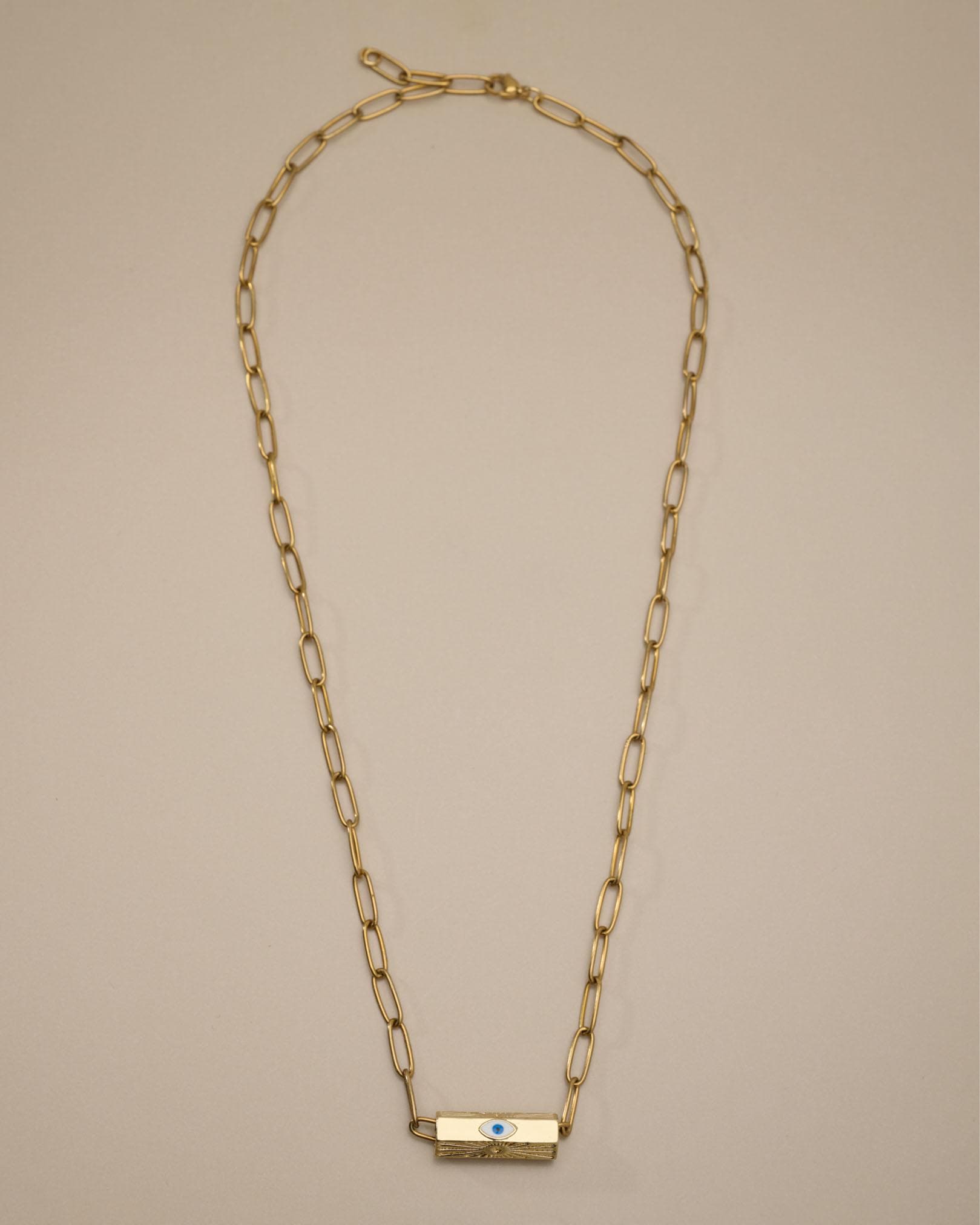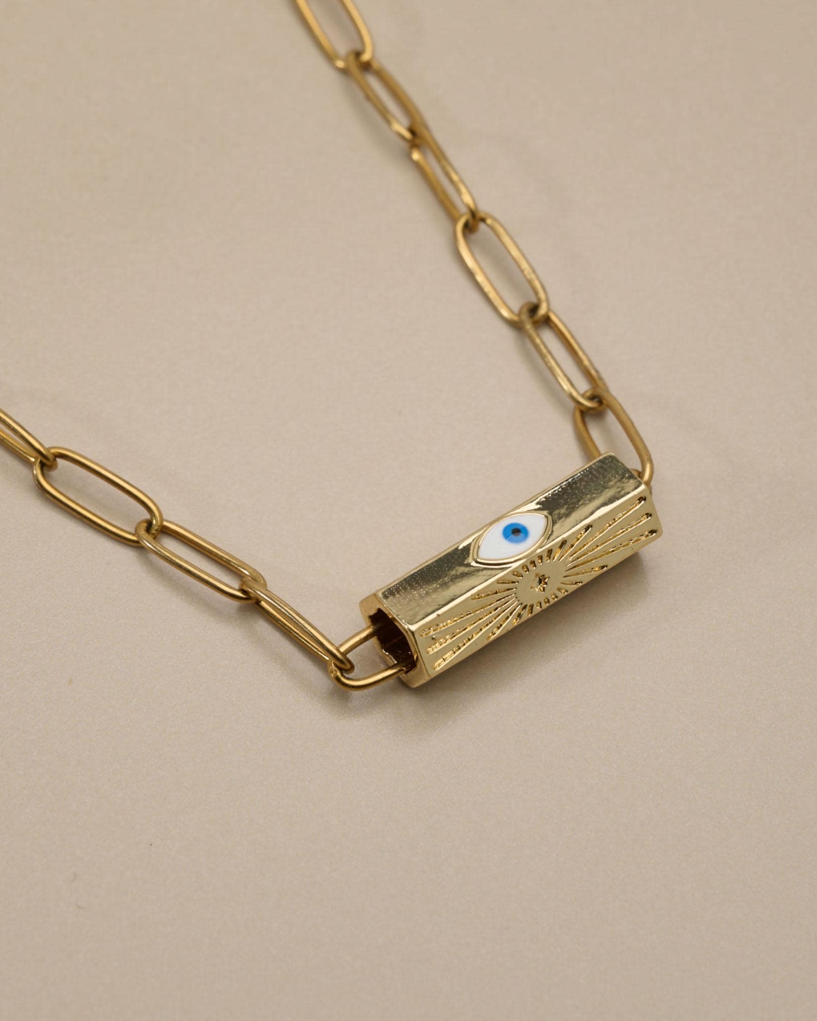 Waterproof, tarnish-free, and hypoallergenic, this necklace is made for everyday wear. The bold geometric form combined with the symbolic evil eye makes it a contemporary protection necklace with strong visual impact.