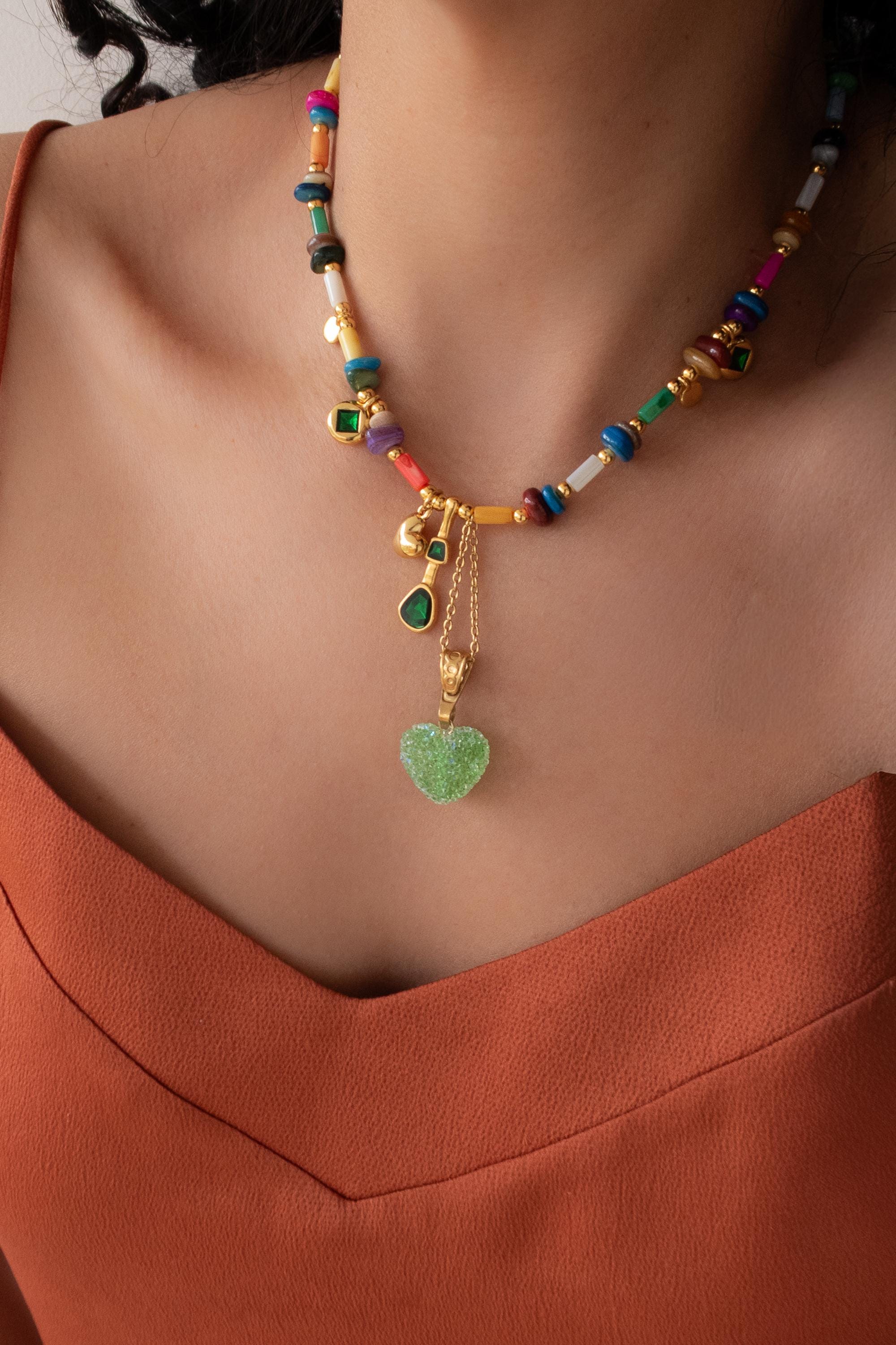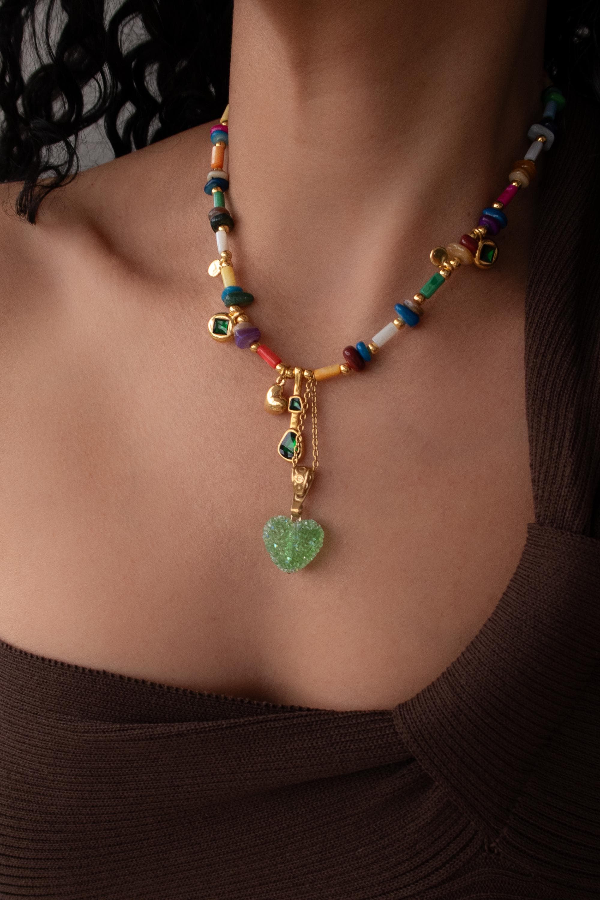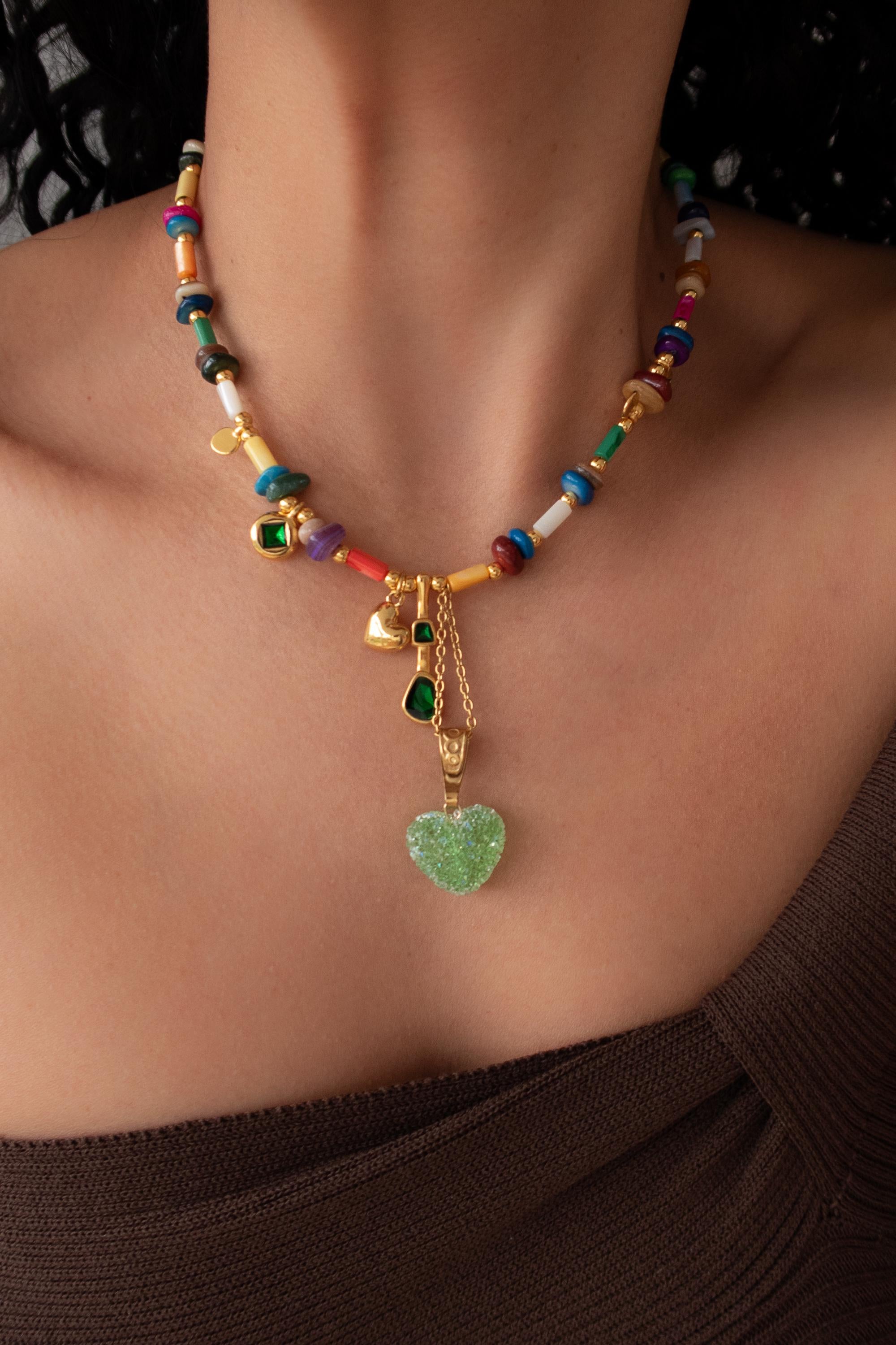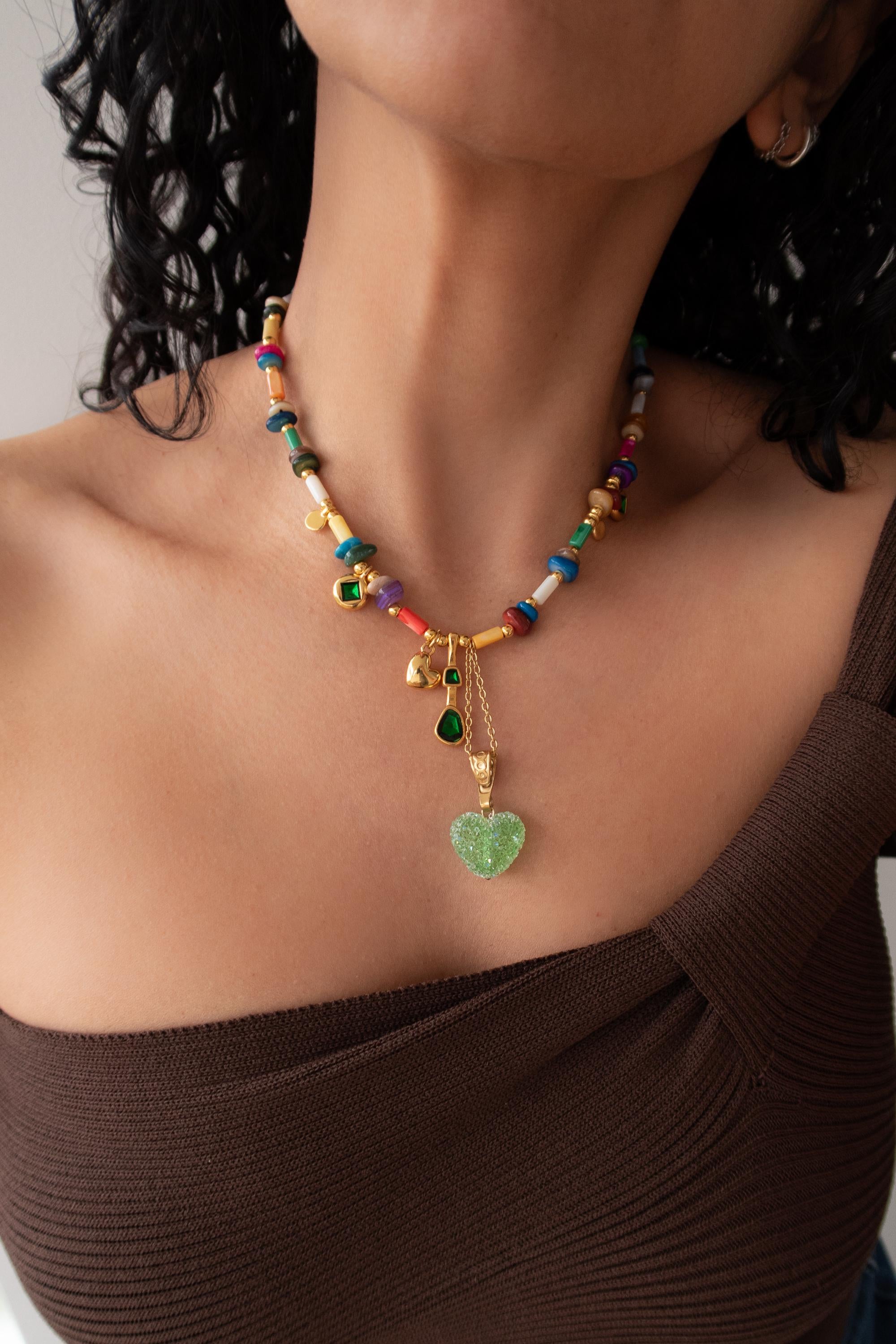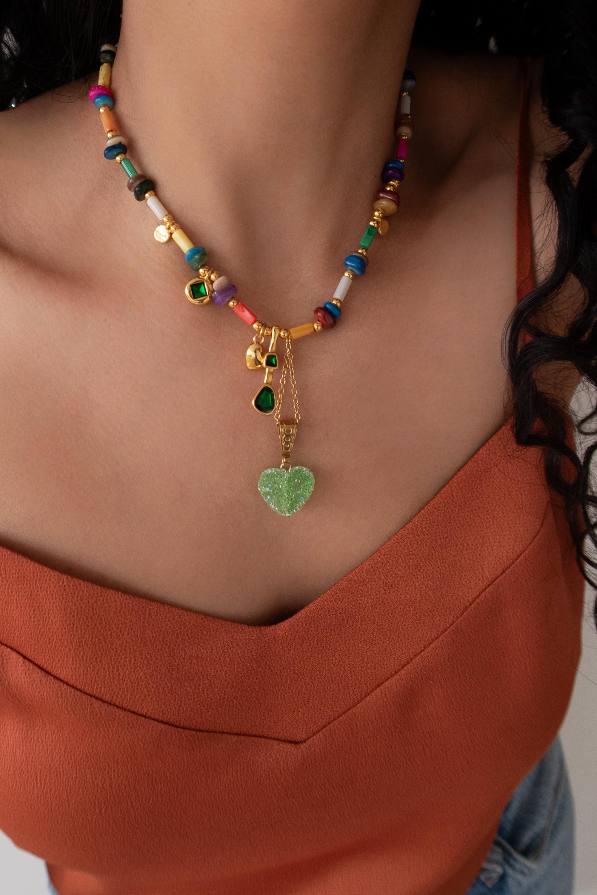 A joyful, statement necklace inspired by summer colours and playful Mediterranean energy. This piece combines natural shell elements with a bold green heart resin pendant, creating a vibrant yet wearable design that stands out beautifully on its own or layered with gold chains.