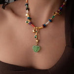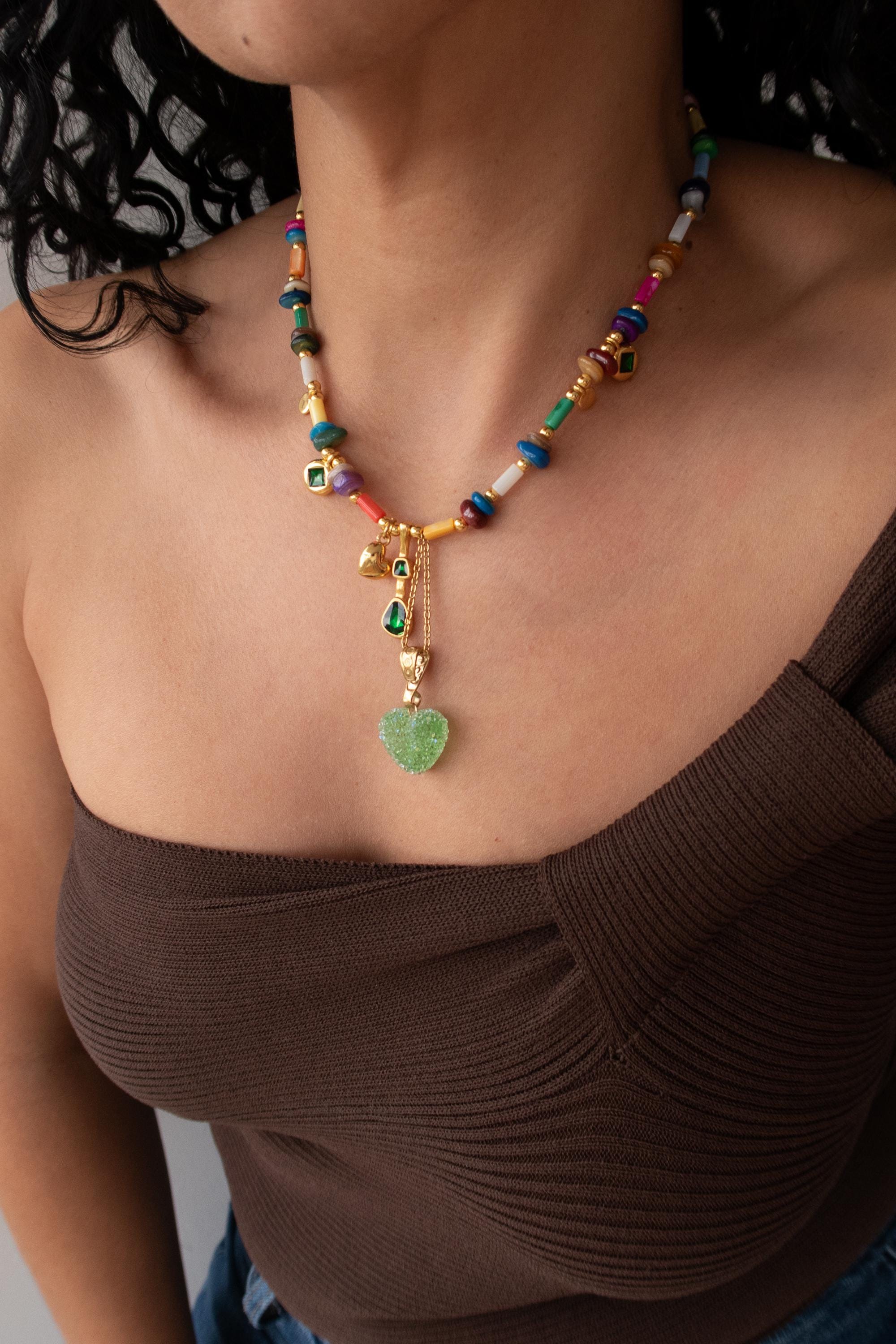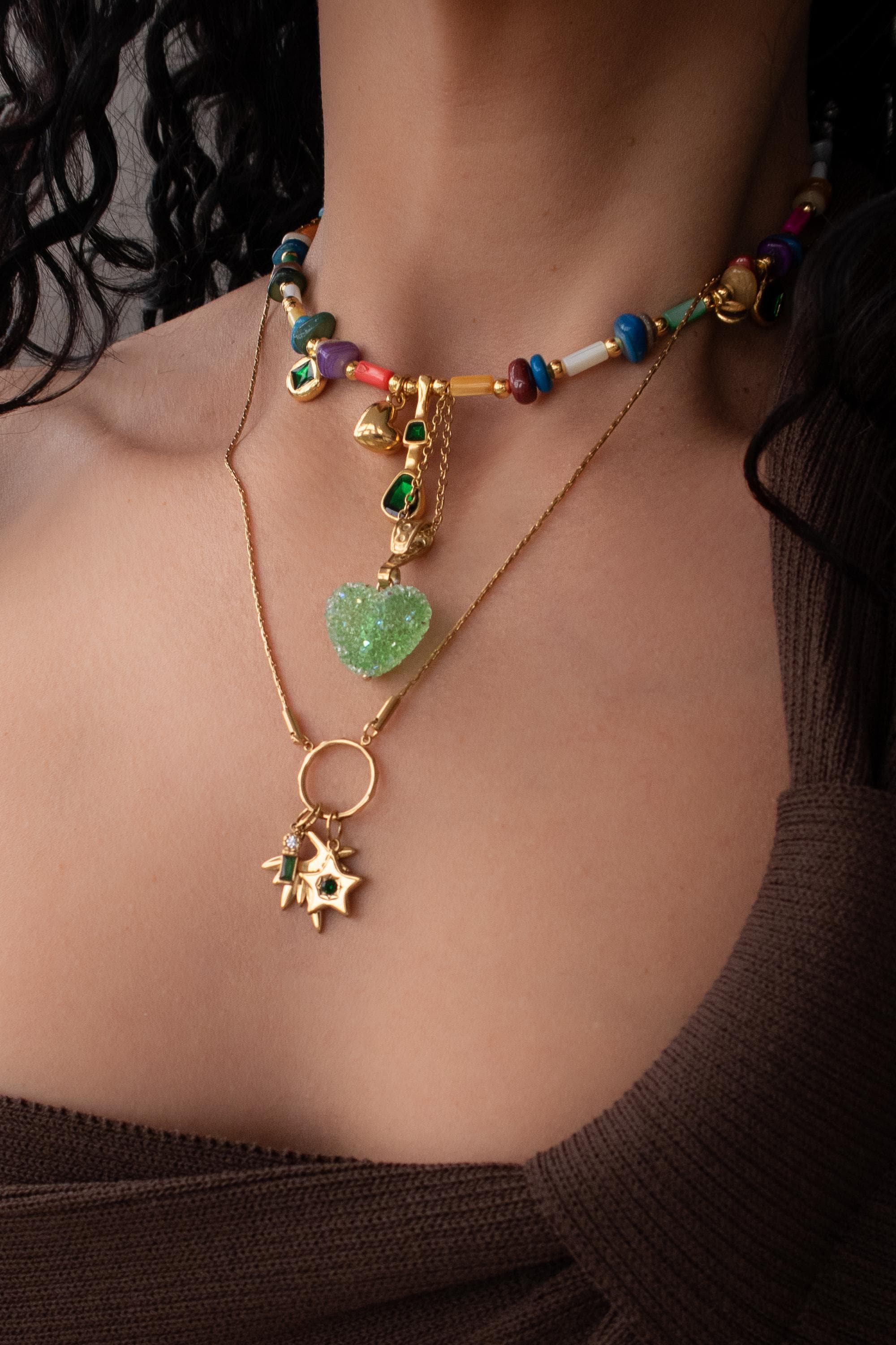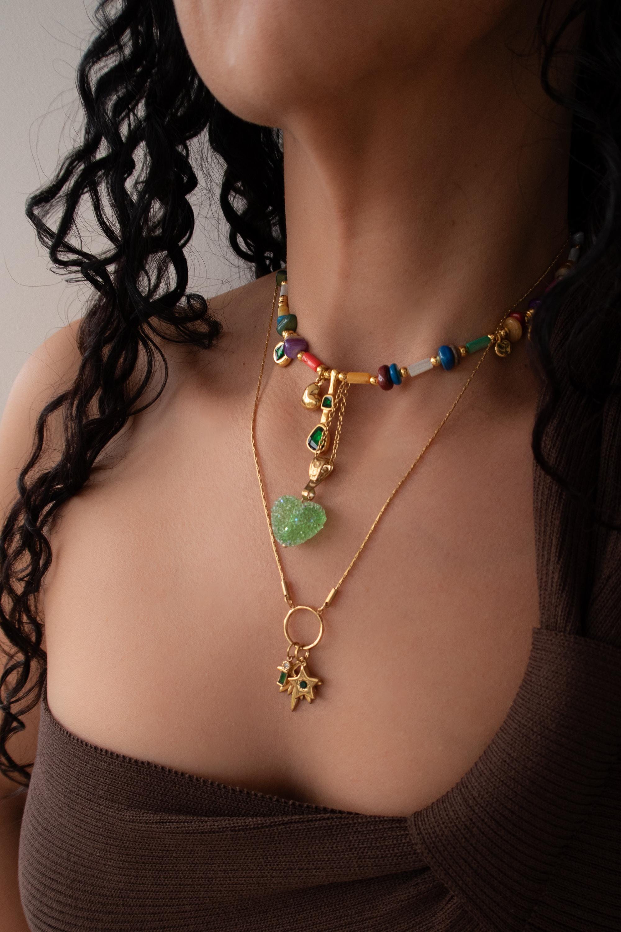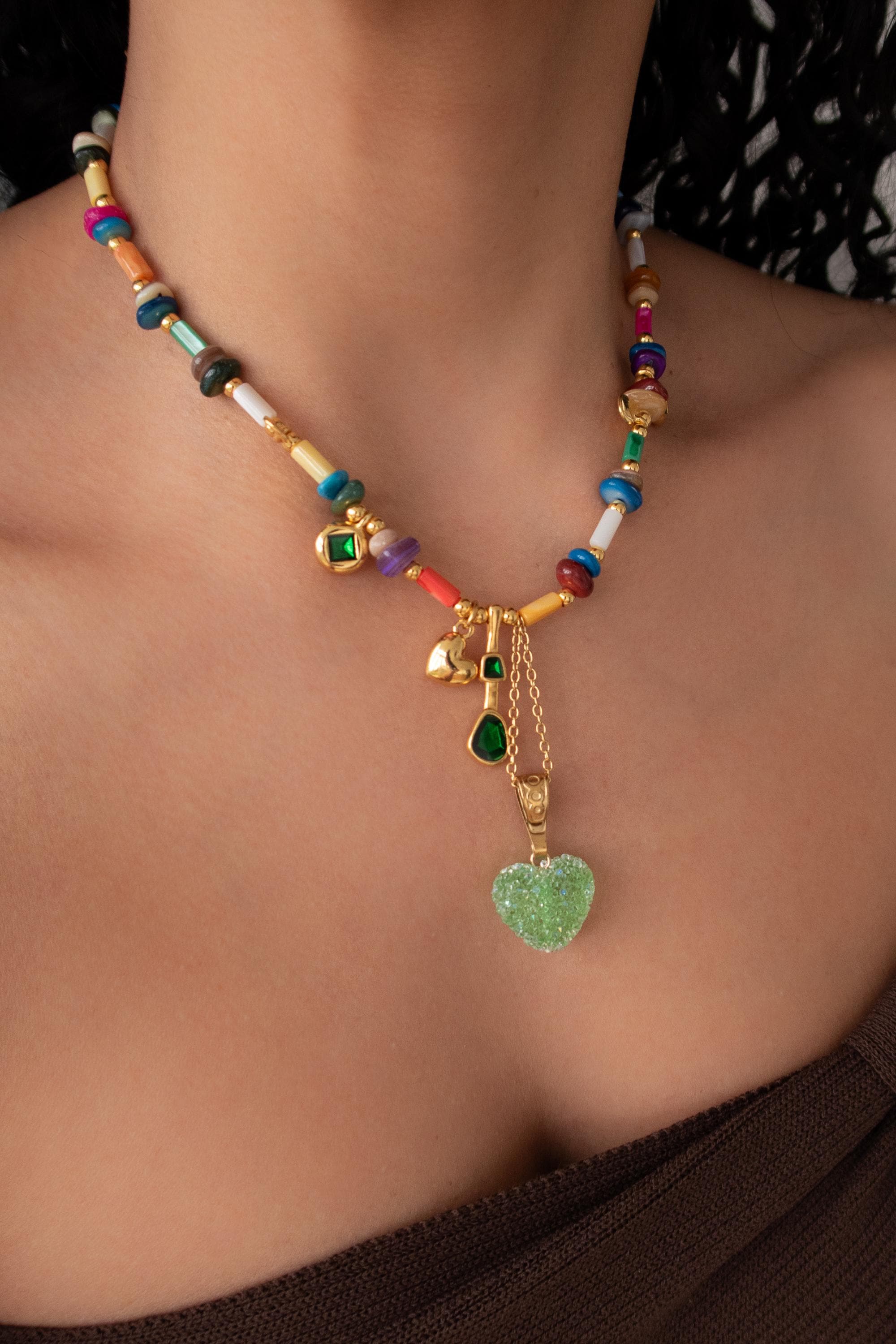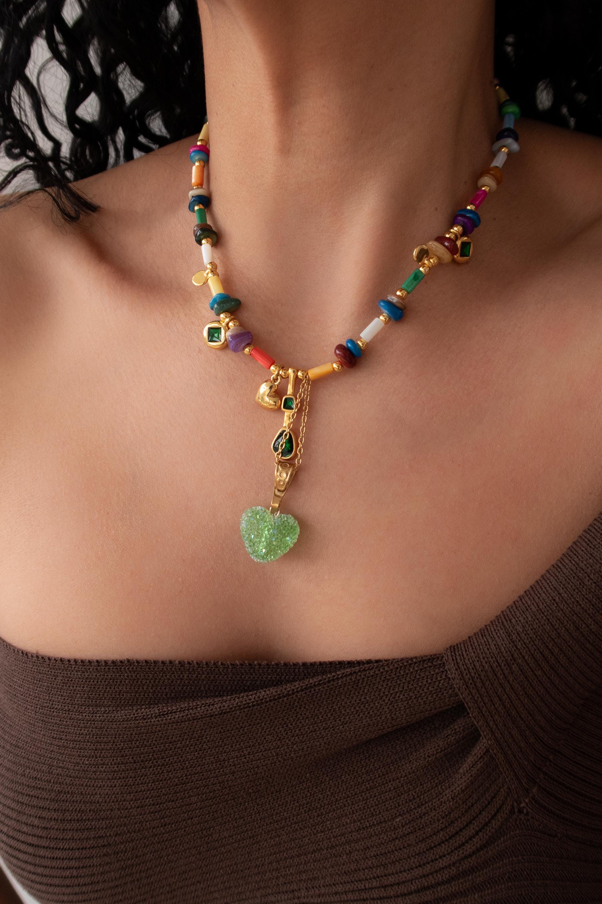 A joyful, statement necklace inspired by summer colours and playful Mediterranean energy. This piece combines natural shell elements with a bold green heart resin pendant, creating a vibrant yet wearable design that stands out beautifully on its own or layered with gold chains.