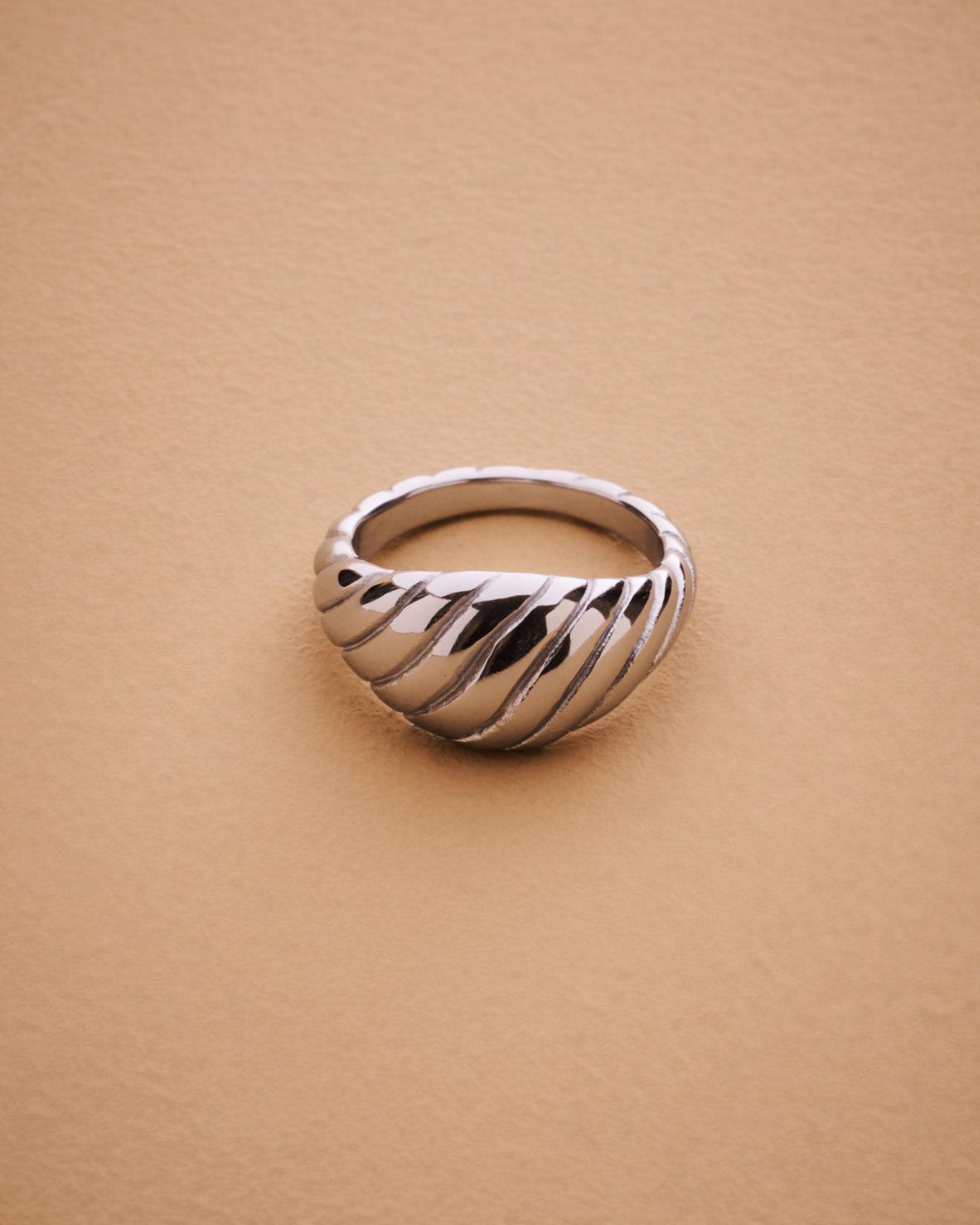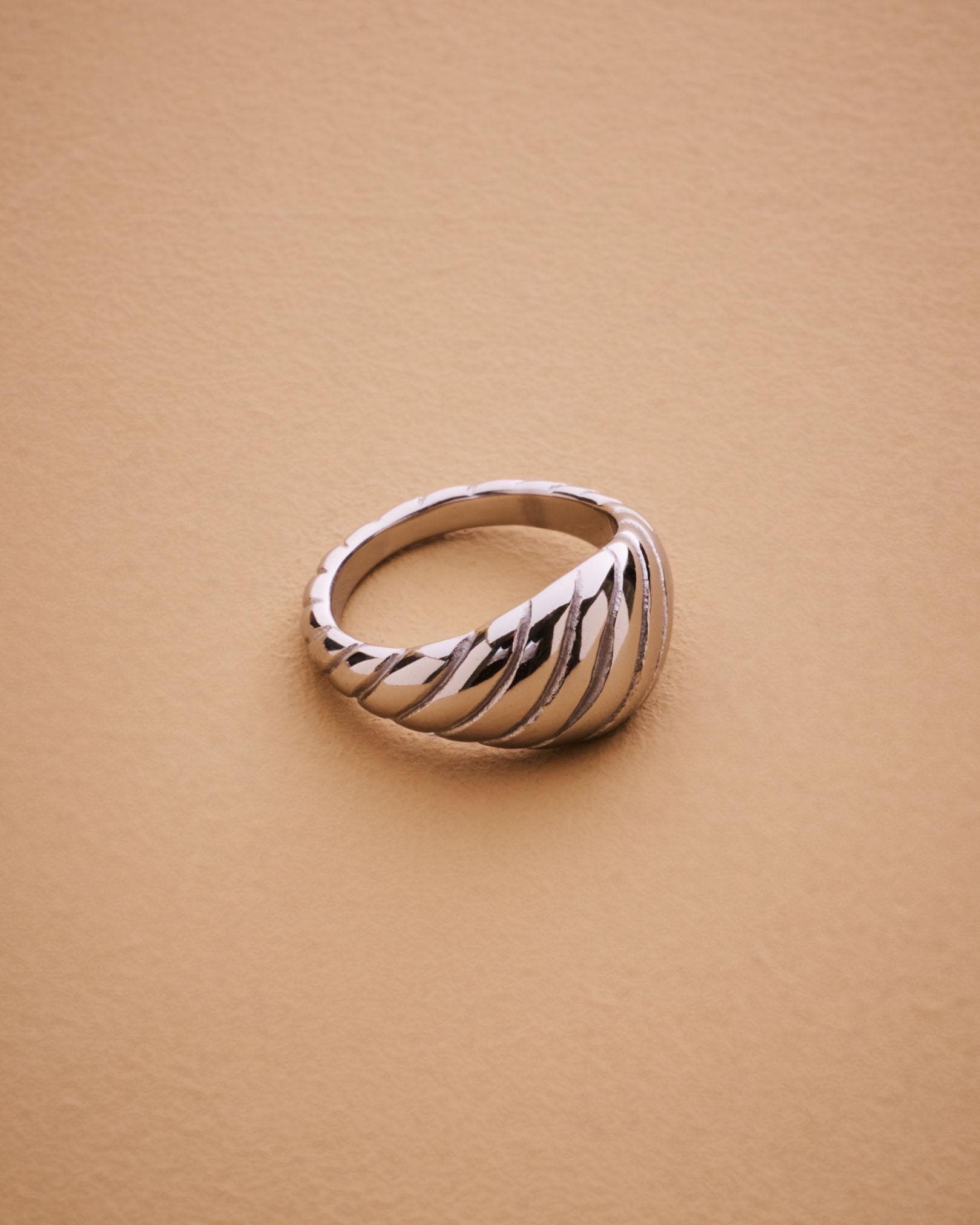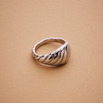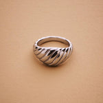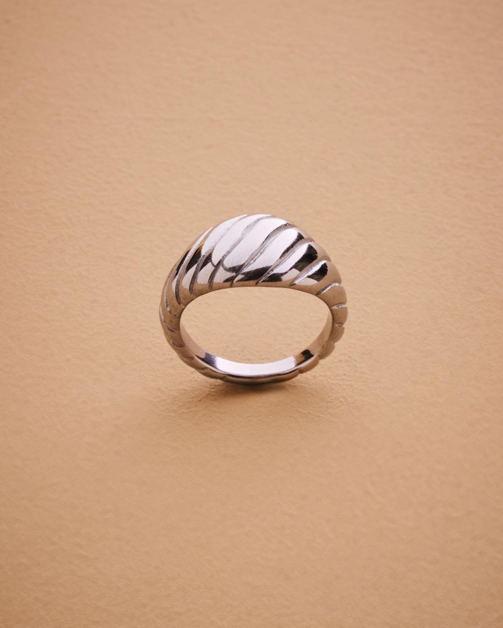 This silver croissant ring blends modern design with timeless simplicity. The ribbed dome shape gives it a sculptural look that shines from every angle.Crafted from polished stainless steel, it’s waterproof, hypoallergenic, and built to last — perfect for everyday wear or special occasions. Its clean, minimalist silhouette makes it an easy-to-style statement piece that complements any outfit.A modern classic, the silver croissant ring adds effortless sophistication to your jewelry rotation.MEASUREMENTS AND SIZE
