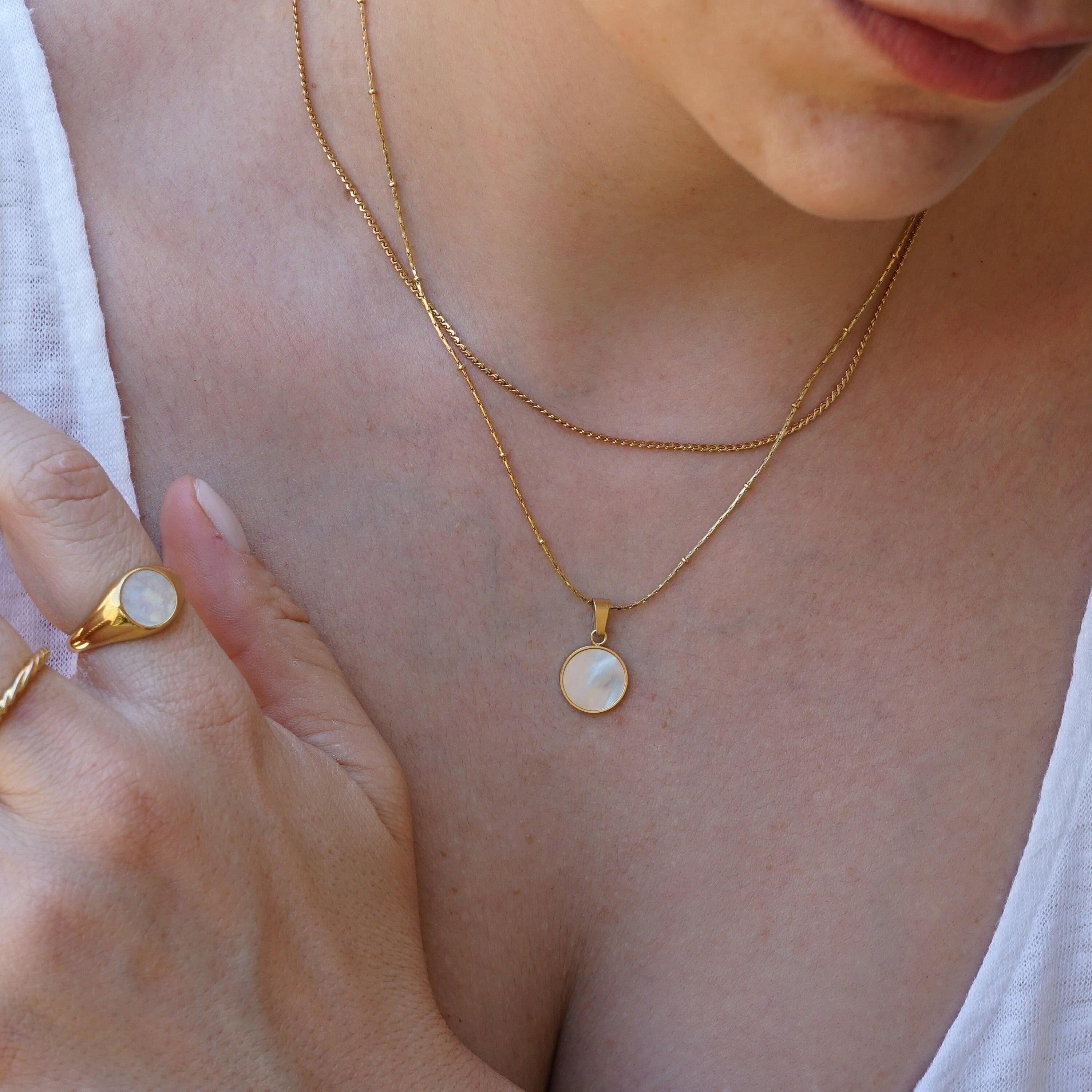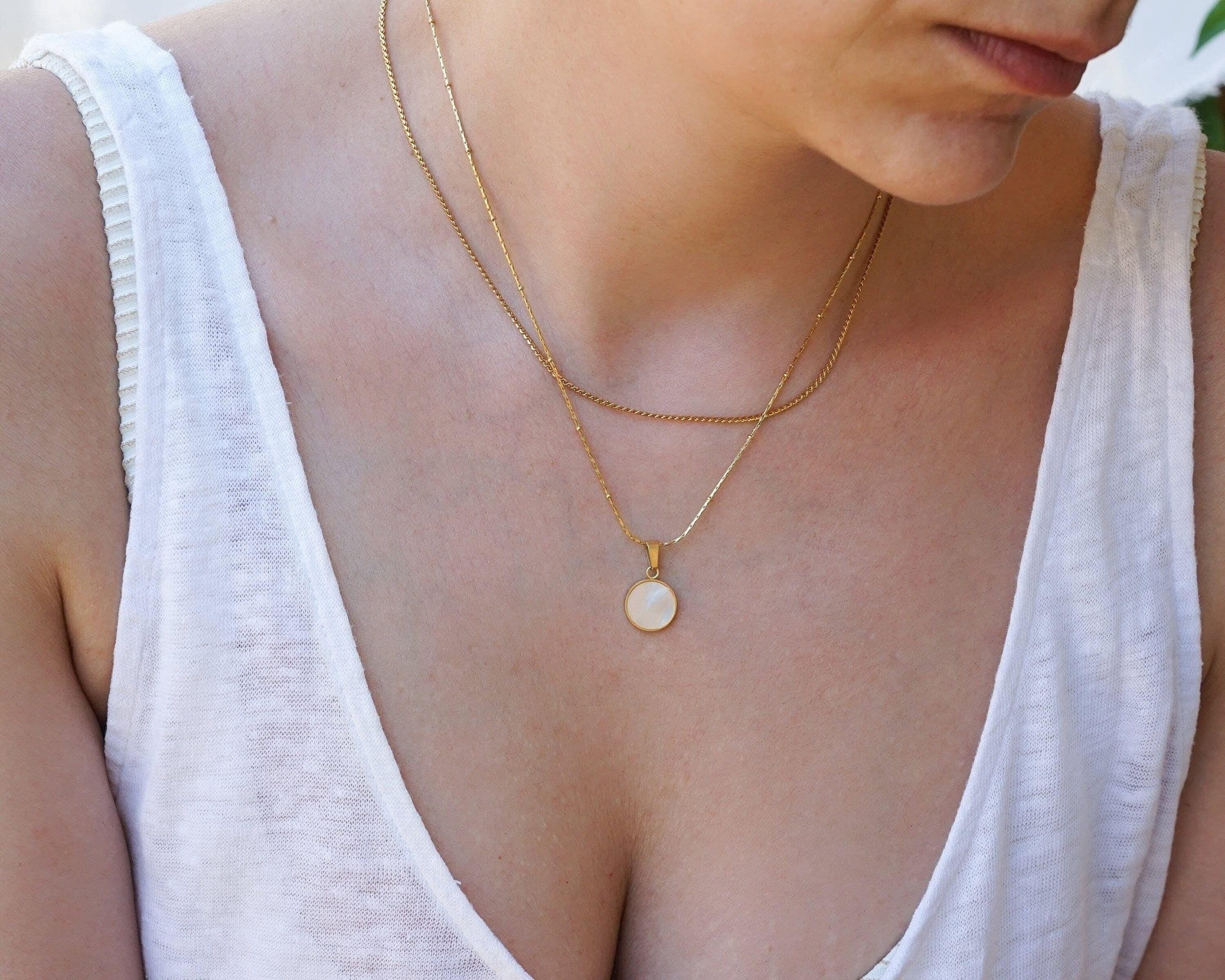 As a key element of today’s fashion trends, layered necklaces are a must-have for your collection. This design combines chains and links of varying sizes, creating a chic and contemporary aesthetic that’s perfect for any occasion. The interplay of thick and thin chains, along with the delicate shell charms, offers a refined look that can enhance any outfit throughout the seasons.